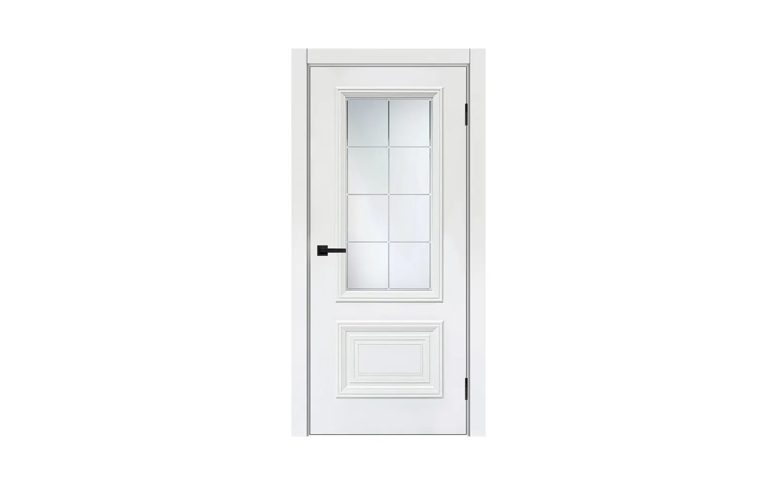 • Данная дверь окрашенная белой эмалью. Багет фигурный литой.Стекло белое матовое с алмазной гравировкой.