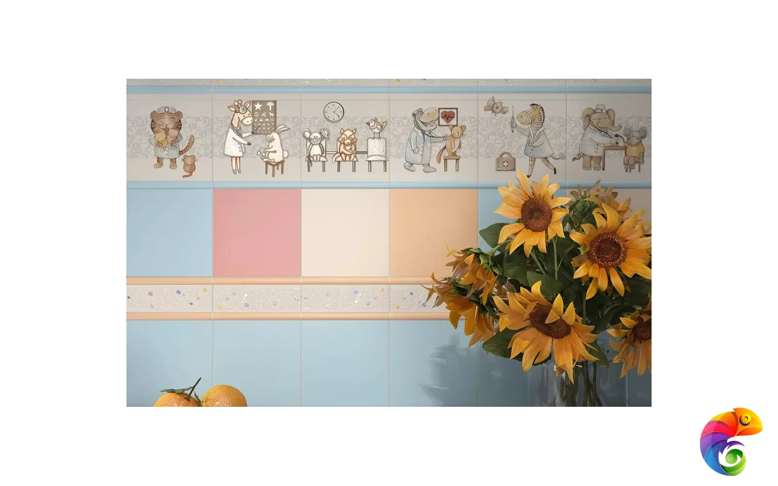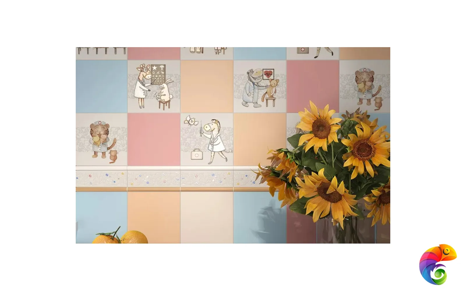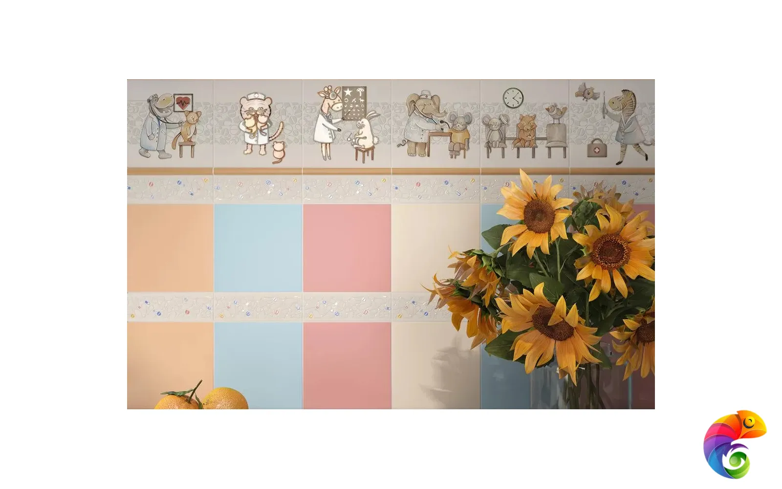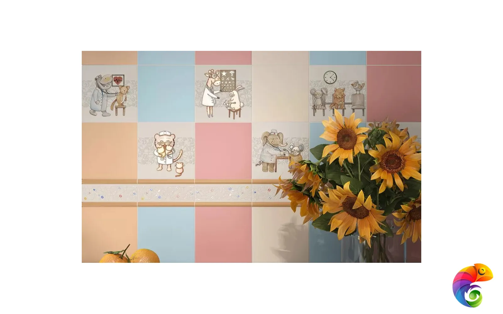 Шесть рисованных сюжетов отлично дополнят фоновую плитку в семейной клинике или детском медучреждении. Для придания изображениям дополнительного блеска и объёма использован прозрачный состав, создающий поверх рисунка толстый слой глазури.