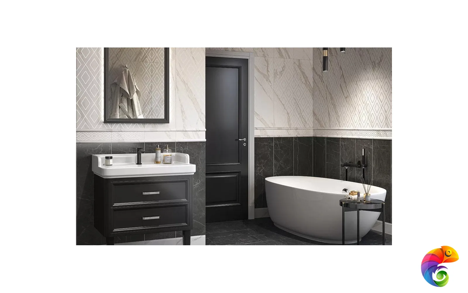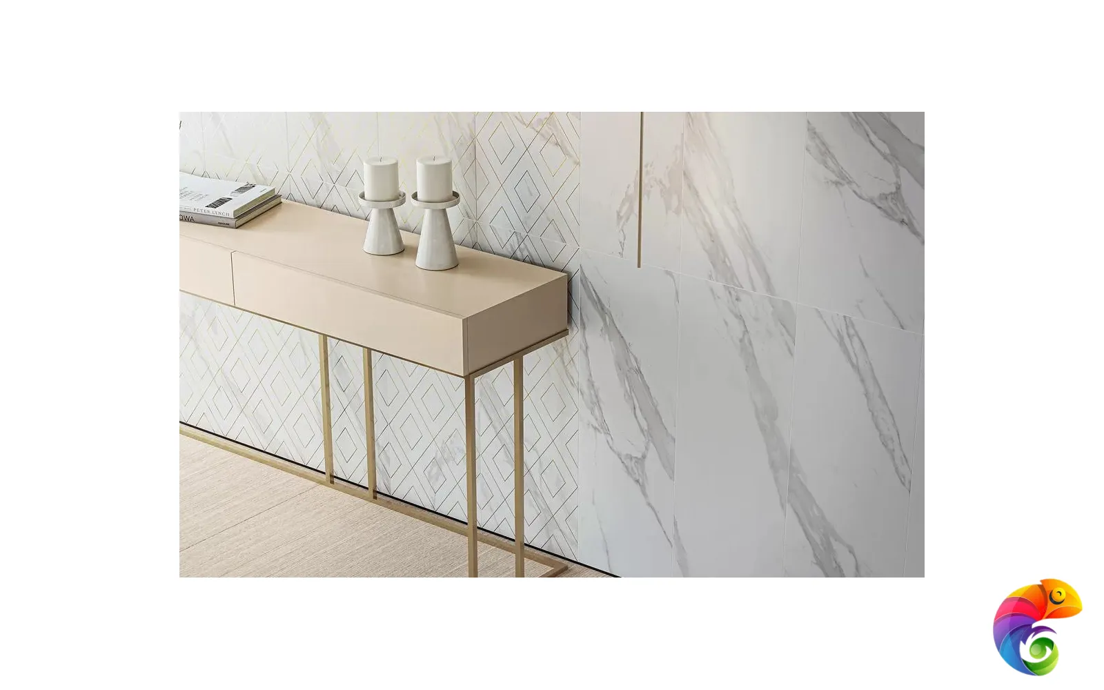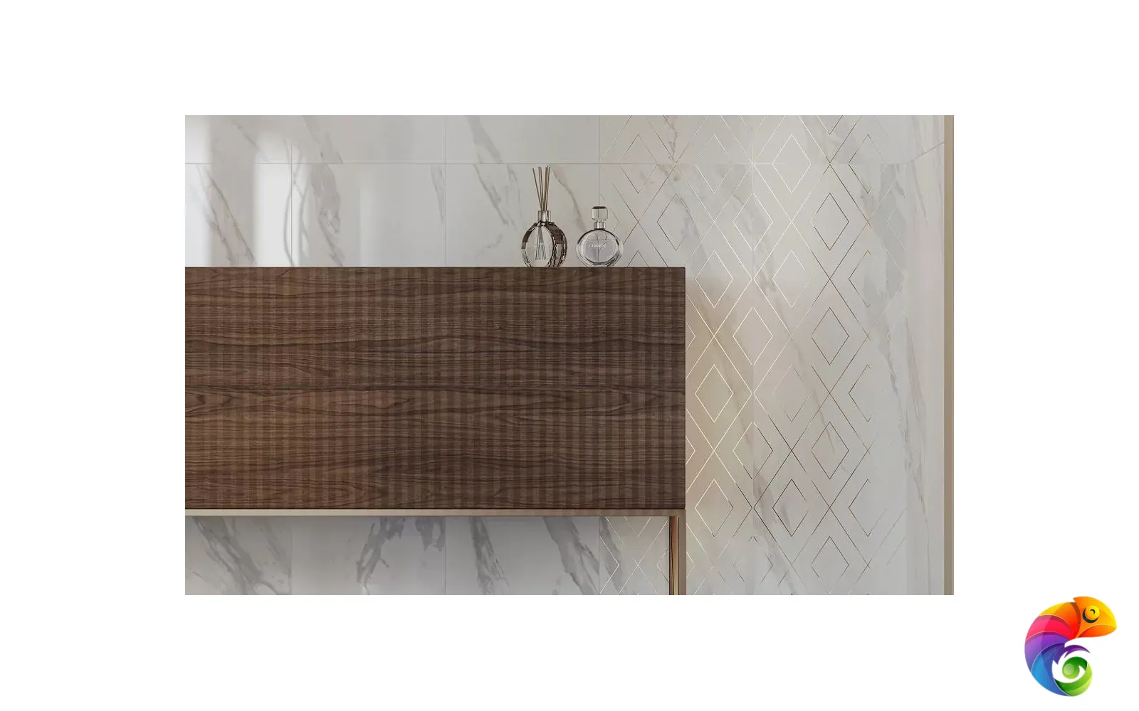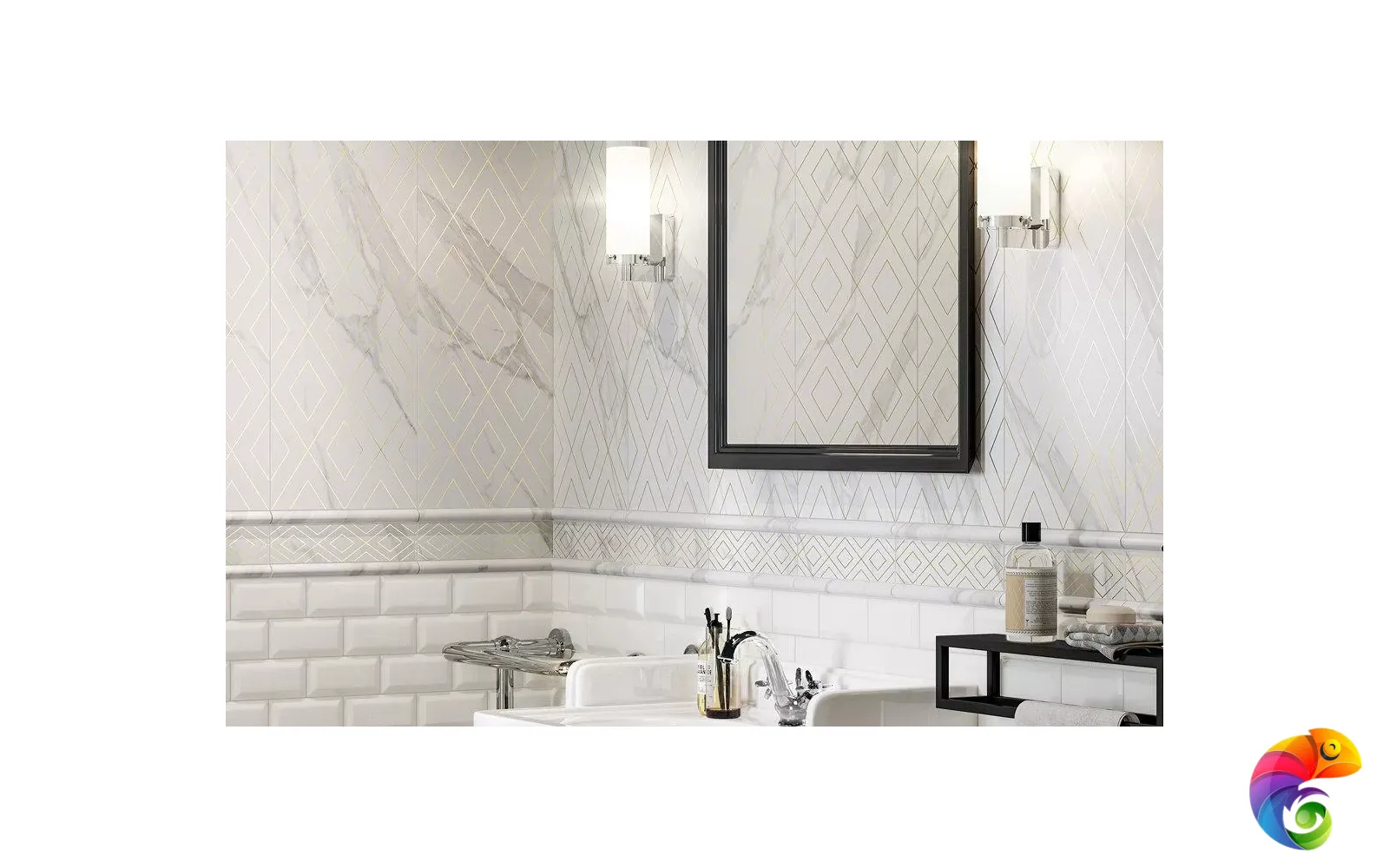 Матовая плитка «Алентежу» формата 30×89,5 воспроизводит рисунок белого мрамора породы «Калакатта». Красота природного материала, заявленная фоновой плиткой, усилена декором того же формата. Декоративный элемент украшен геометрическим орнаментом. Рисунок выполнен тонкими золотыми линиями, которые придают декору дополнительную ценность.