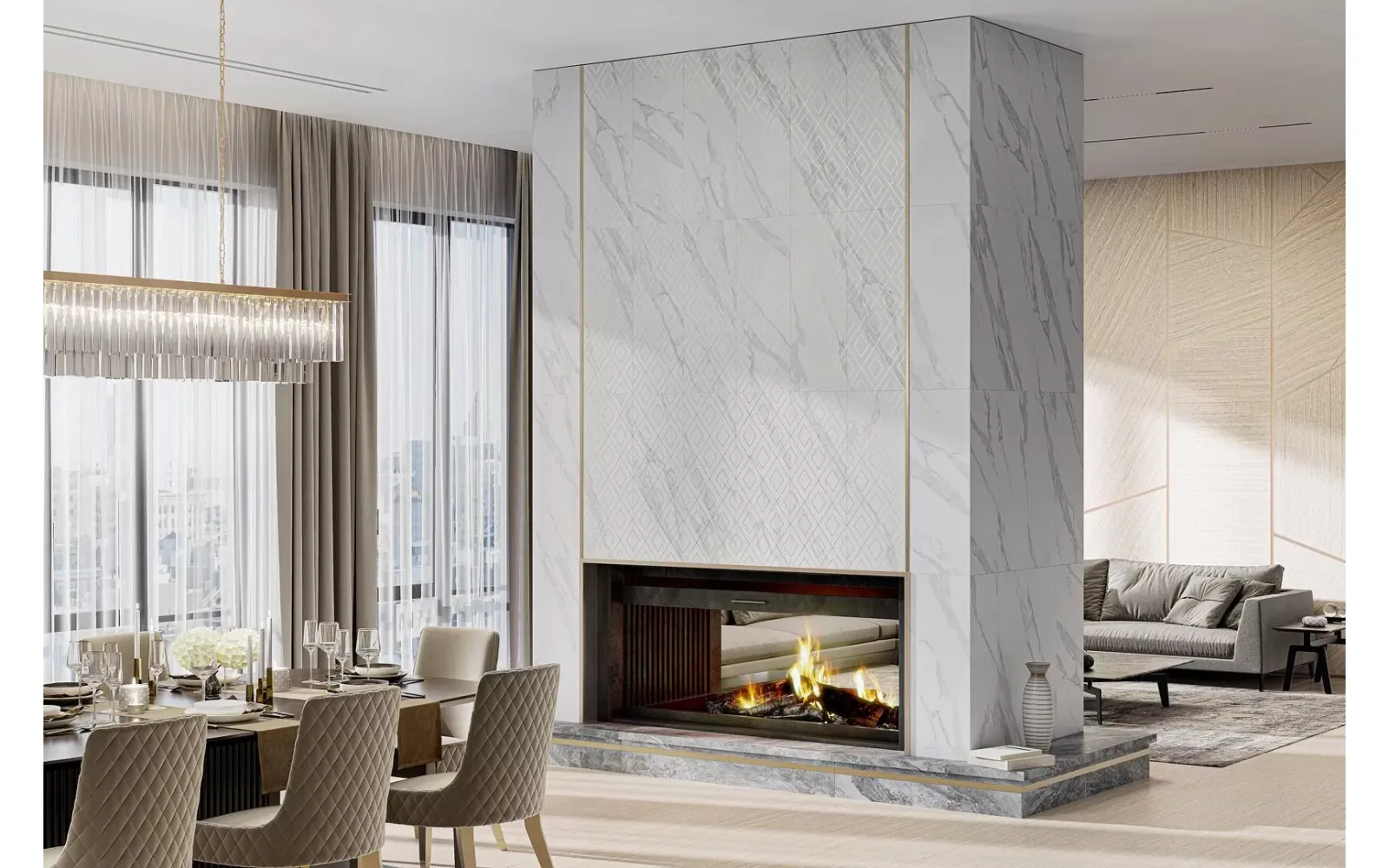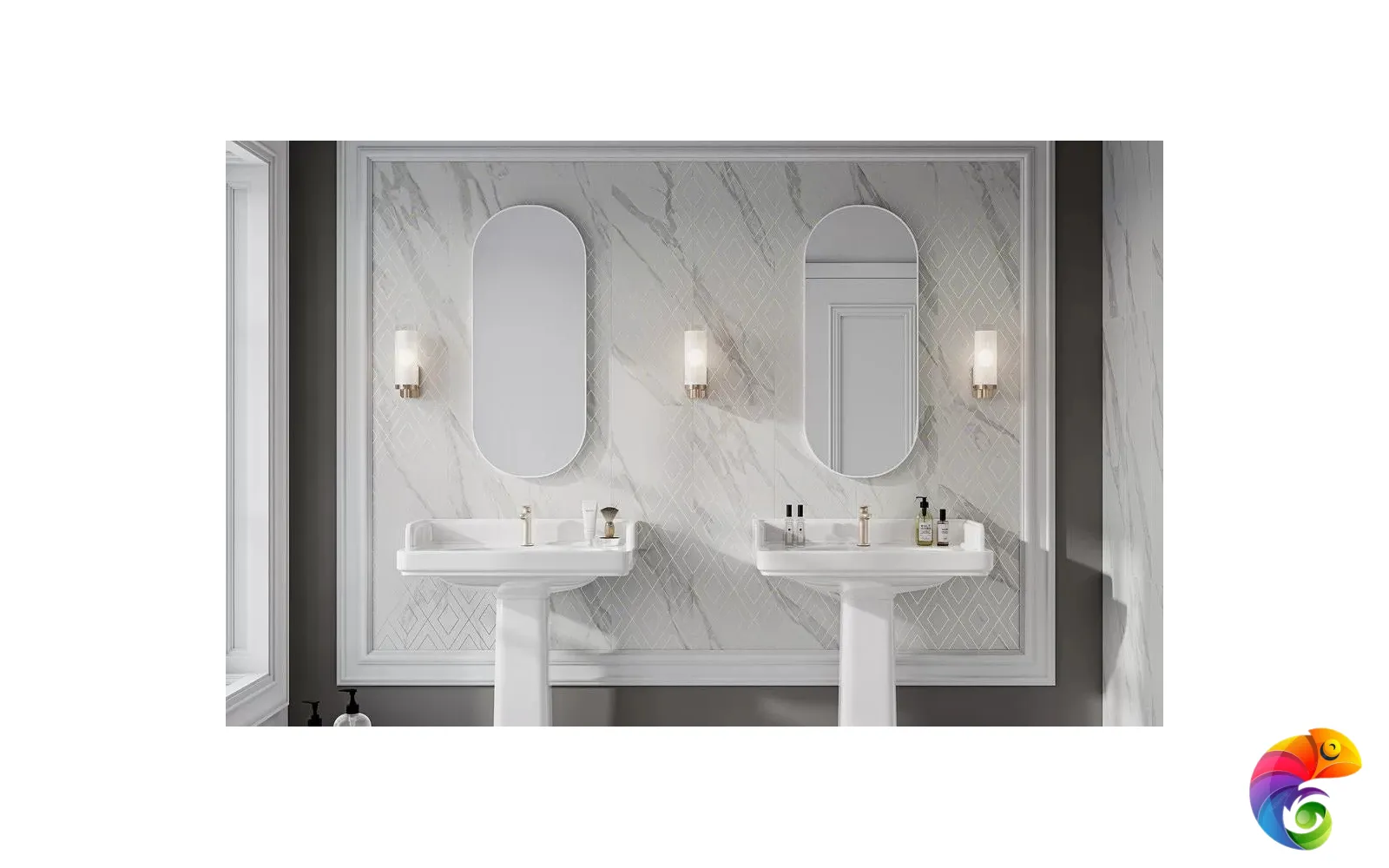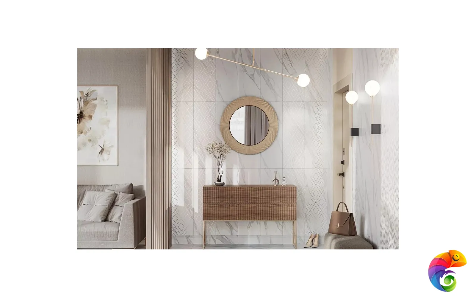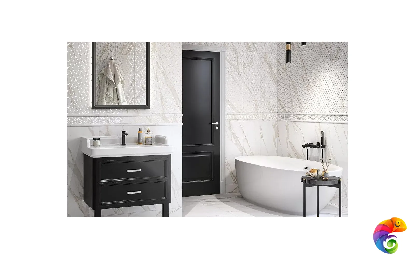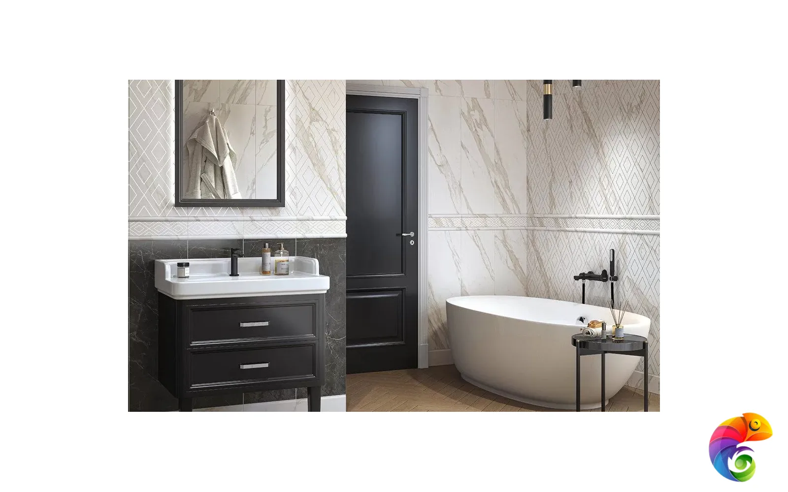 Матовая плитка «Алентежу» формата 30×89,5 воспроизводит рисунок белого мрамора породы «Калакатта». Красота природного материала, заявленная фоновой плиткой, усилена декором того же формата. Декоративный элемент украшен геометрическим орнаментом. Рисунок выполнен тонкими золотыми линиями, которые придают декору дополнительную ценность.
