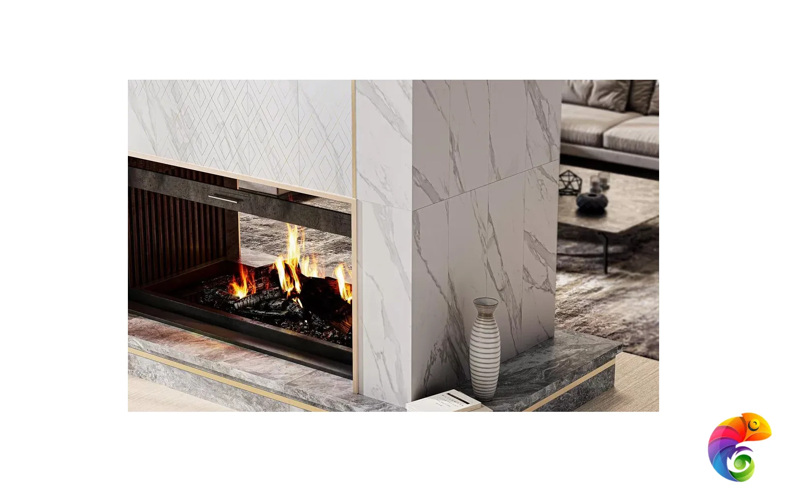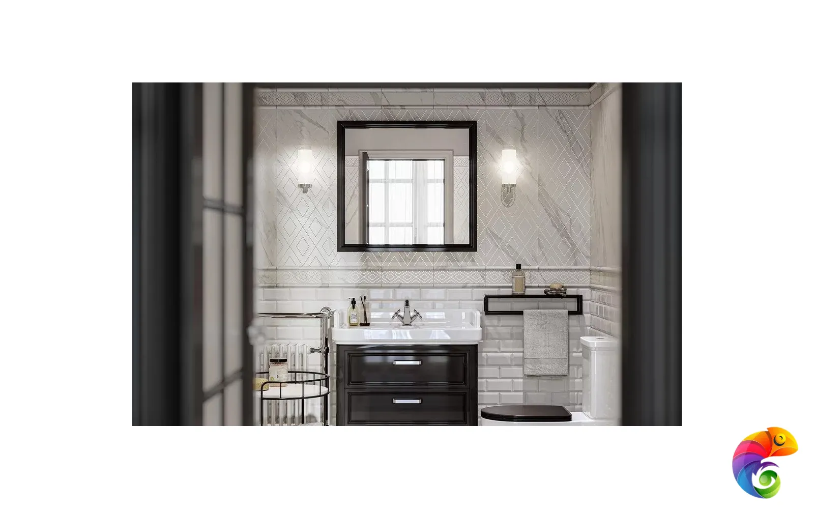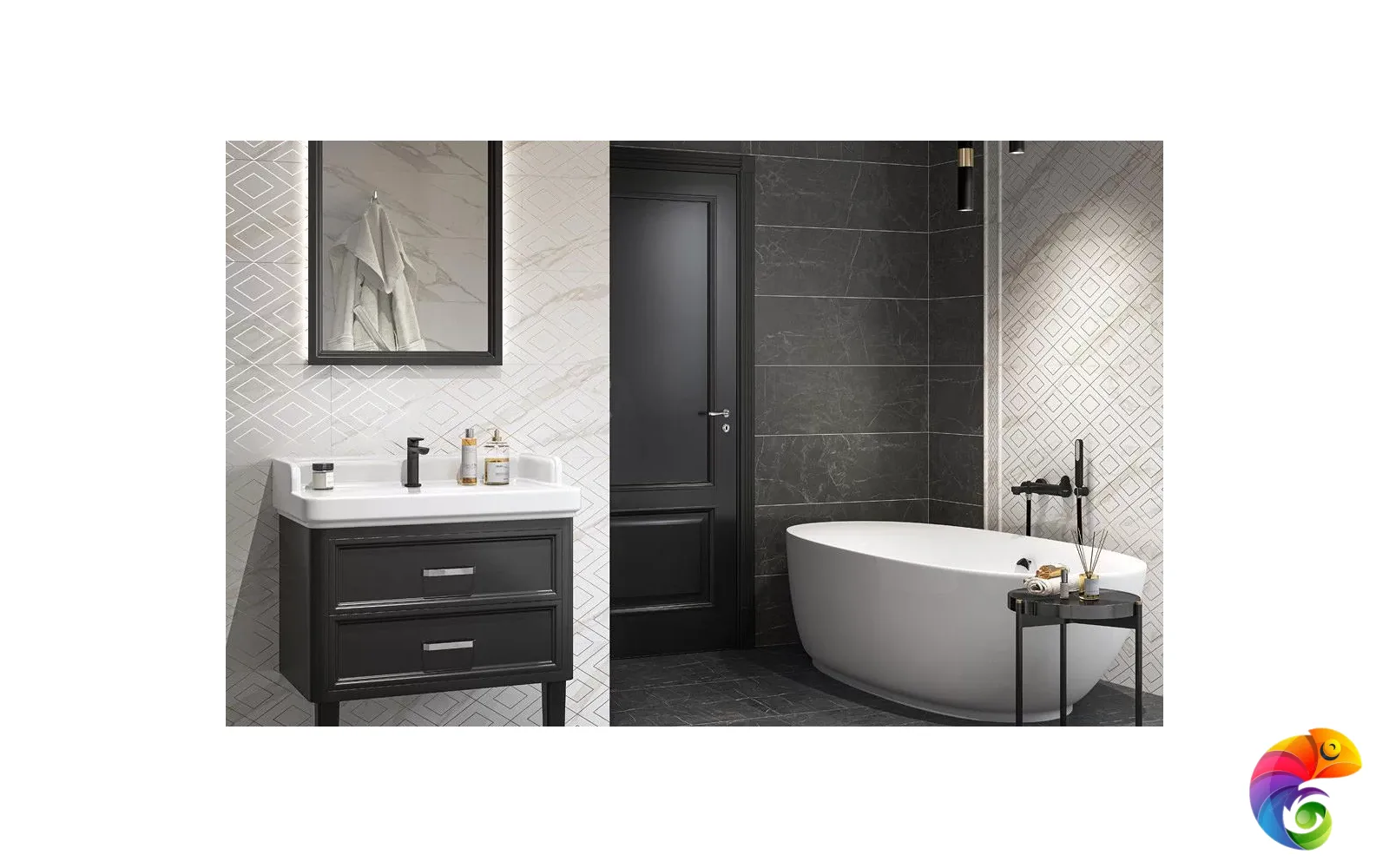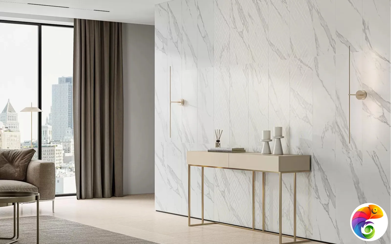 Матовая плитка «Алентежу» формата 30×89,5 воспроизводит рисунок белого мрамора породы «Калакатта». Красота природного материала, заявленная фоновой плиткой, усилена декором того же формата. Декоративный элемент украшен геометрическим орнаментом. Рисунок выполнен тонкими золотыми линиями, которые придают декору дополнительную ценность.