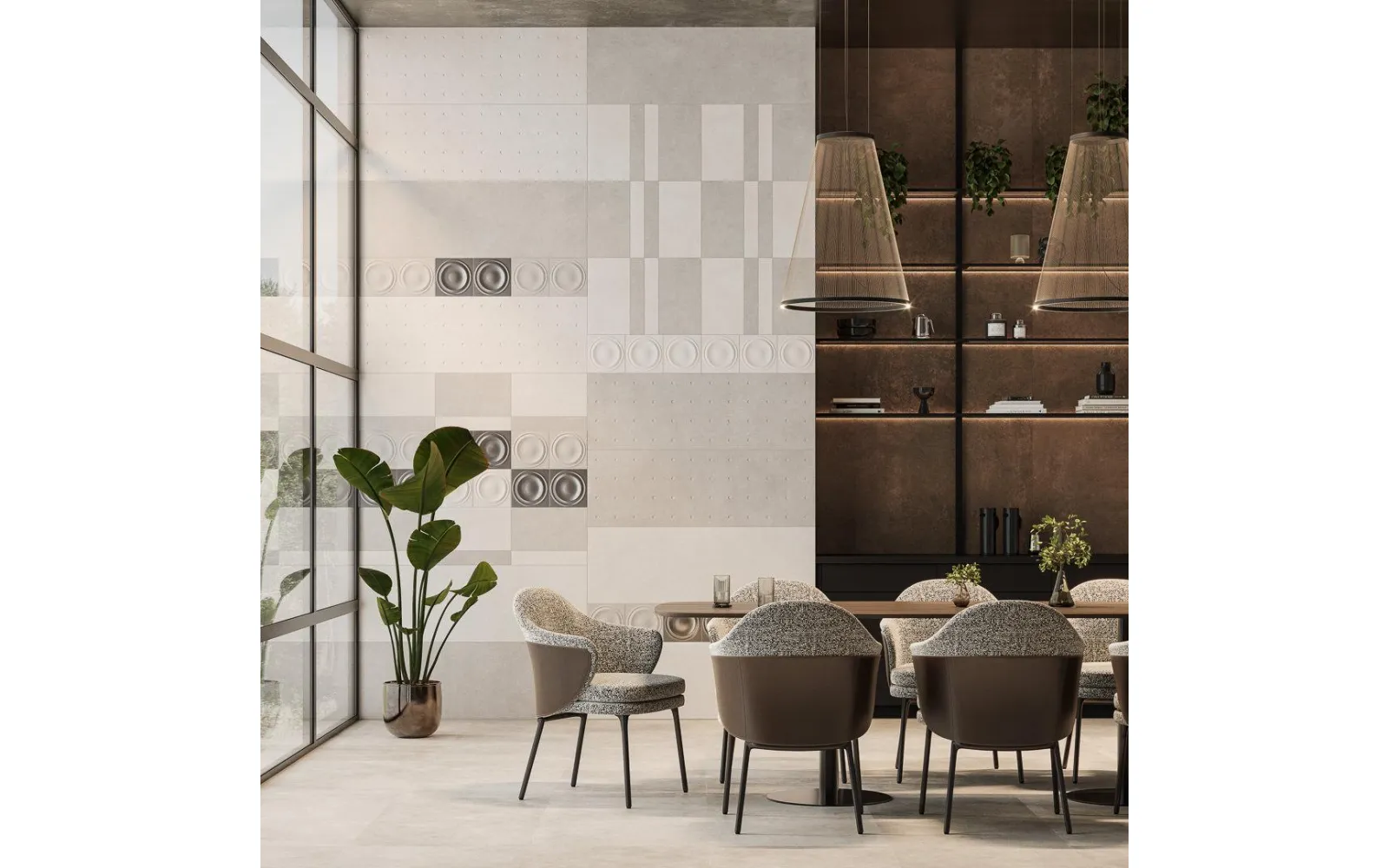 Серия представляет керамический бетон формата 40×120 — востребованное решение, в том числе для отделки офисов, бизнес-центров и общественных пространств. Материал выполнен в привычных цветах, оптимальных при работе с большими площадями: это серый и бежевый светлый. Проведя рукой по матовой поверхности, можно почувствовать фактуру материала. Два артикула выполнены с дополнительной структурой в виде круглых углублений.