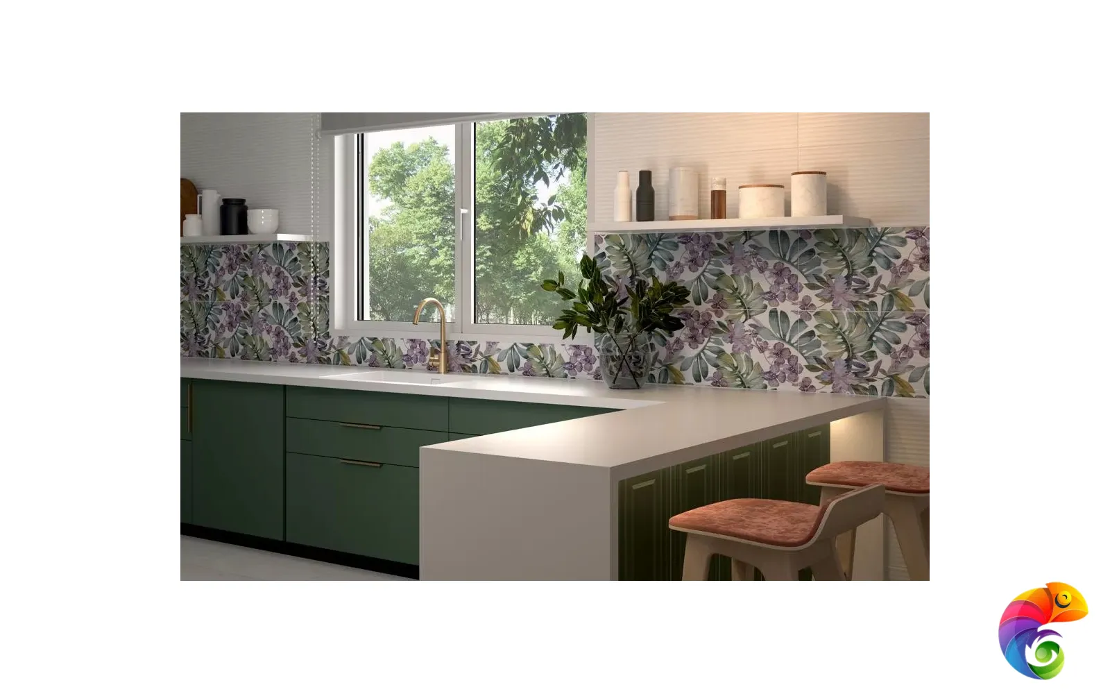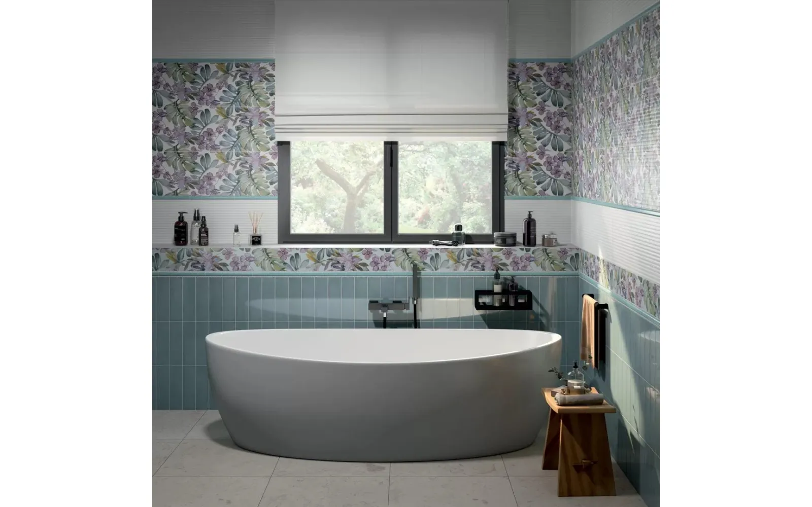 Любители комнатных растений серии Бѐла-Вѝста узнают в декоре плитки с цветами листья монстеры и венчики орхидей. Такое украшение из плитки на фартуке в кухне, на плитке в ванной комнате или даже в гостиной будет прекрасно сочетаться с растениями в интерьере, привнося в современную обстановку очарование тропиков. Разноцветная плитка идеально подойдет для фрагментарной отделки. Горизонтальная полоса из листьев и соцветий в сочетании с однотонной плиткой-компаньоном превратит стандартное помещение в прекрасный оазис.