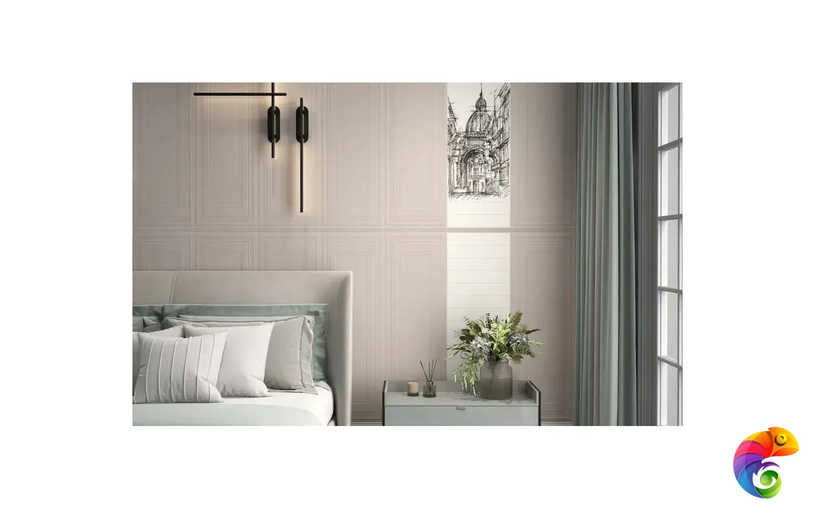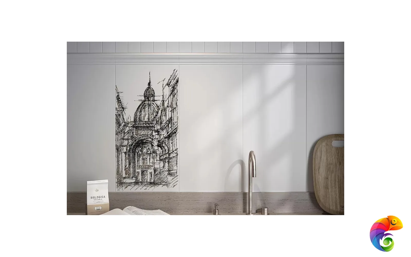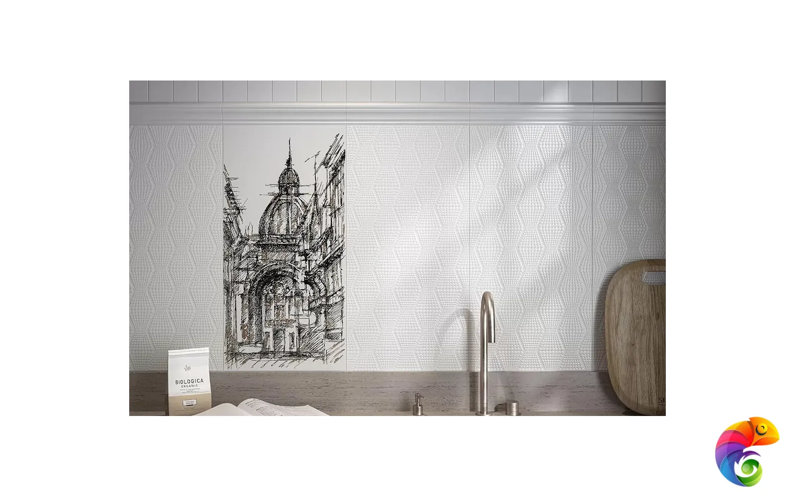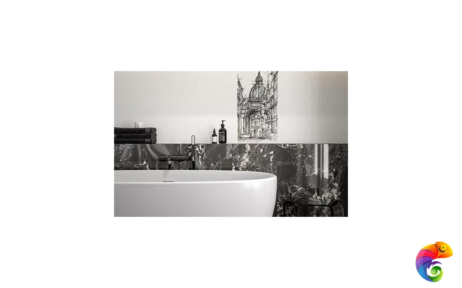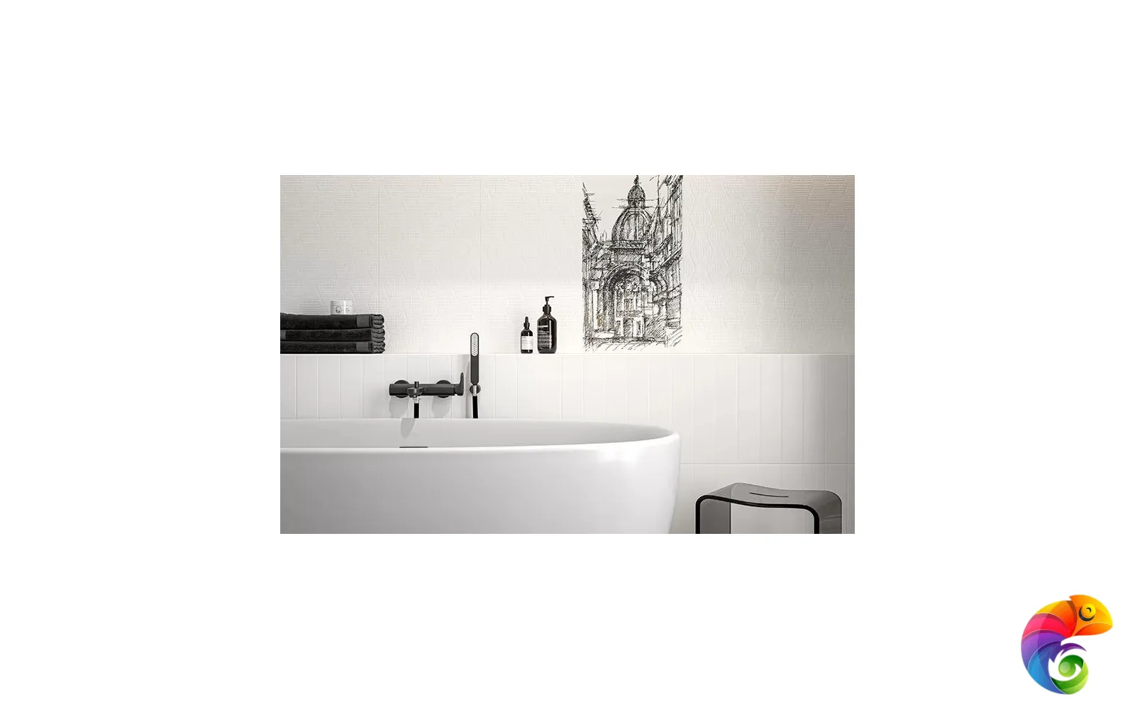 С помощью артикулов серии «Беллони» можно создать законченный интерьер в белом цвете, при этом композиция будет смотреться эффектно — в том числе благодаря удивительному декору с видом Венеции. Венецианский пейзаж нанесён на поверхность блестящим металлизированным составом. Декоративная плитка под камень, выполненная с преднарезкой, делает эту серию ещё более разнообразной.