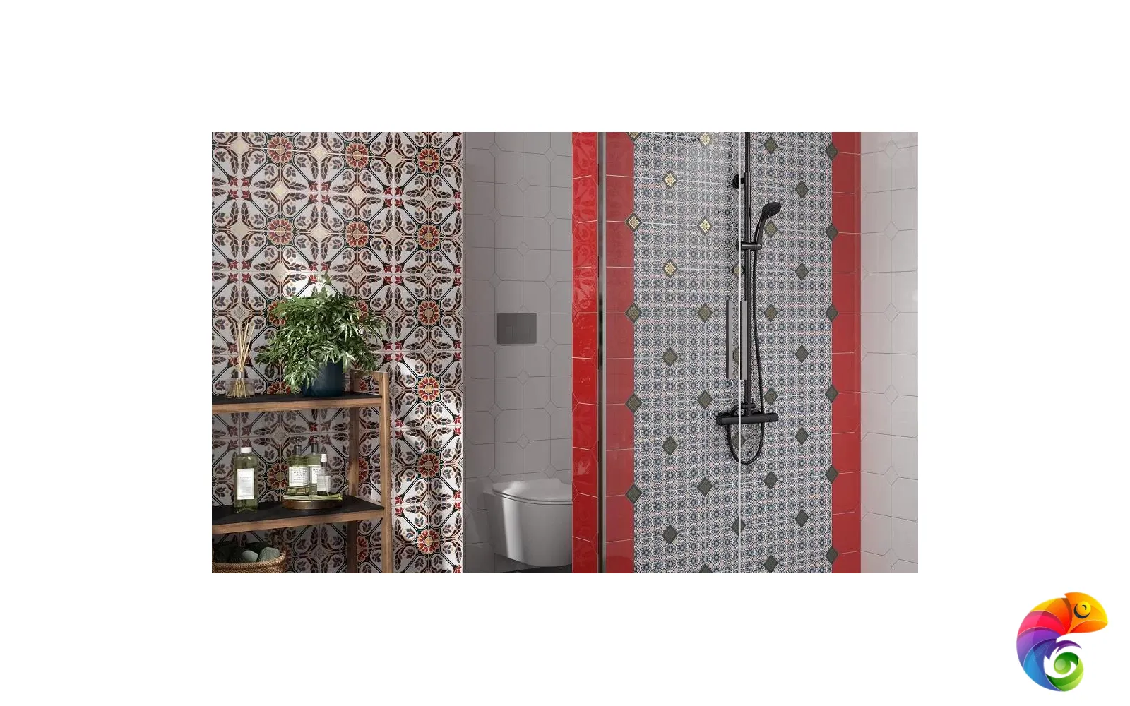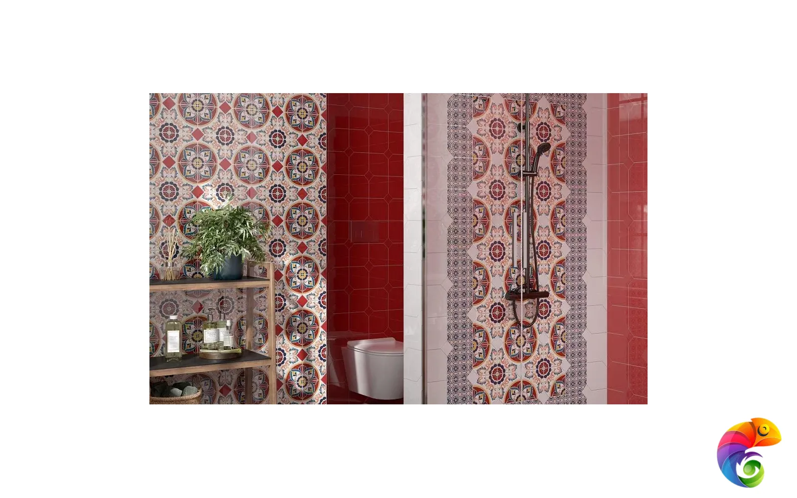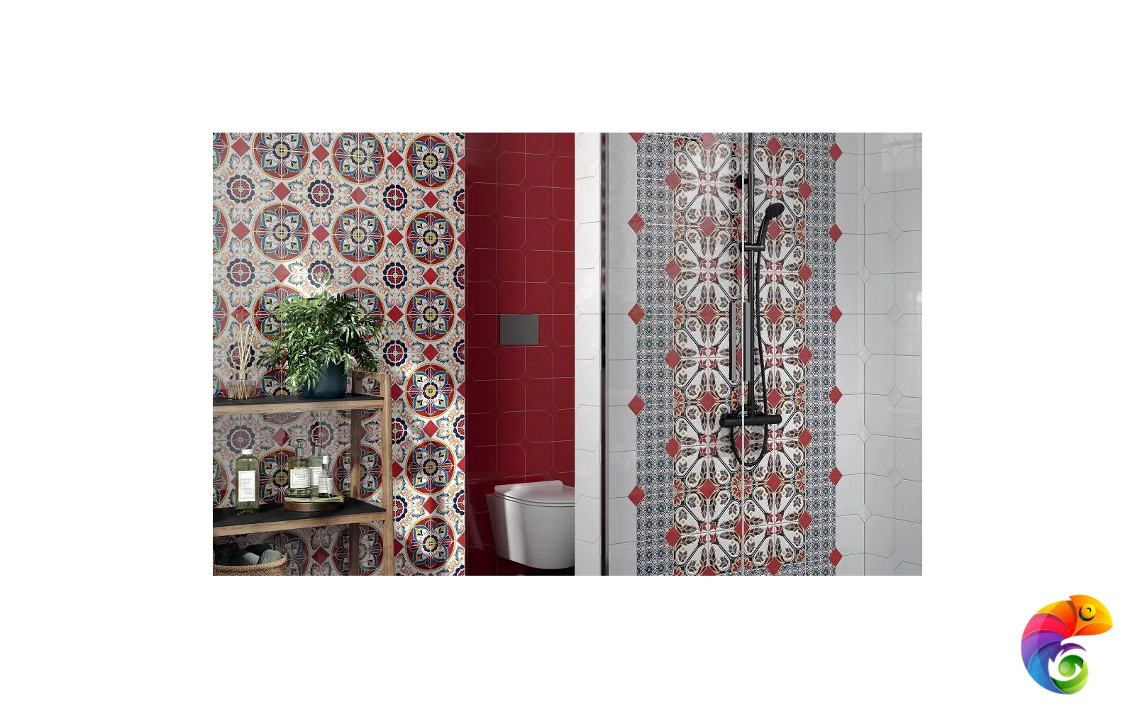 Вместе с декорами «Болао» в керамической композиции можно использовать глянцевую однотонную плитку «Граньяно» белого и красного цветов. В интерьере будет отлично смотреться мебель в той же гамме, в том числе кухонная, с добавлением красного или синего текстиля на окнах.