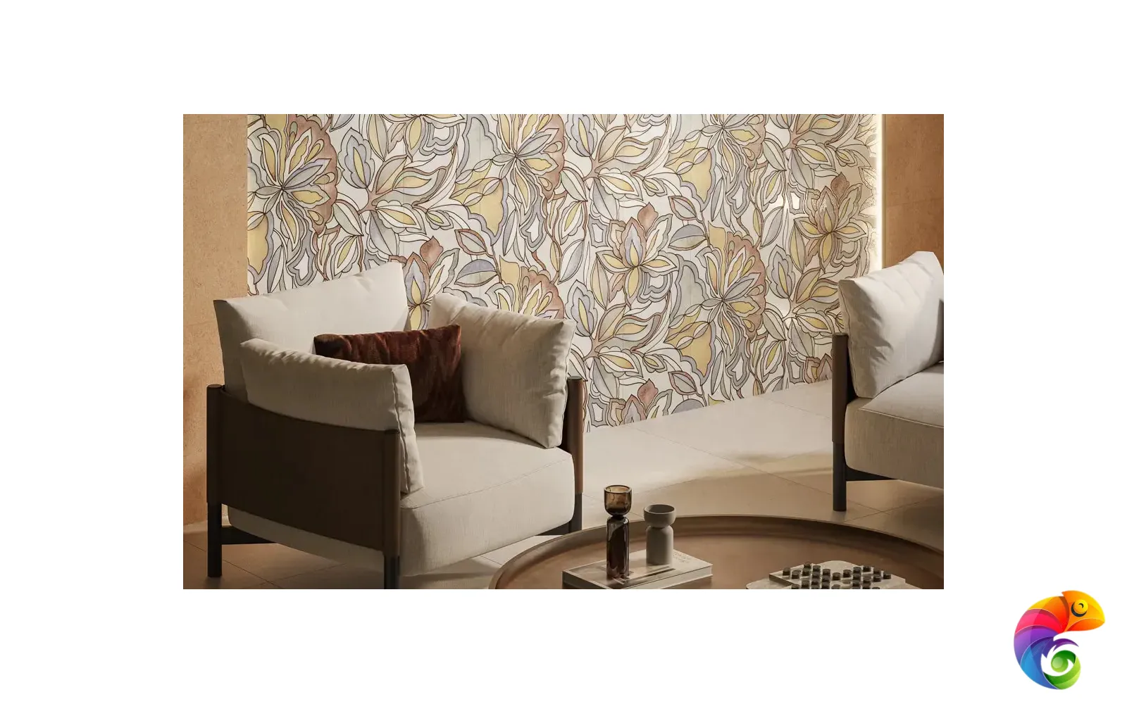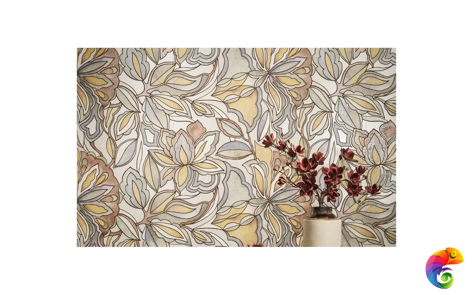 Крупный цветочный орнамент — в основе этого панно, состоящего из трёх частей формата 30×60. Фиолетовые, зелёные и терракотовые тона сочетаются с плавными линиями, создавая ощущение ритма и живой пластики. Части панно стыкуются по горизонтали и вертикали, формируя цельное изображение нужного размера.