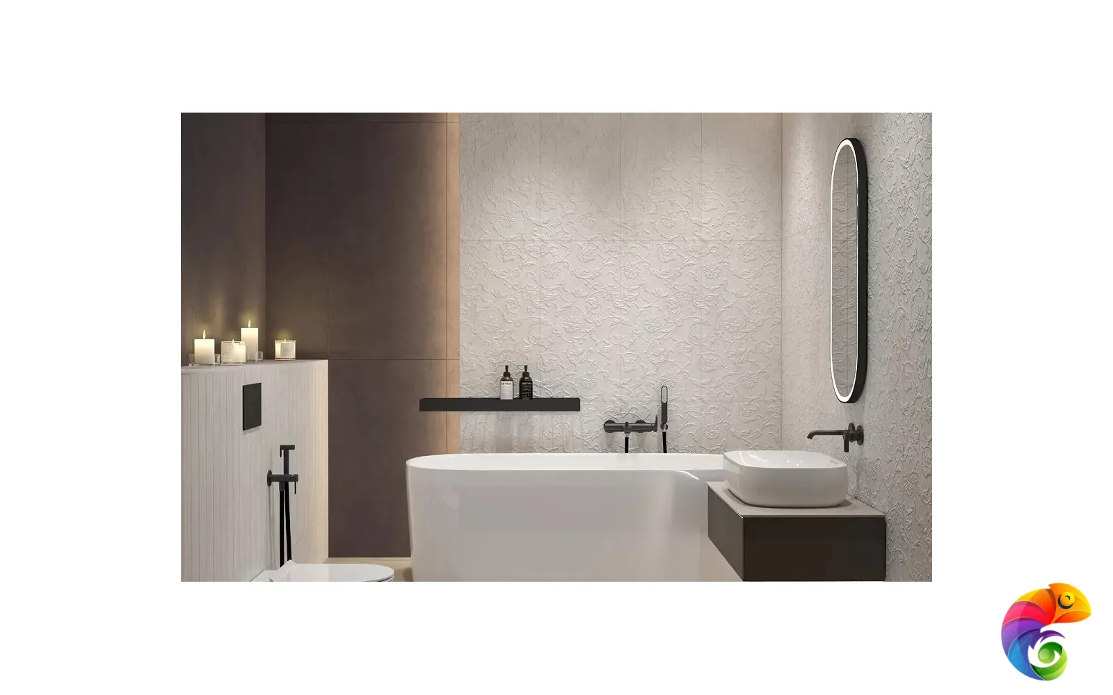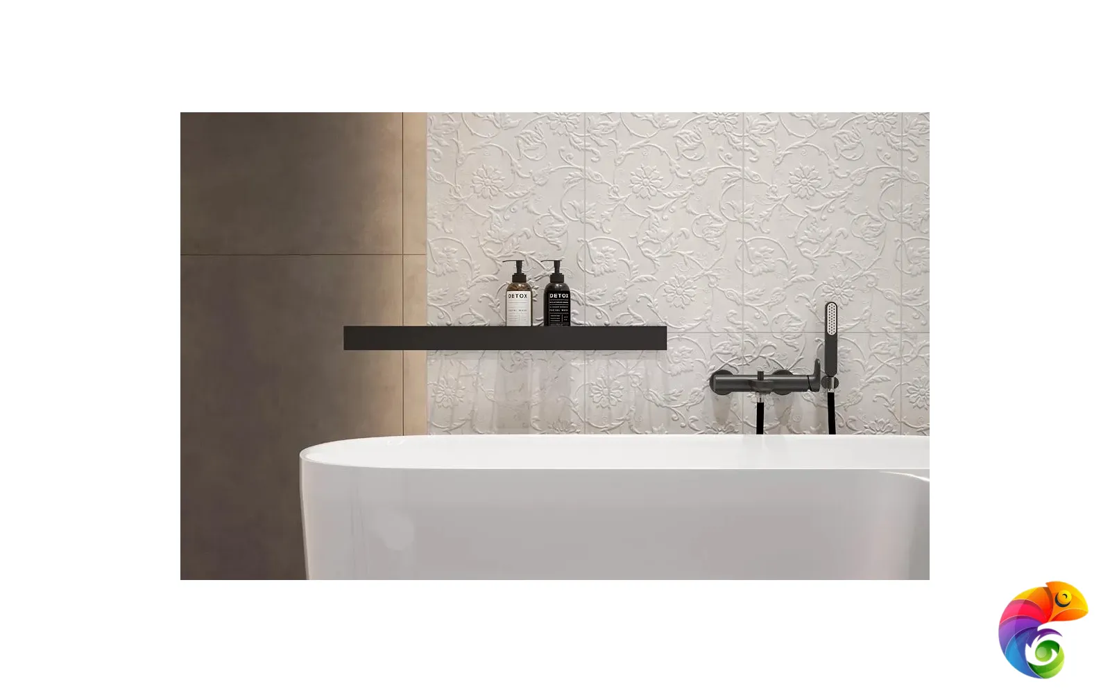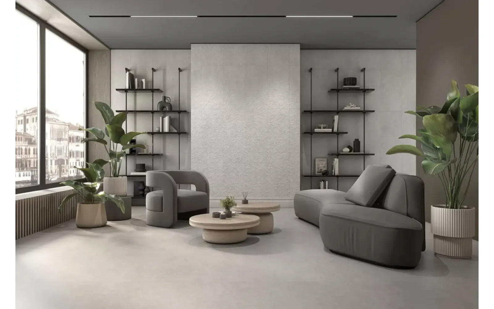 Базовая прямоугольная плитка формата 40×80 представлена как с гладкой, так и со структурированной поверхностью, украшенной цветочным орнаментом. Такой артикул будет удобен в том числе для интерьеров в стиле лофт и контемпорари, где в текстуре бетона могут быть выполнены выкладки большой площади. В декорах использован трендовый приём — плитка с преднарезкой, которая готова составить конкуренцию крупной мозаике.