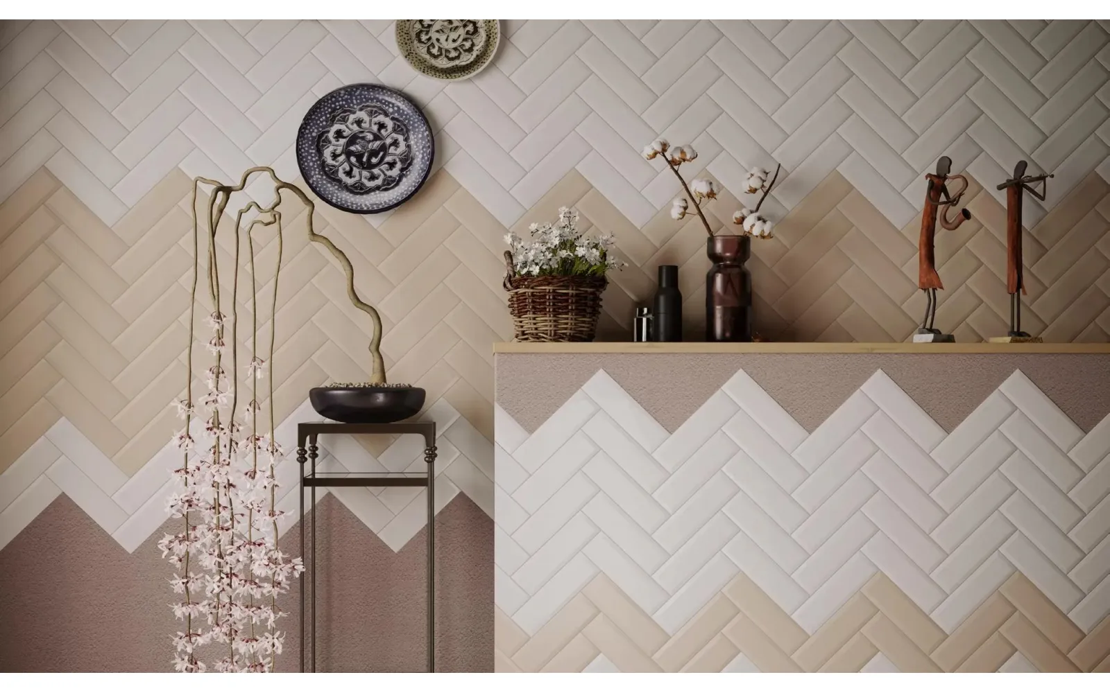 Как звуки выстраиваются в музыкальную гамму, так же оттенки цвета образуют здесь ряд из семи разных тонов. Фоновая плитка со структурой «диамантато» поддержана декорами с авторской графикой.
