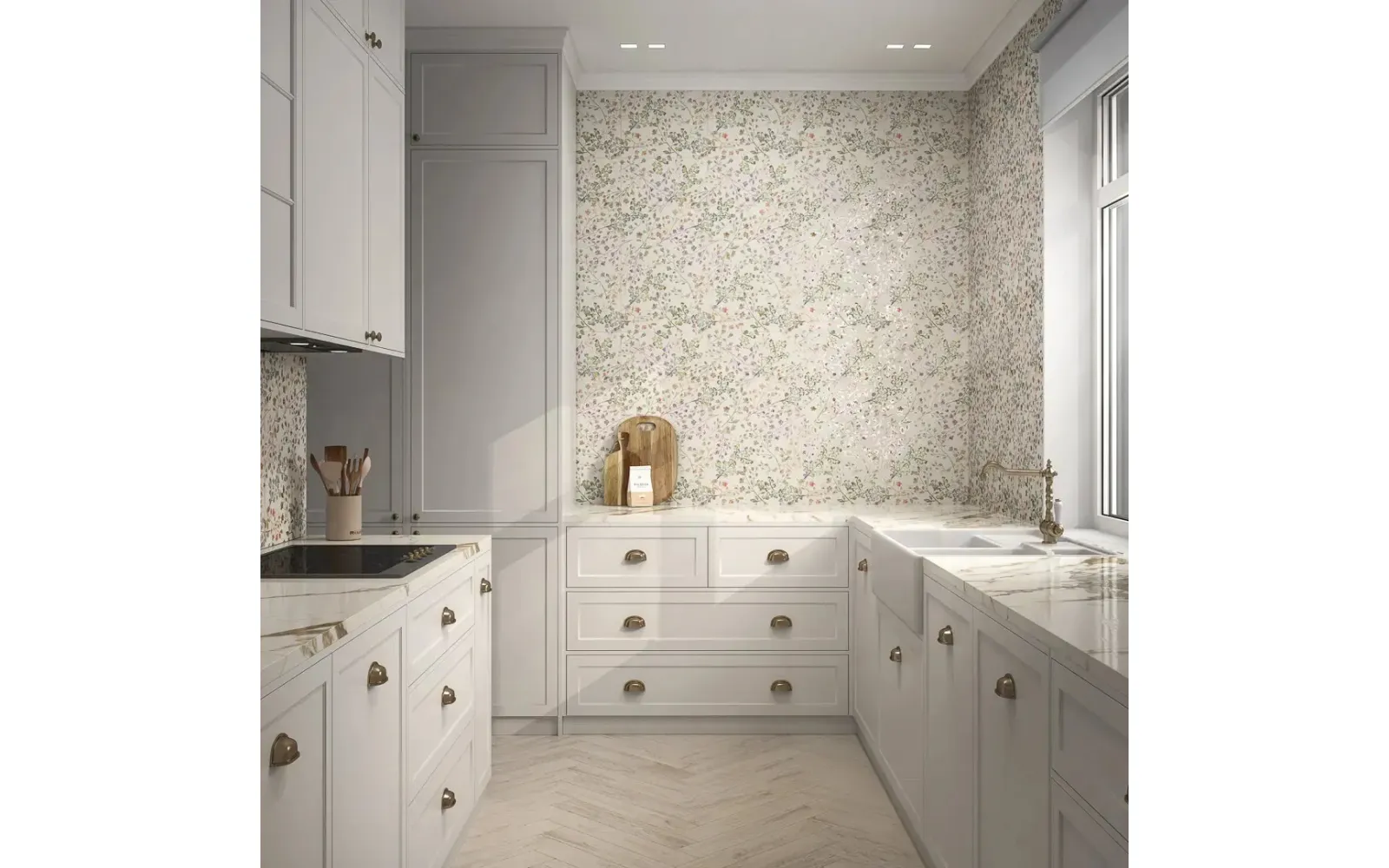 Декор с цветочными орнаментами покрыт специальным составом, который под разным освещением дарит бутонам и соцветиям неповторимые оттенки. Такой рисунок и через несколько лет сохранит свою свежесть, дарящую глазу истинное наслаждение.