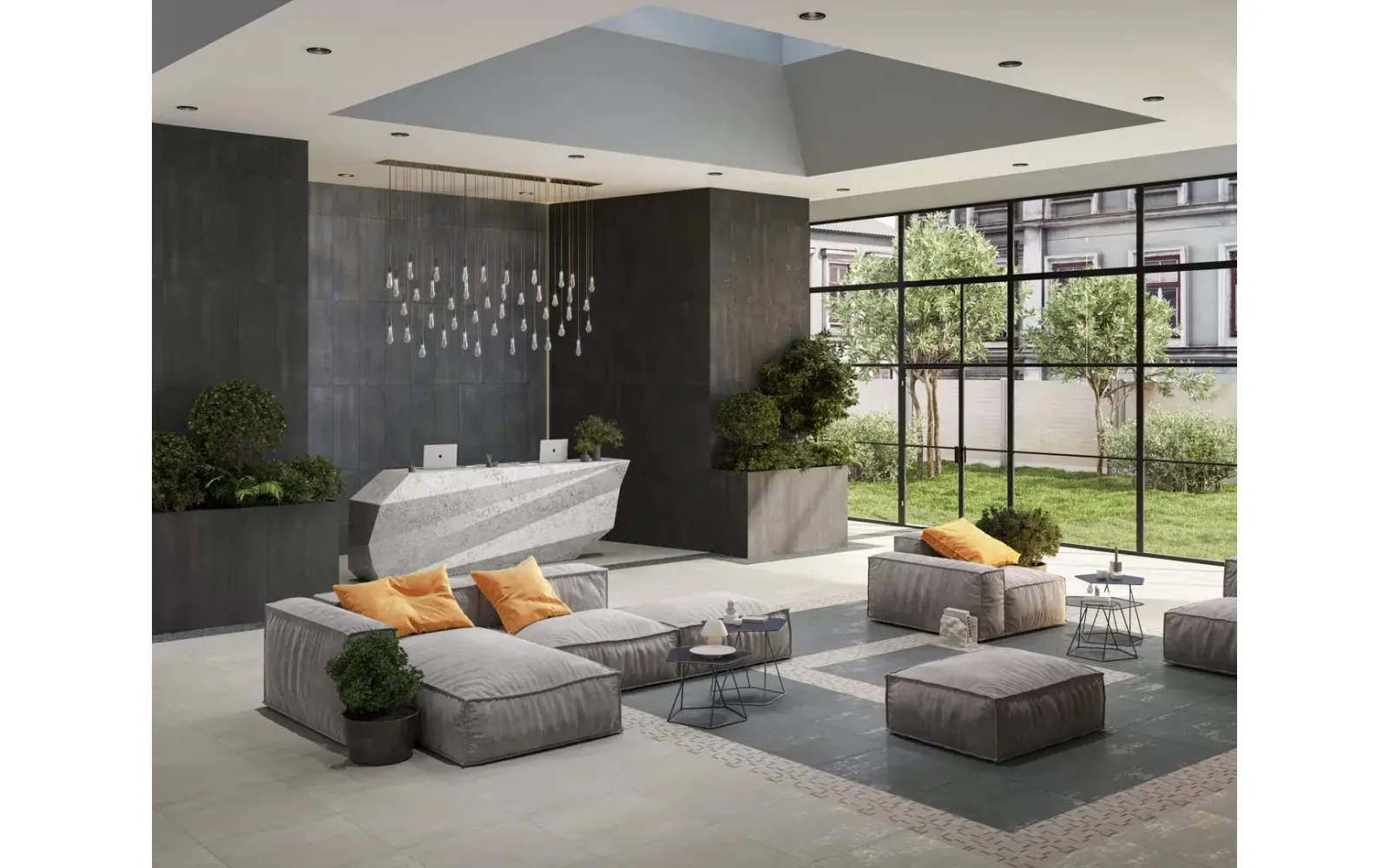 Серия содержит всё, чтобы получить законченный интерьер: помимо плитки и керамогранита 60×60, это ступени, подступёнки, плинтус, бордюры-карандаши и декоры во всех трёх из представленных цветов.