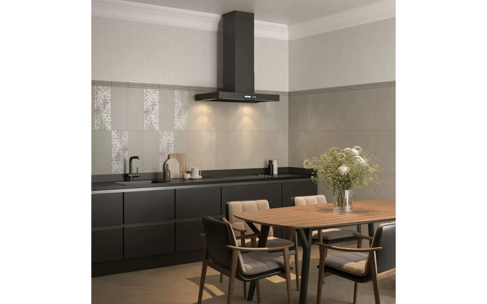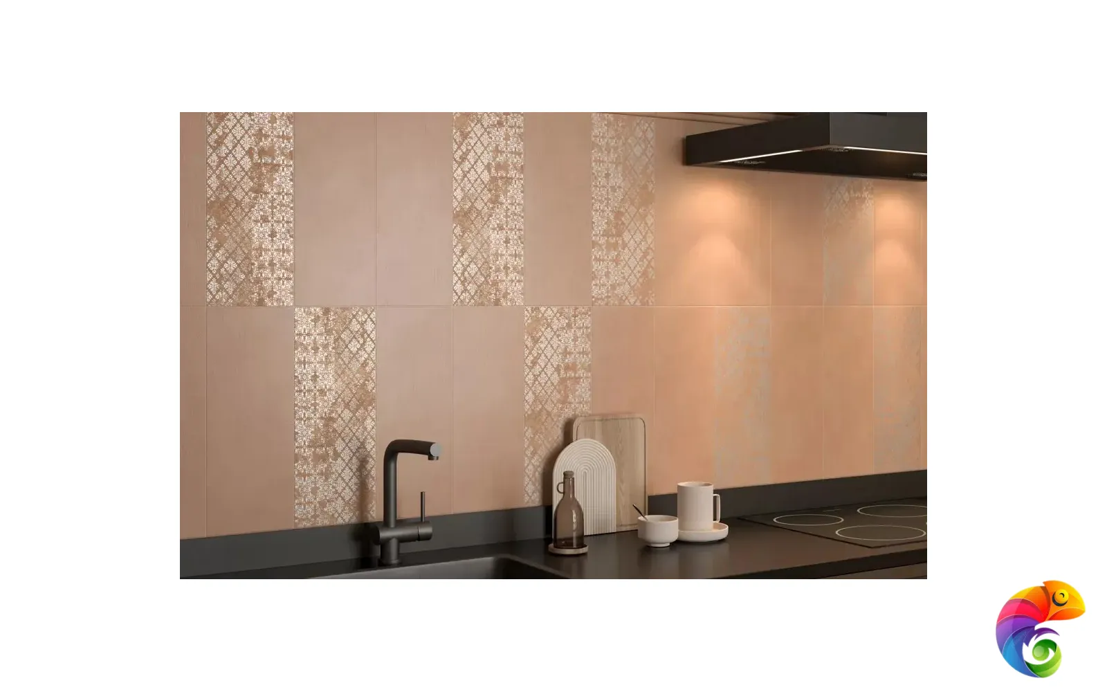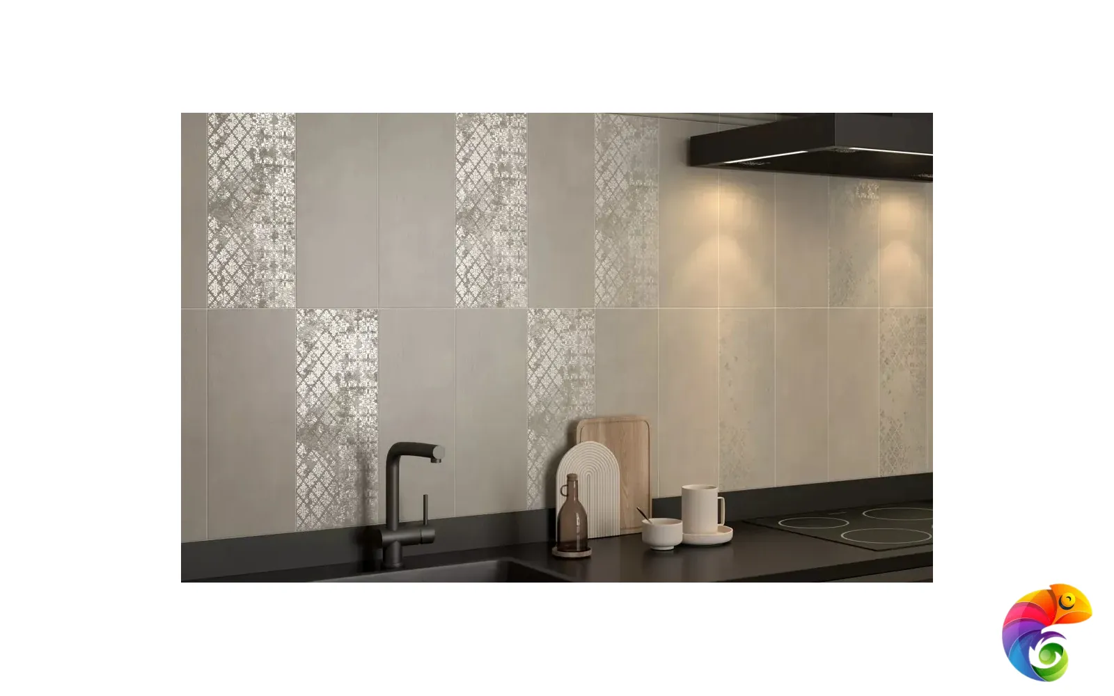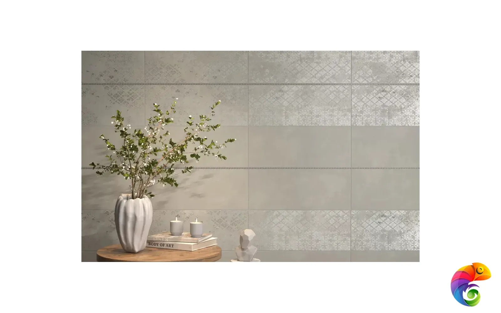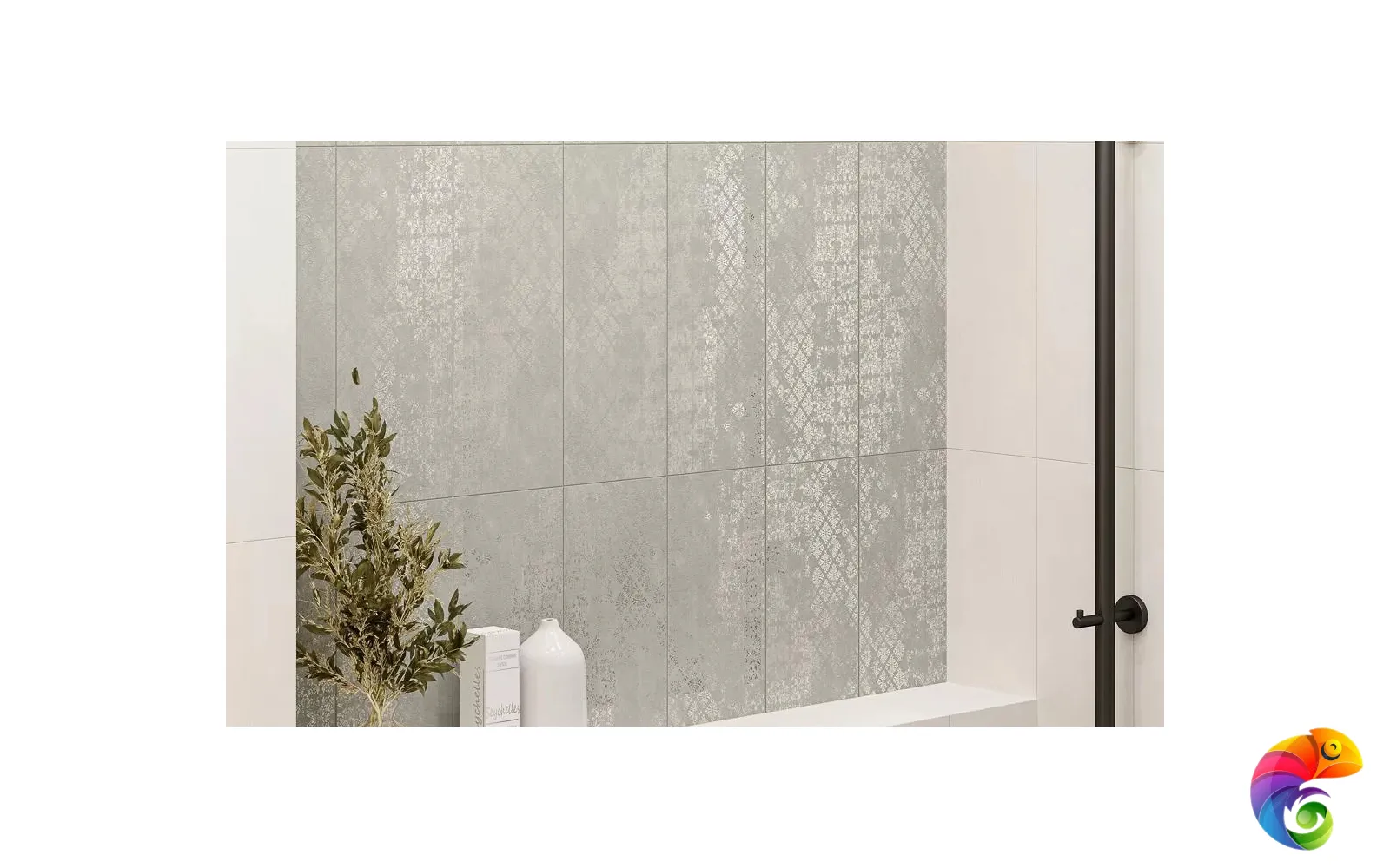 На декоративной плитке 20×50 воспроизведена благородная старина, характерная для Венеции. На бетонную основу словно наброшено тонкое кружево — ещё один очень венецианский мотив. Декоры выполнены с применением металлизированной краски, отчётливо проступающей на свету.
