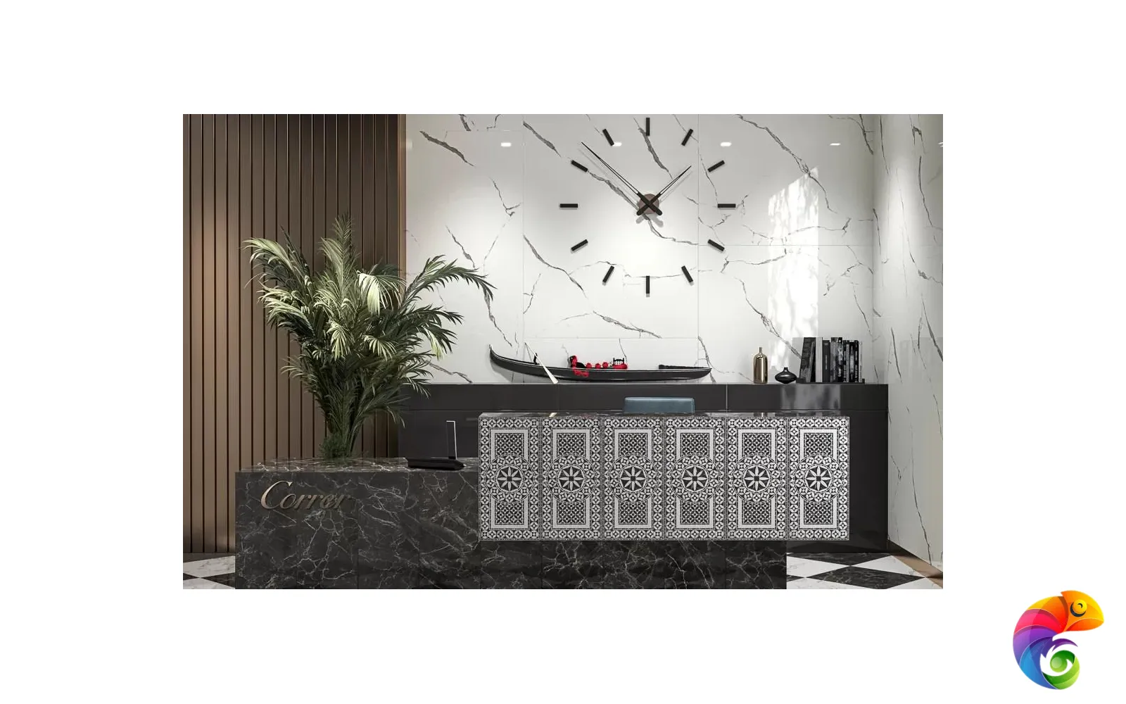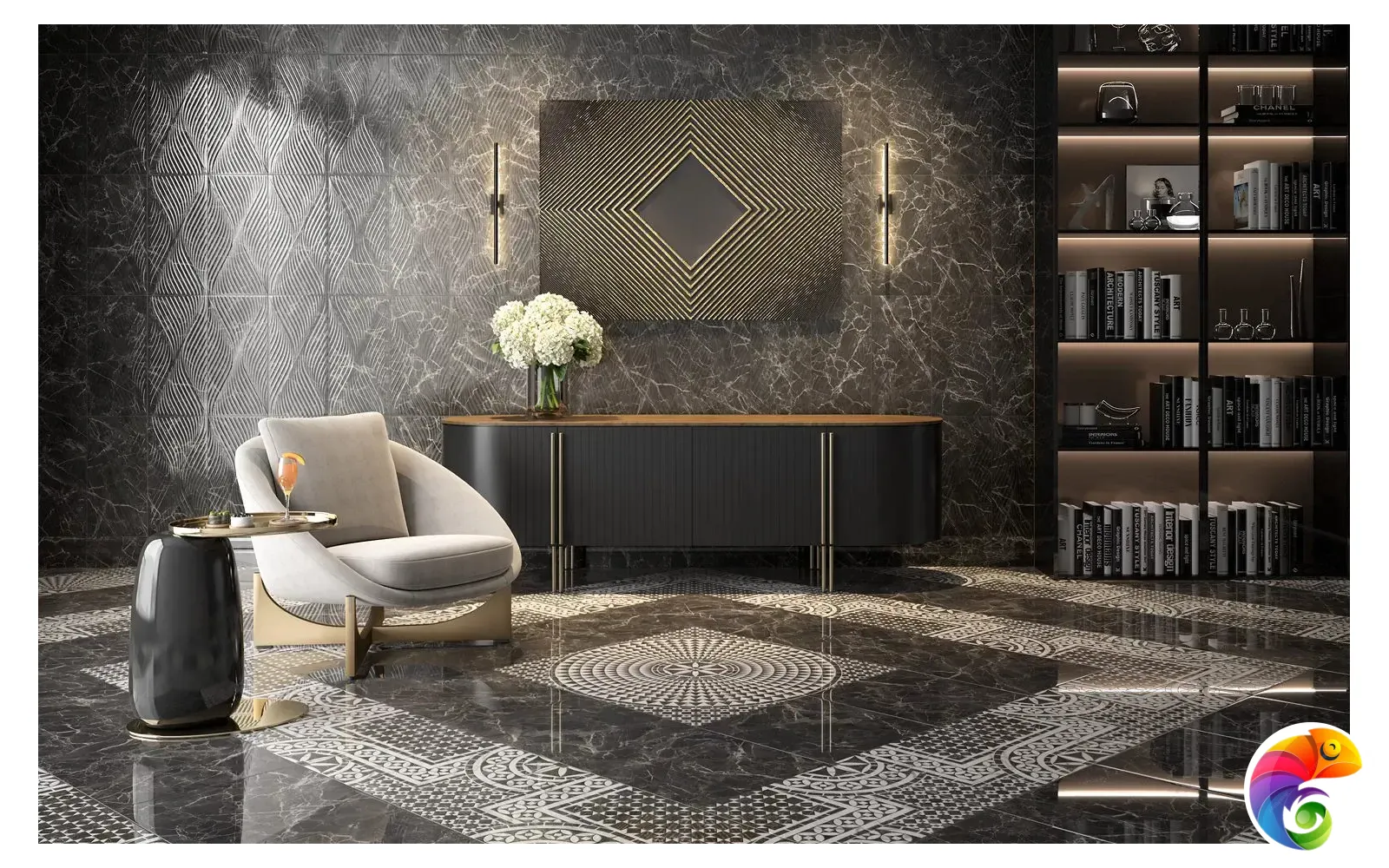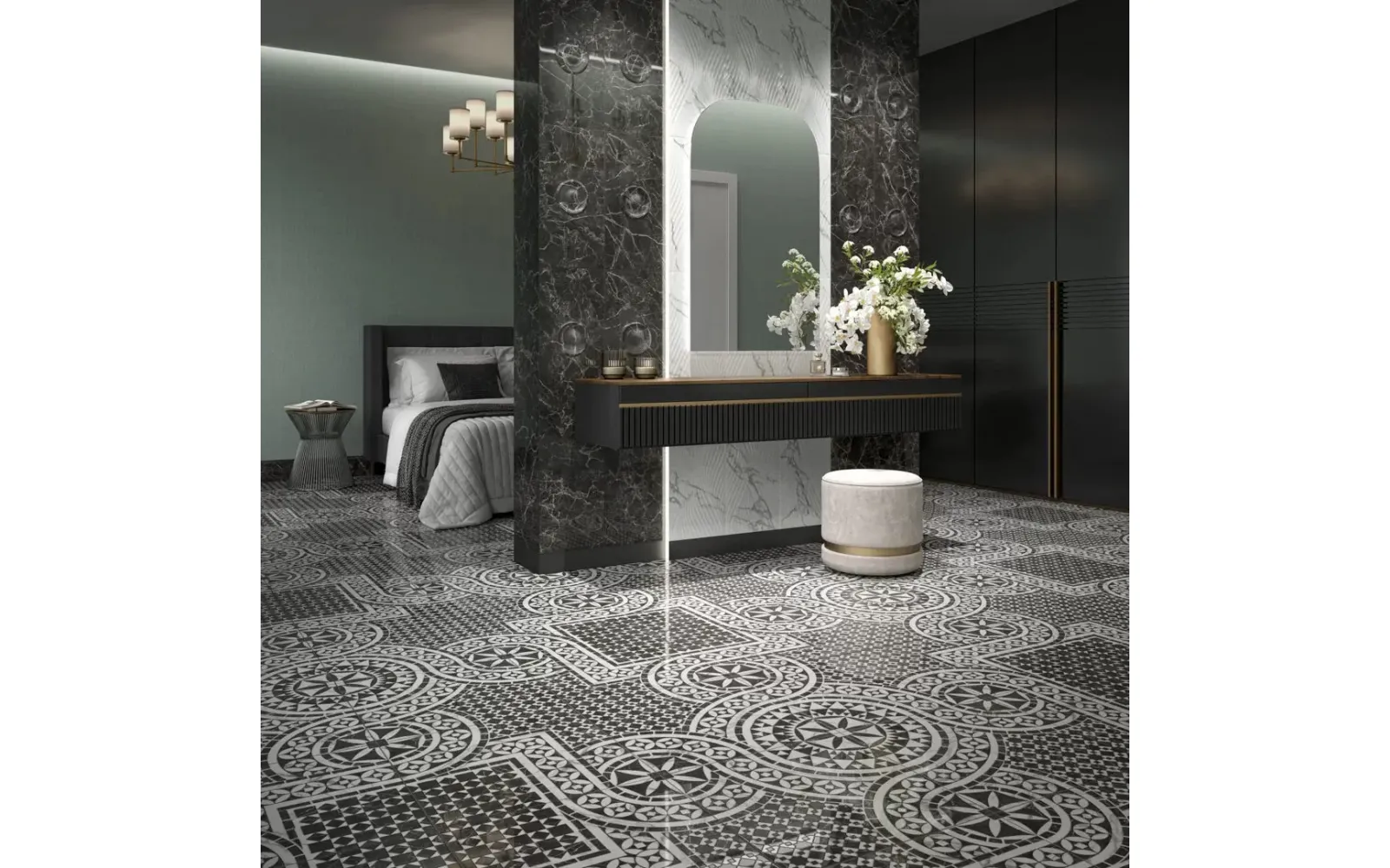 Для пола «Коррер» даёт возможность выбора базовой или более выразительной декоративной плитки 50,2×50,2, в том числе с орнаментом. Декоры для пола сделаны с использованием полировки, что придаёт им эффект инкрустации.