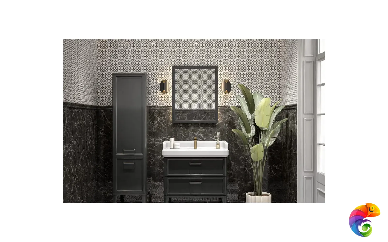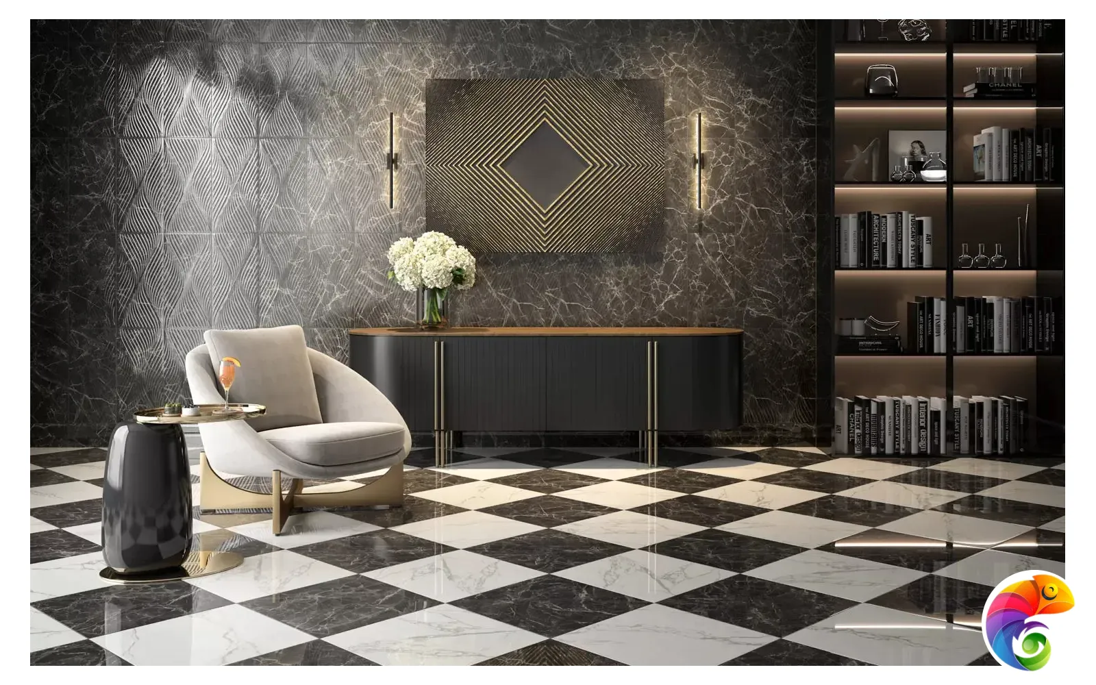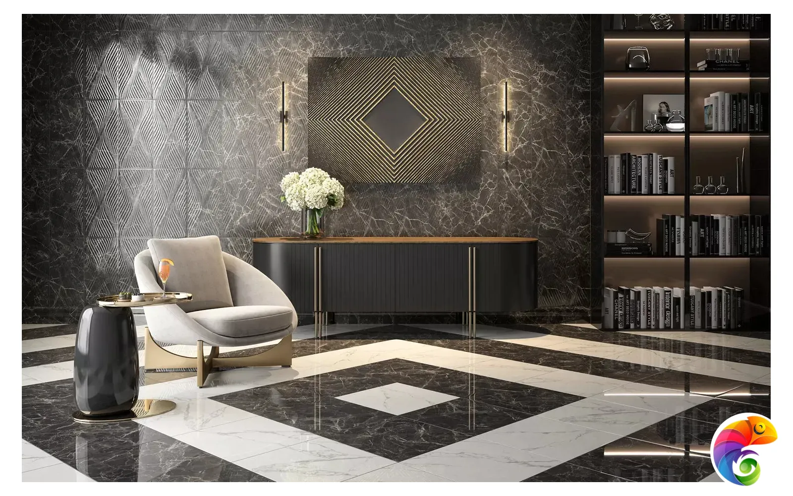 Контраст чёрного и белого мрамора — беспроигрышный вариант для создания обстановки. Ещё одно оригинальное декоративное решение, впервые предложенное в этой серии, — своеобразный «дуэт» плитки с отверстием и совпадающих с ним круглых элементов для включения в композицию собственных наборных декоров.