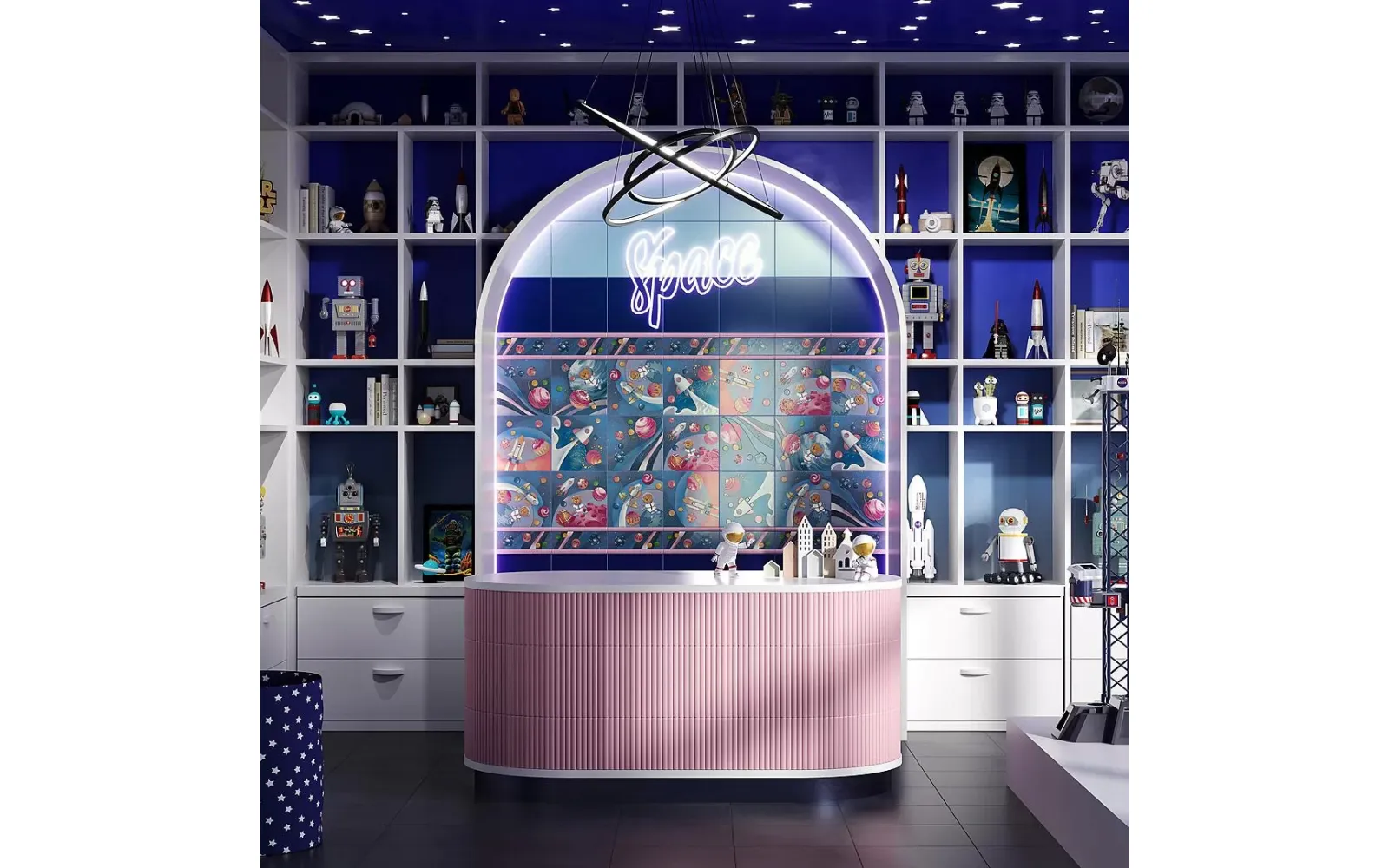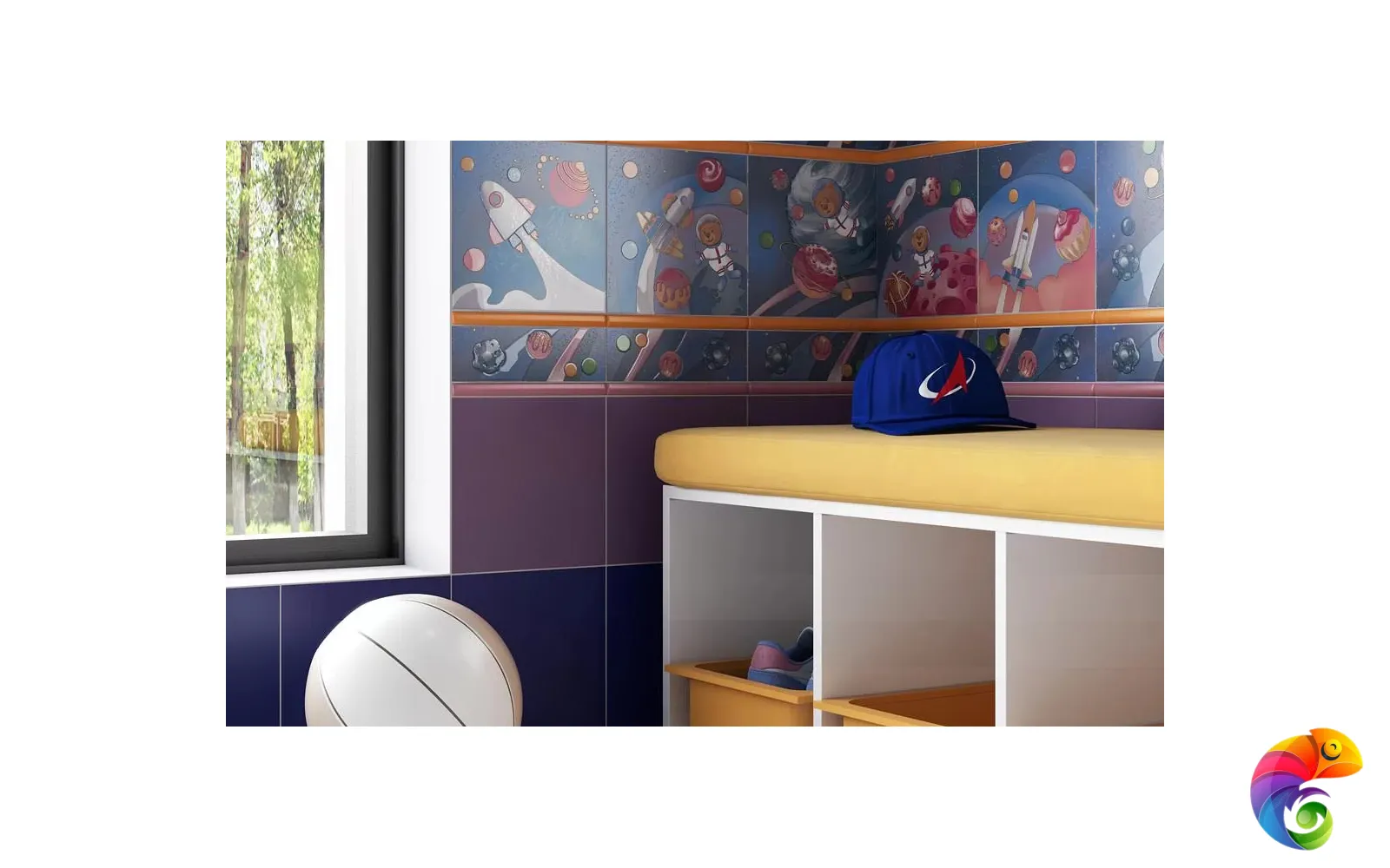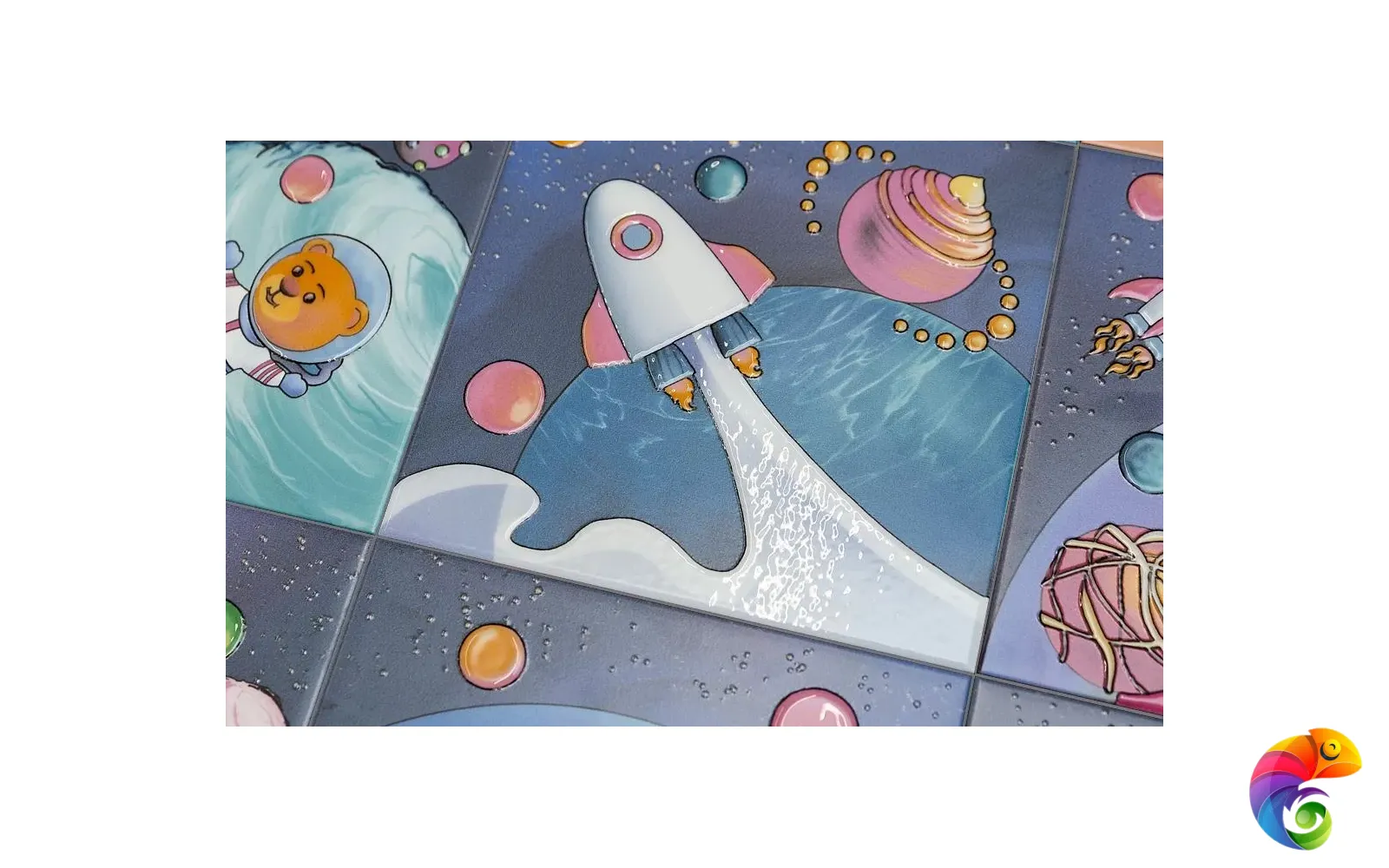 Три, два, один, пуск! Отправляемся в космос вместе с новыми декоративными элементами: здесь много ярких красок, а некоторые планеты похожи на пирожные, посыпанные сахарной пудрой. Изображения занимают всю поверхность плитки и помогают создать необычный акцент в керамической выкладке.