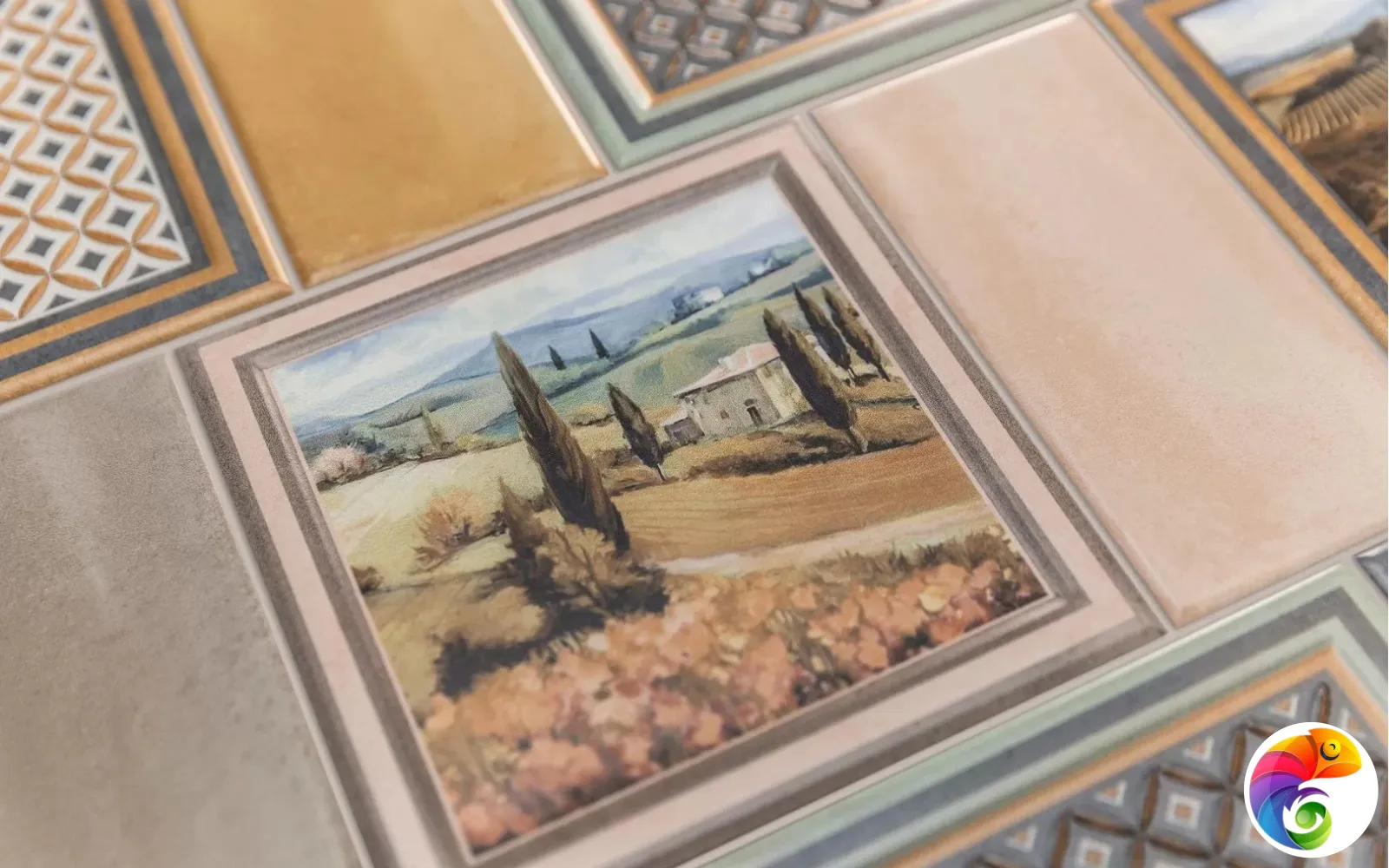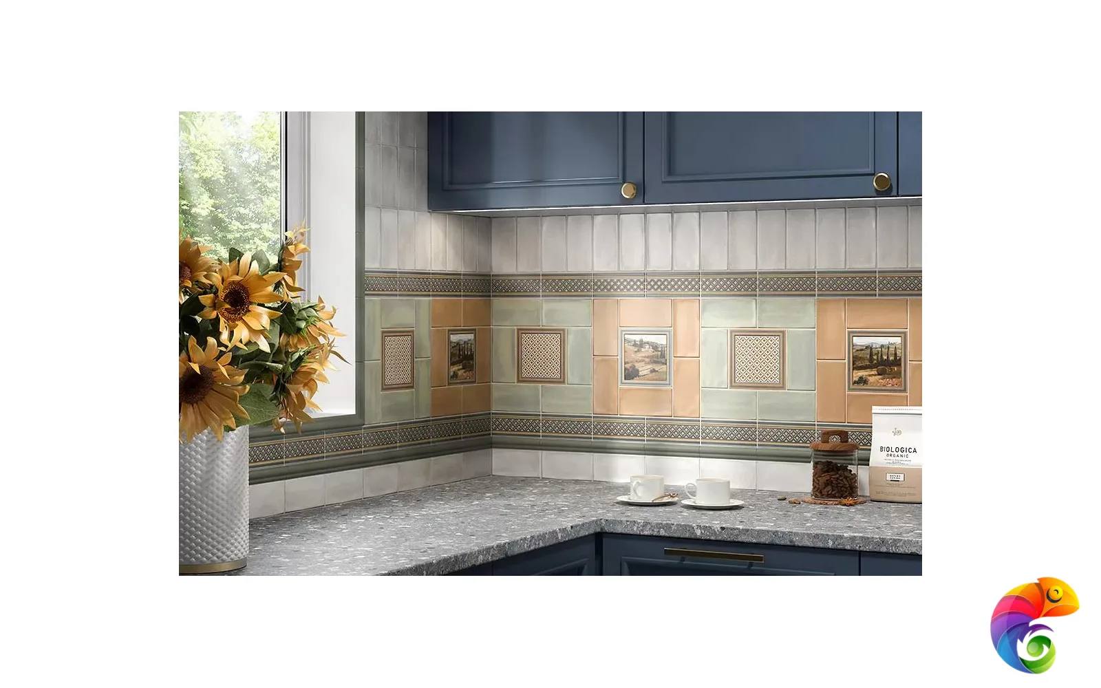 Второй вариант декоров напоминает пейзаж, тоже выполненный со структурой, «обрамляющей» живописные тосканские виды. Эффект влажной кисти позволил получить керамику, будто расписанную вручную итальянским мастером. Такая плитка на кухне точно обогатит отделку, сделает её более индивидуальной.