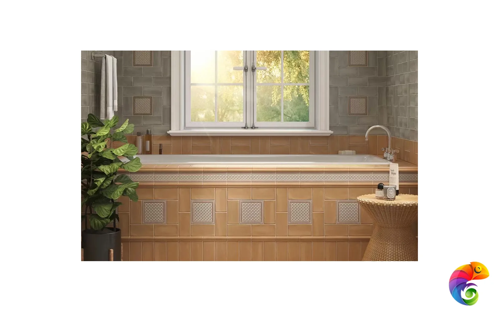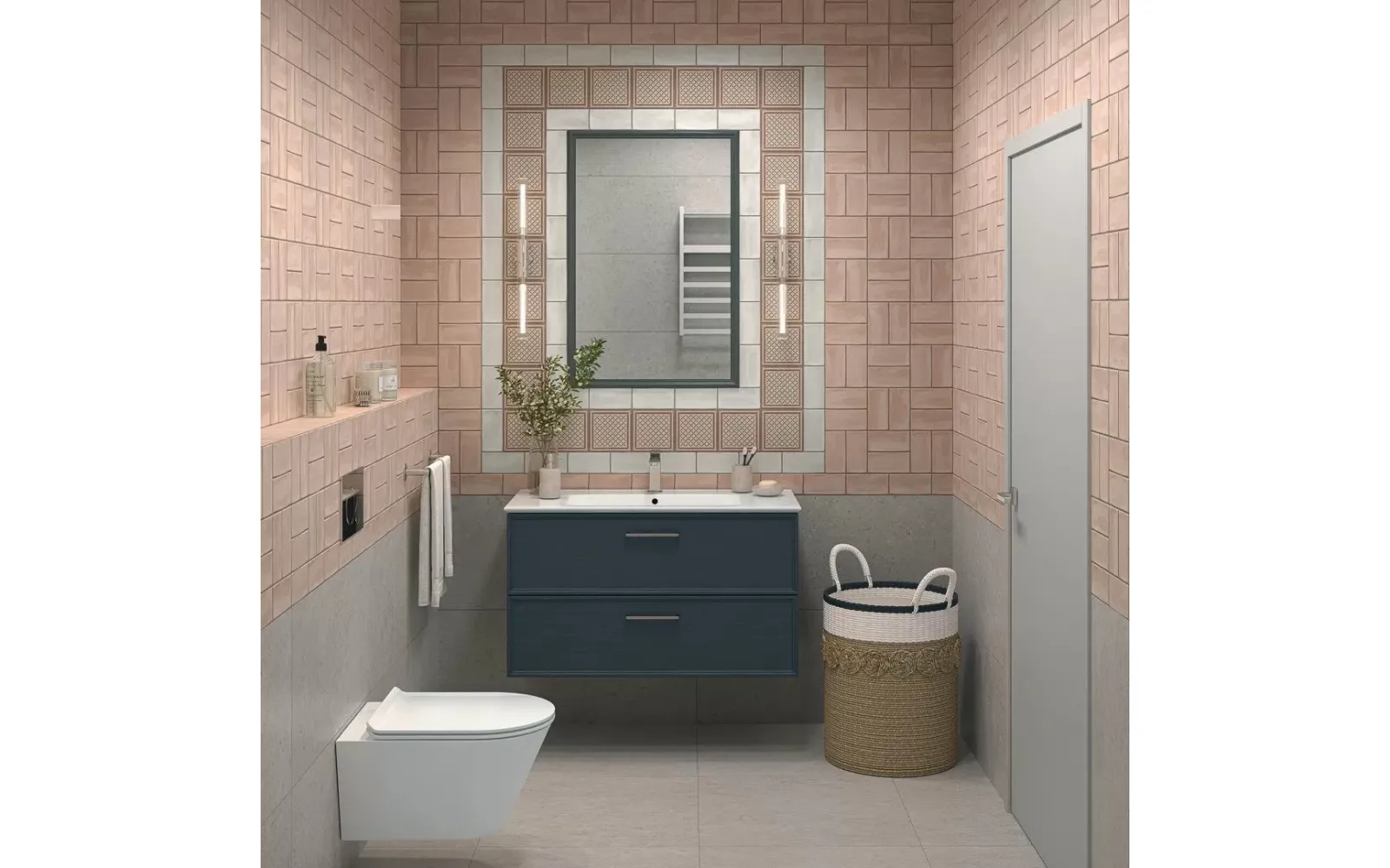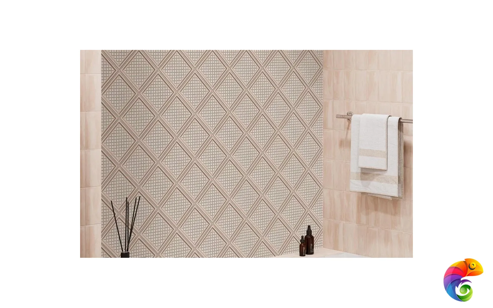 Структурированные элементы 15×15 с узором станут отличным дополнением плитки для ванной комнаты. Обратите внимание на объёмную рамку вокруг паттерна: она соответствует структуре бордюров — это даёт возможность делать ещё более разнообразные керамические раскладки, части которых связаны общим стилем.