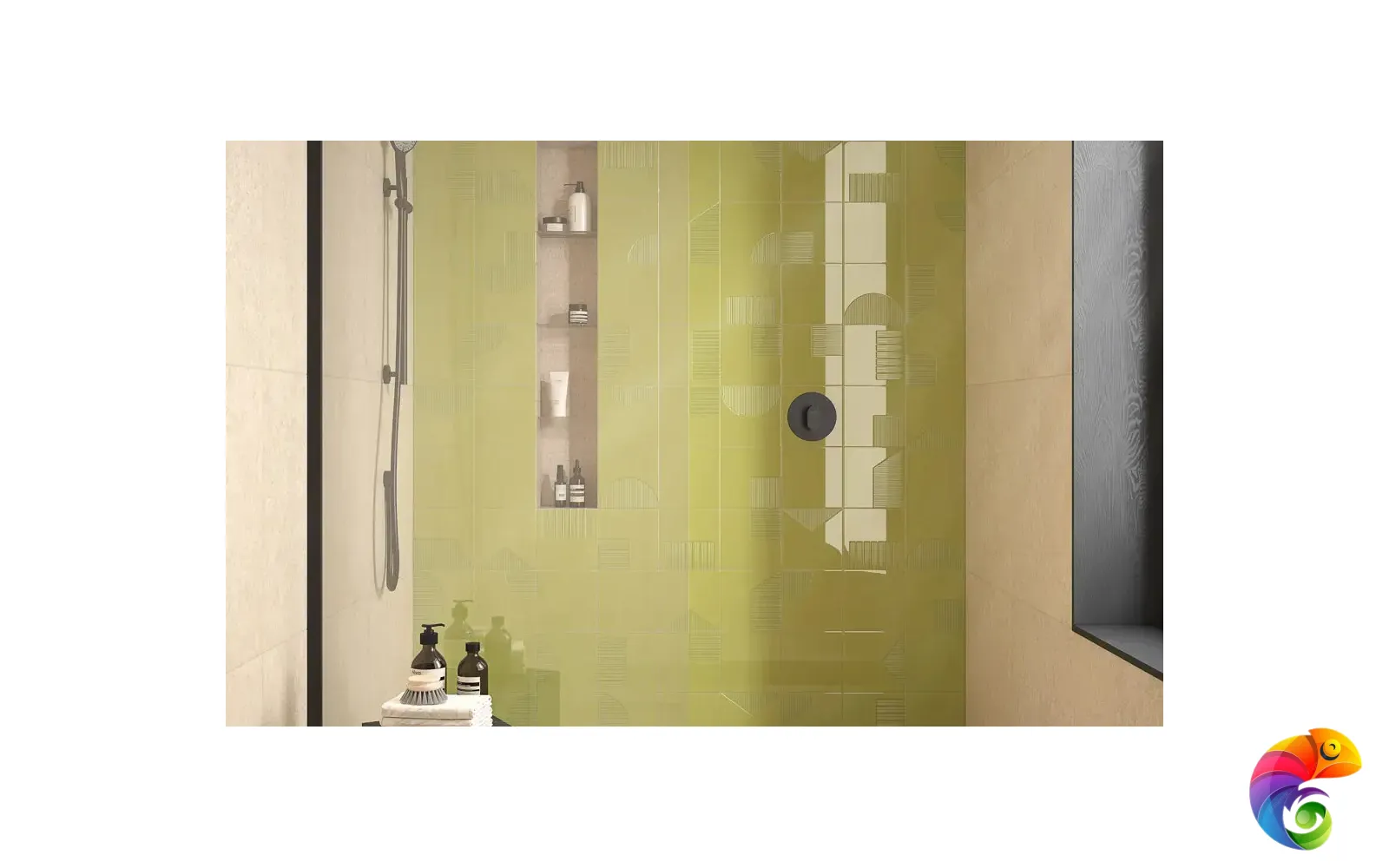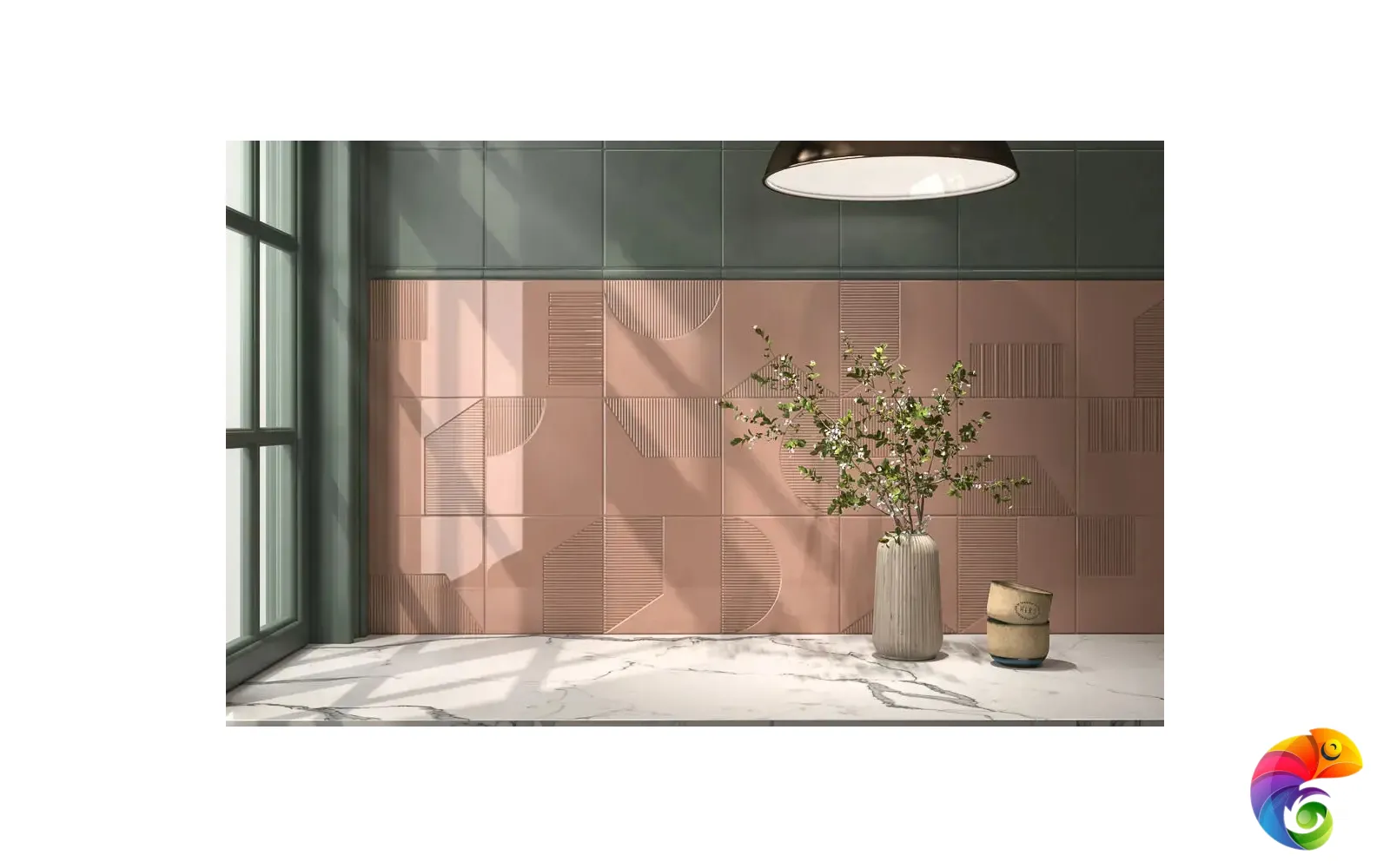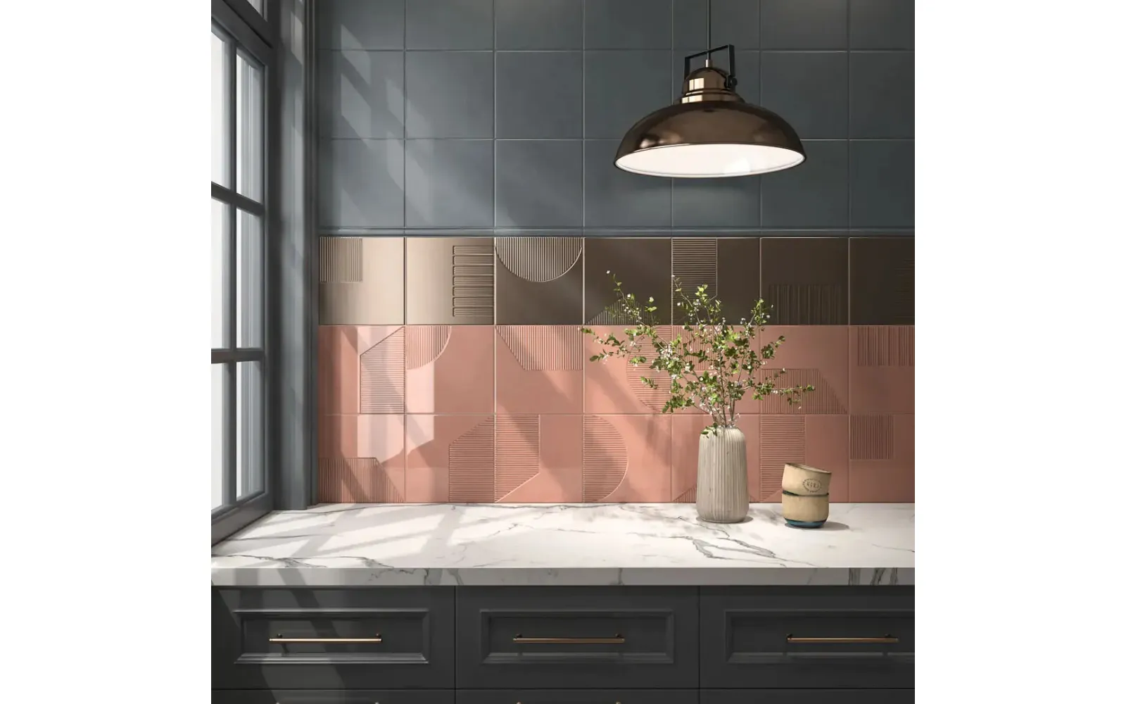 В дополнение к четырём цветам фоновой плитки серия содержит металлизированные декоры с геометрическим рисунком. На выбор — белый металл, напоминающий нержавеющую сталь, и красный, с медными переливами. Для каждого цвета под одним артикулом предложен микс из шести разных структур.