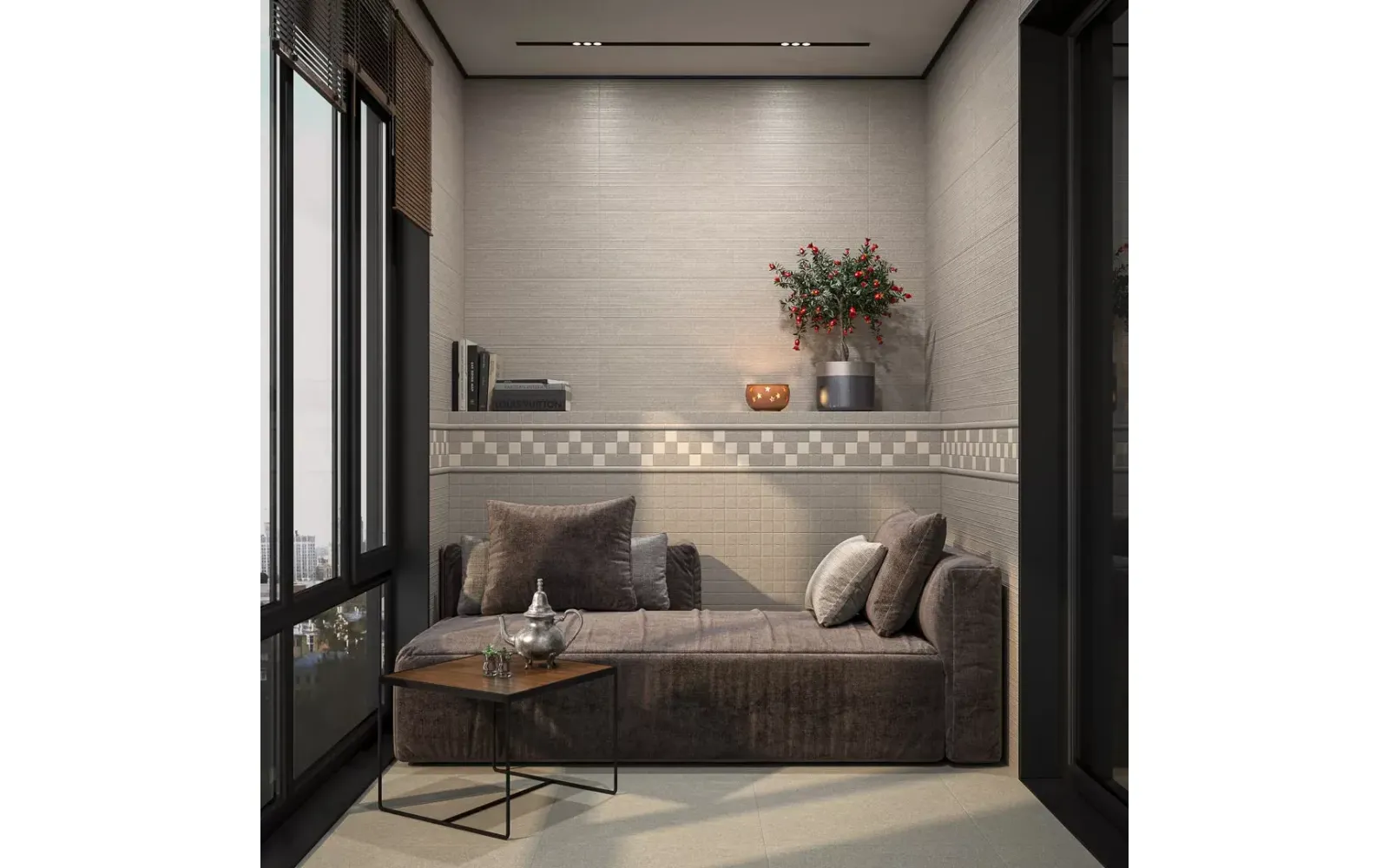 Широкому применению этой серии плитки способствует универсальный формат 30 на 60 сантиметров, подходящий для помещений разной площади. Ректифицированный край керамики позволяет укладывать материал с минимальным швом в 2 мм, создавая эффект цельной бесшовной поверхности. Декоры представлены в виде квадратных мозаичных полотен, выполненных в двух цветах фона. Наличие дополнительных архитектурных элементов, делающих раскладку завершённой, выделяет «Рабат» как комплексное решение для интерьера.