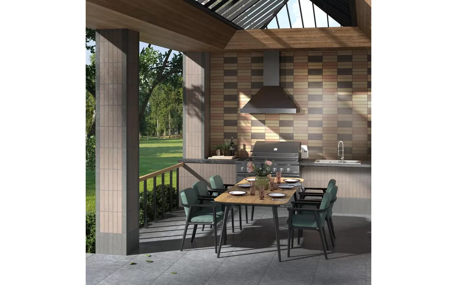 Серия «Роверелла» предлагает несколько популярных форматов керамического камня: от крупных плит для укладки на большие поверхности (119,5×238,5, 60×119,5) до мозаики, с помощью которой можно создавать эффектные бордюры. Применимость серии расширяют керамические ступени, которые сделают дачную лестницу или крыльцо надёжными и эстетичными.