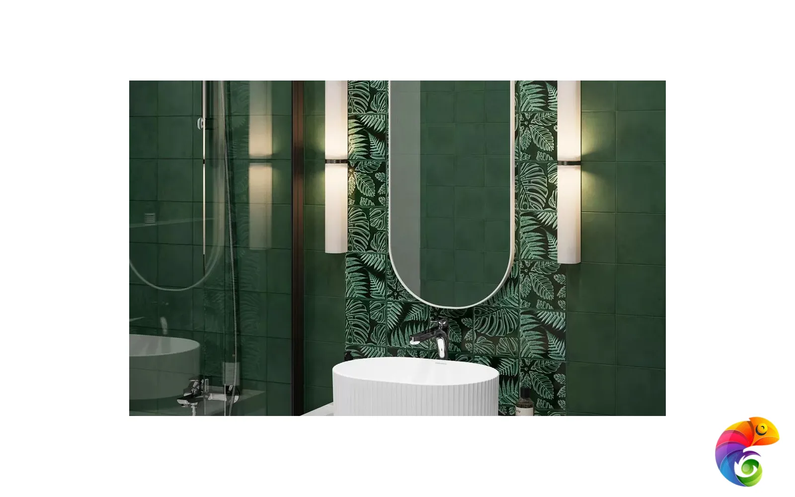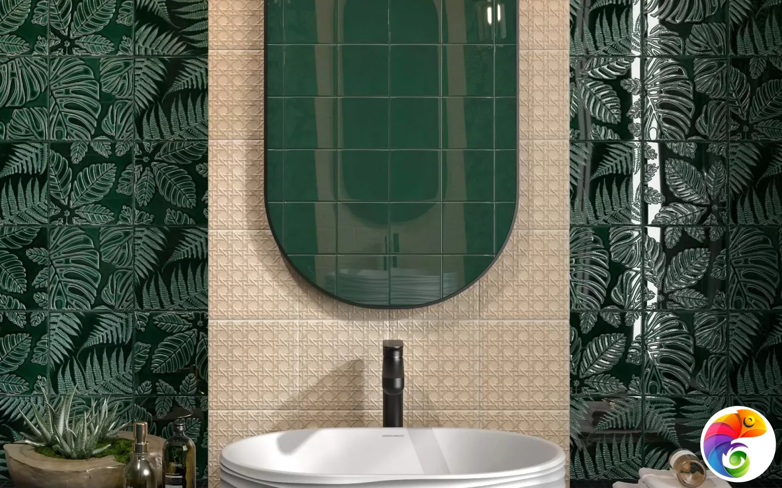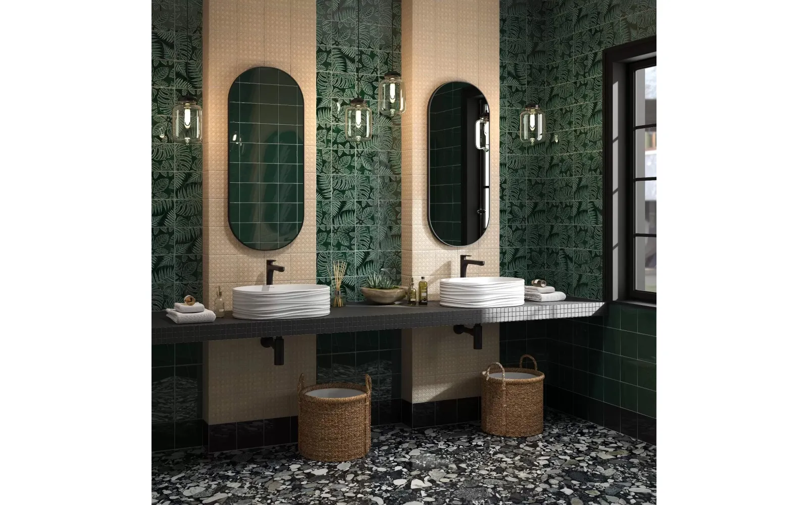Фрагменты лиан и тропических листьев на стене складываются в удивительный изумрудный ковёр, который можно дополнить тонким бордюром или керамическим багетом «Граньяно». Подобная выкладка также отлично сочетается с деревянными бордюрами и плиткой серии «Навильи» 15×15, воспроизводящей рисунок дерева и ротанговое плетение в популярной стилистике «каннаж».