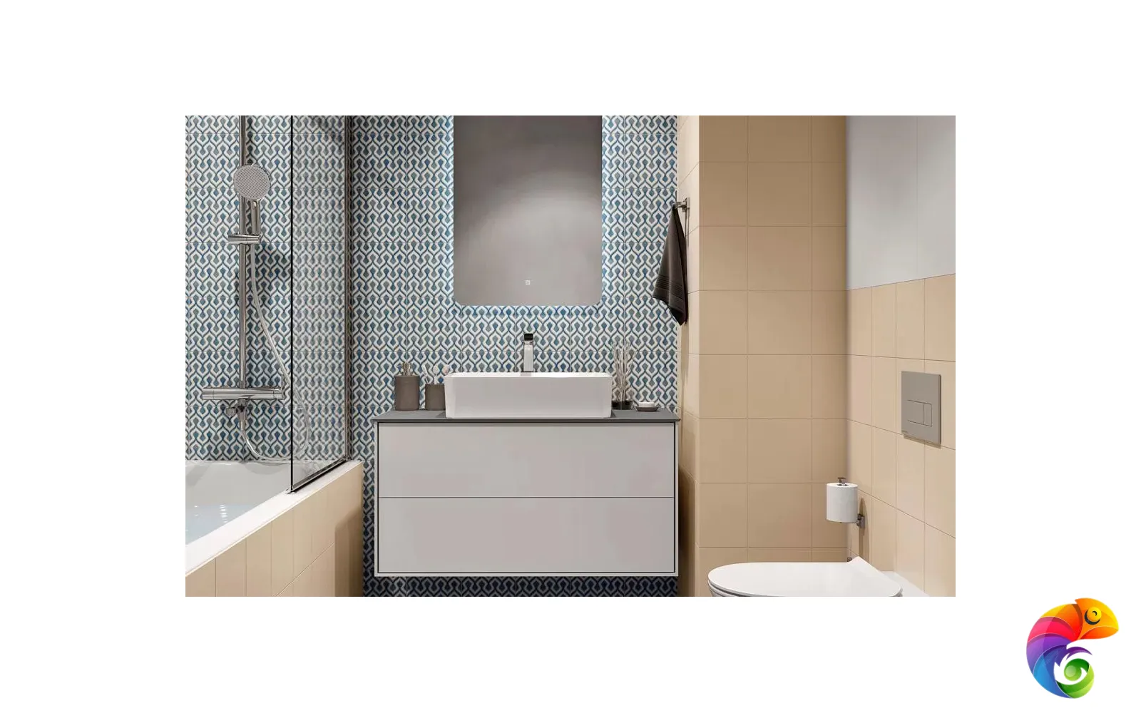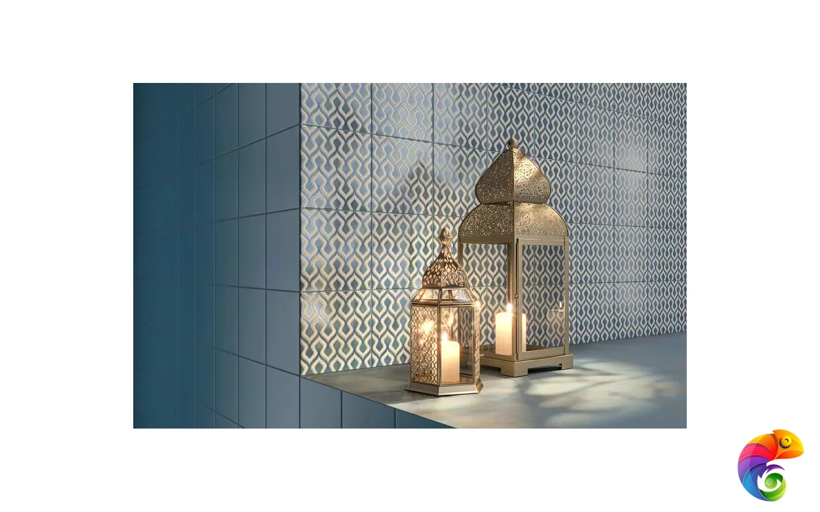 В цветовой гамме серии «Шавен» оттенки лазурного соседствуют с несколькими другими цветами, в том числе белым и бирюзовым. Это позволяет успешно использовать такие декоративные элементы в раскладках с моноколорами «Калейдоскоп» формата 20×20. Белый матовый состав, нанесённый на поверхность плитки, придаёт орнаментальному рисунку объём и делает графику серии выразительнее.