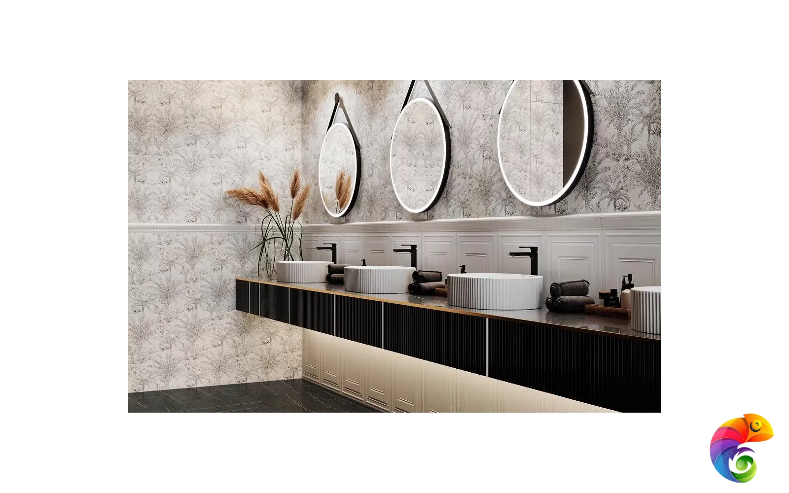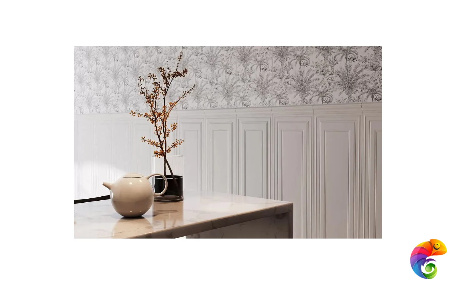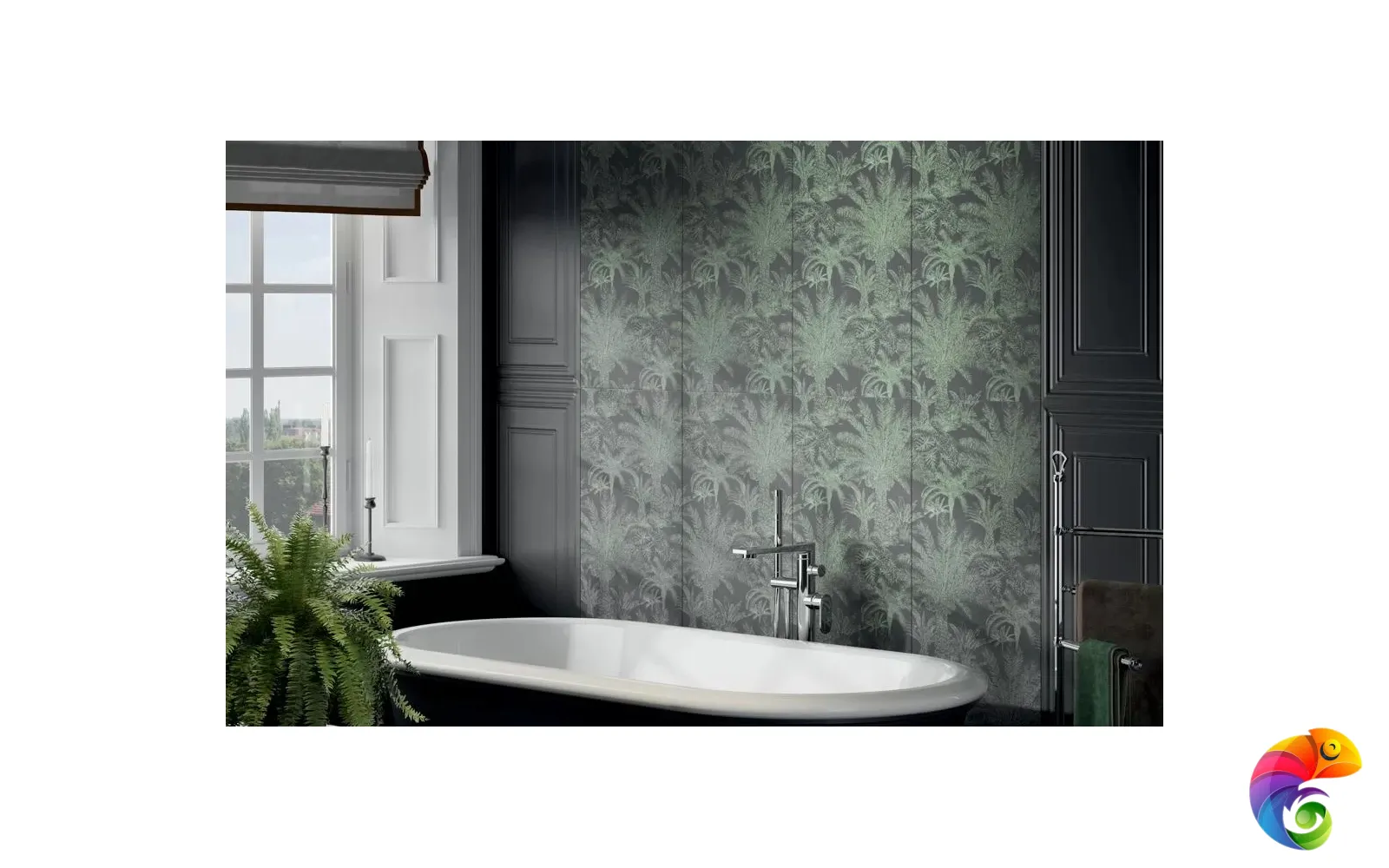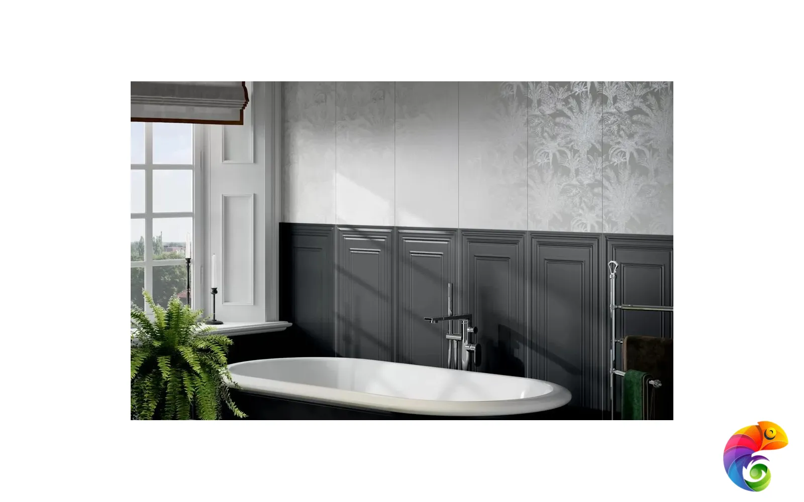 Ахроматические цвета предполагают сочетания с любыми другими цветами. Особенно выигрышно рядом с однотонной черной и белой плиткой будет смотреться серебристый металл. На фоне матовой черной плитки заиграет блеск золота. В линейке присутствует плитка со структурой буазери — классических стеновых панелей с филёнчатой декоративной отделкой. Керамические панели буазери идеально впишутся в классические и неоклассические интерьеры. Непревзойдённый дизайн тропического леса поверх матовой плитки очаровывает изумрудной зеленью. На черном фоне растительность будто бы меняет то оттенки, то насыщенность в зависимости от ракурса. Эффект создаётся посредством металлизированных красок и составов, преломляющих свет, открывая уникальную возможность эксперимента в рамках стиля фьюжн или утонченного ар-деко.
