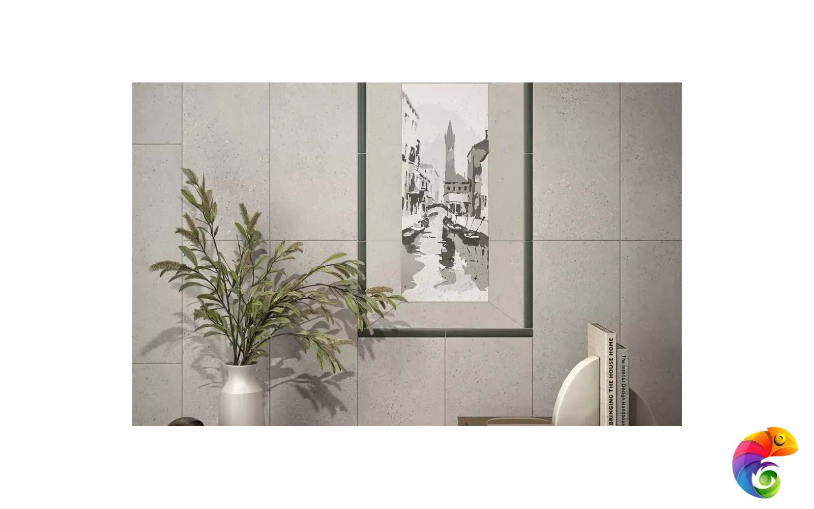 Тот же рисунок — и на структурированных декорах, куда в разрыв паттерна добавлен блестящий состав. Его неоднородный цвет с переливами делает керамическую композицию более эффектной. Также в серии есть декор с классическим венецианским пейзажем в монохромной гамме: эту стилизацию можно вписать в интерьер, решённый в любой цветовой палитре.