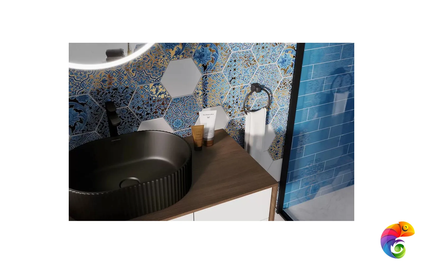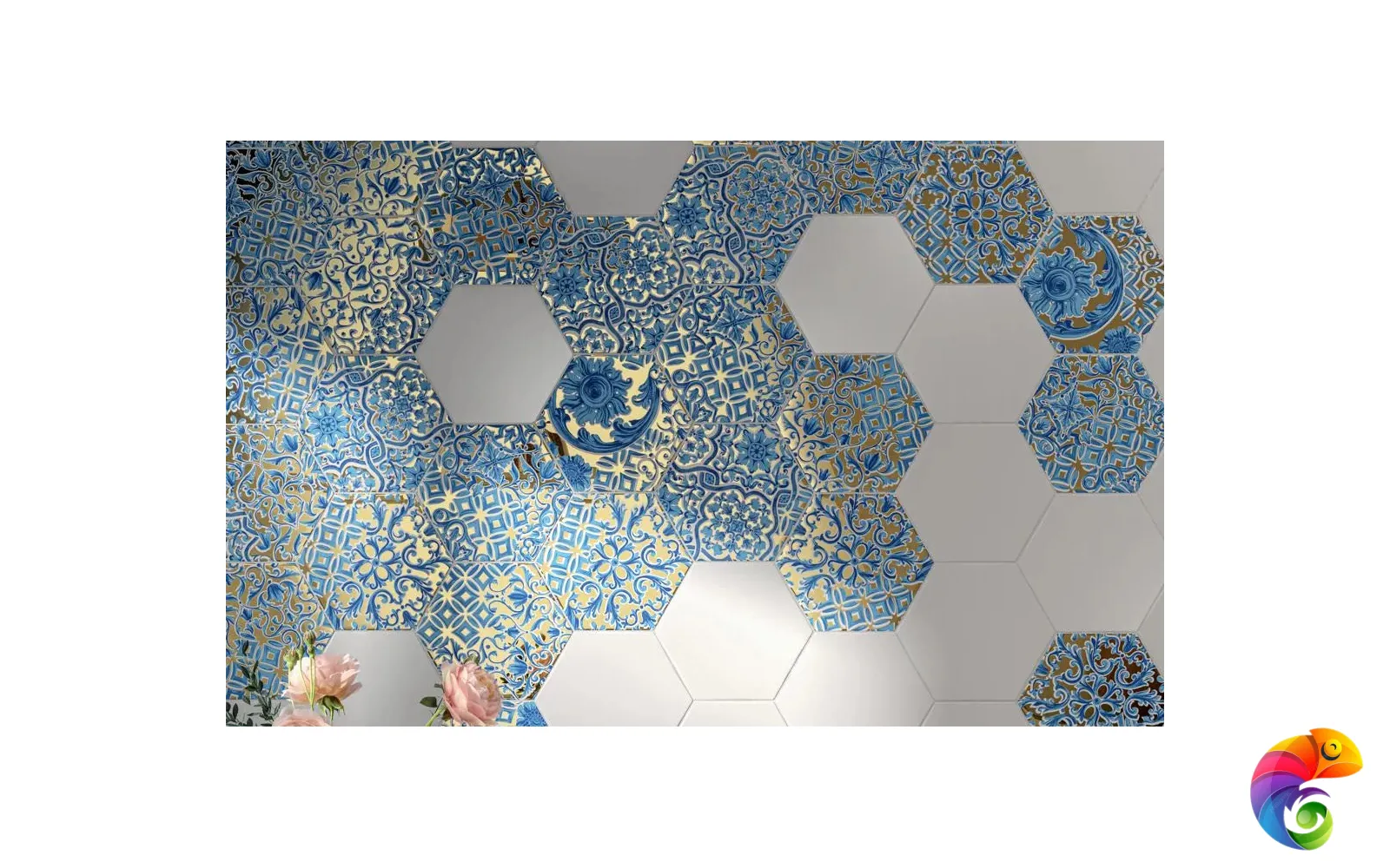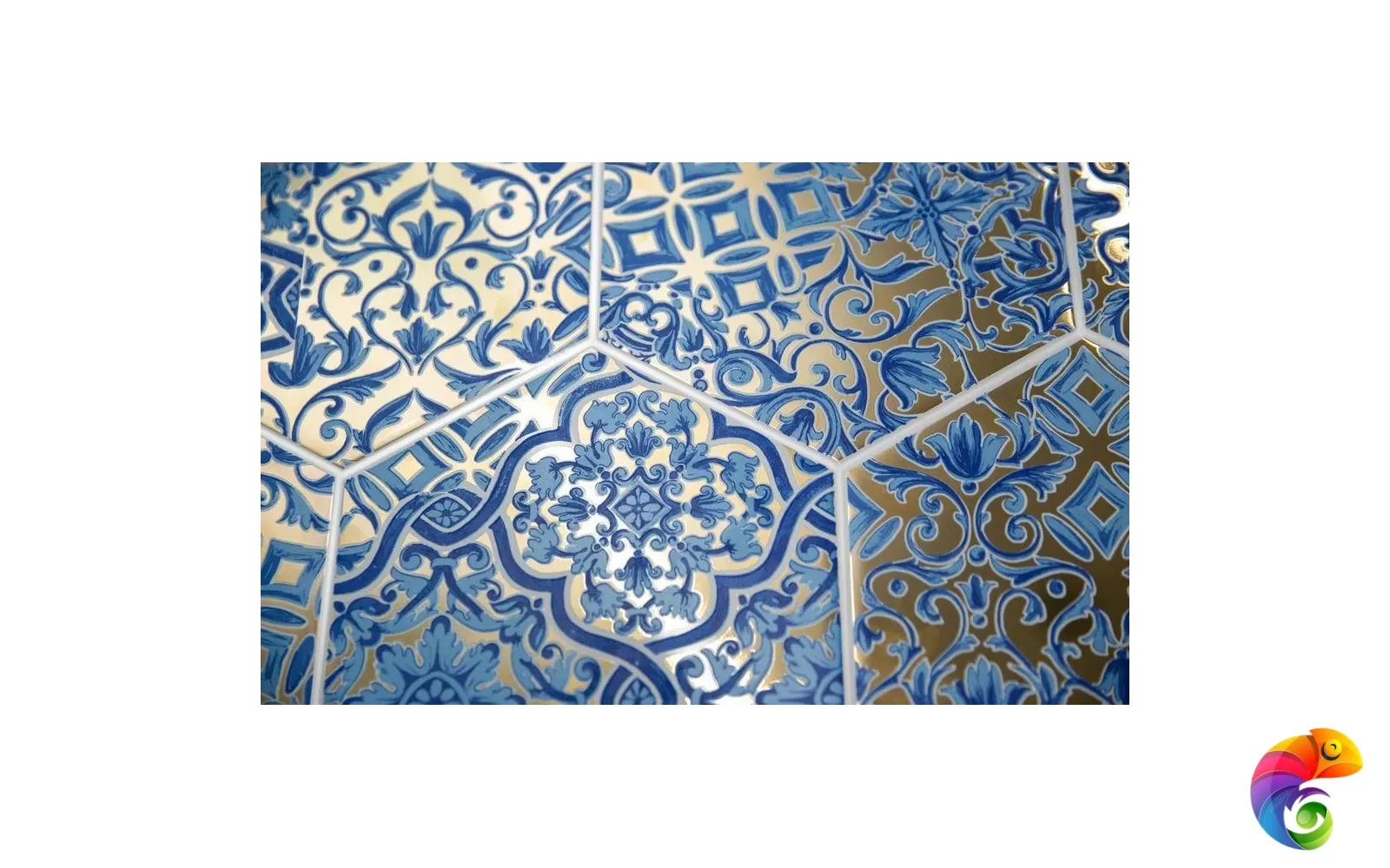 Декоративный вклад Португалии в мировое наследие — не только азулежу, но и «талья дорада»: особая техника создания деревянных элементов отделки, в которой преобладает блеск сусального золота. Шестиугольная плитка 20×23 см выполнена с применением драгоценного золотого состава и дополнена эффектными орнаментами небесно-голубых тонов. Подобное сочетание на стене выглядит необычно и очень красиво.
