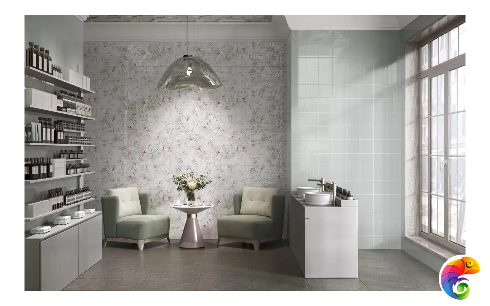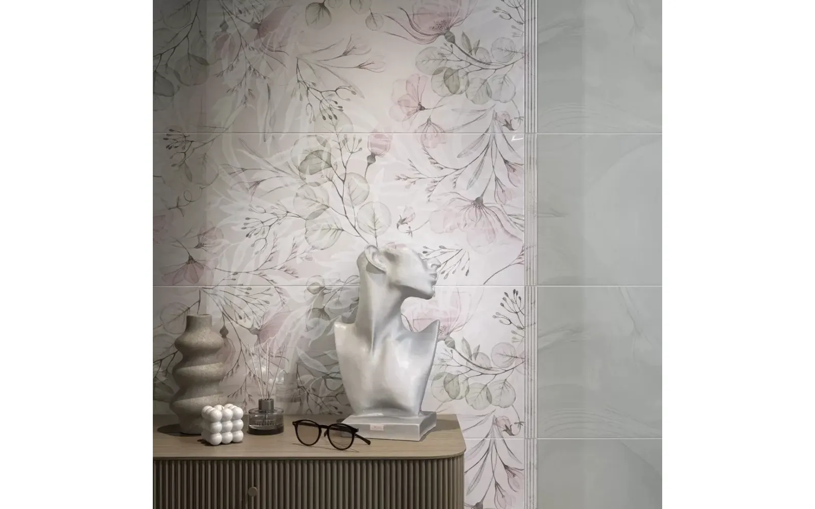 На декорах, выполненных в той же гамме, применён эффект мерцающего узора: его фрагменты то проявляются, то исчезают в зависимости от освещения. К тому же в серии есть панно, состоящее из двух форматов 40×120 с флористическим сюжетом. Плитка с цветами, популярность которой не угаснет со временем, станет настоящим украшением кухни, столовой или одного из жилых помещений.