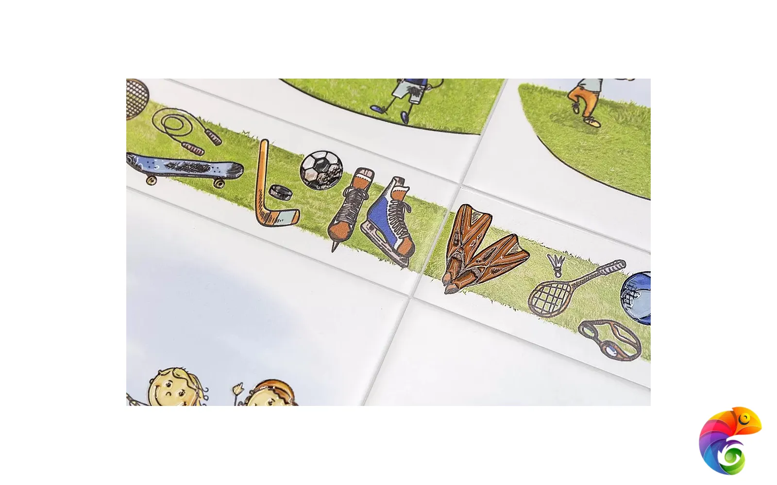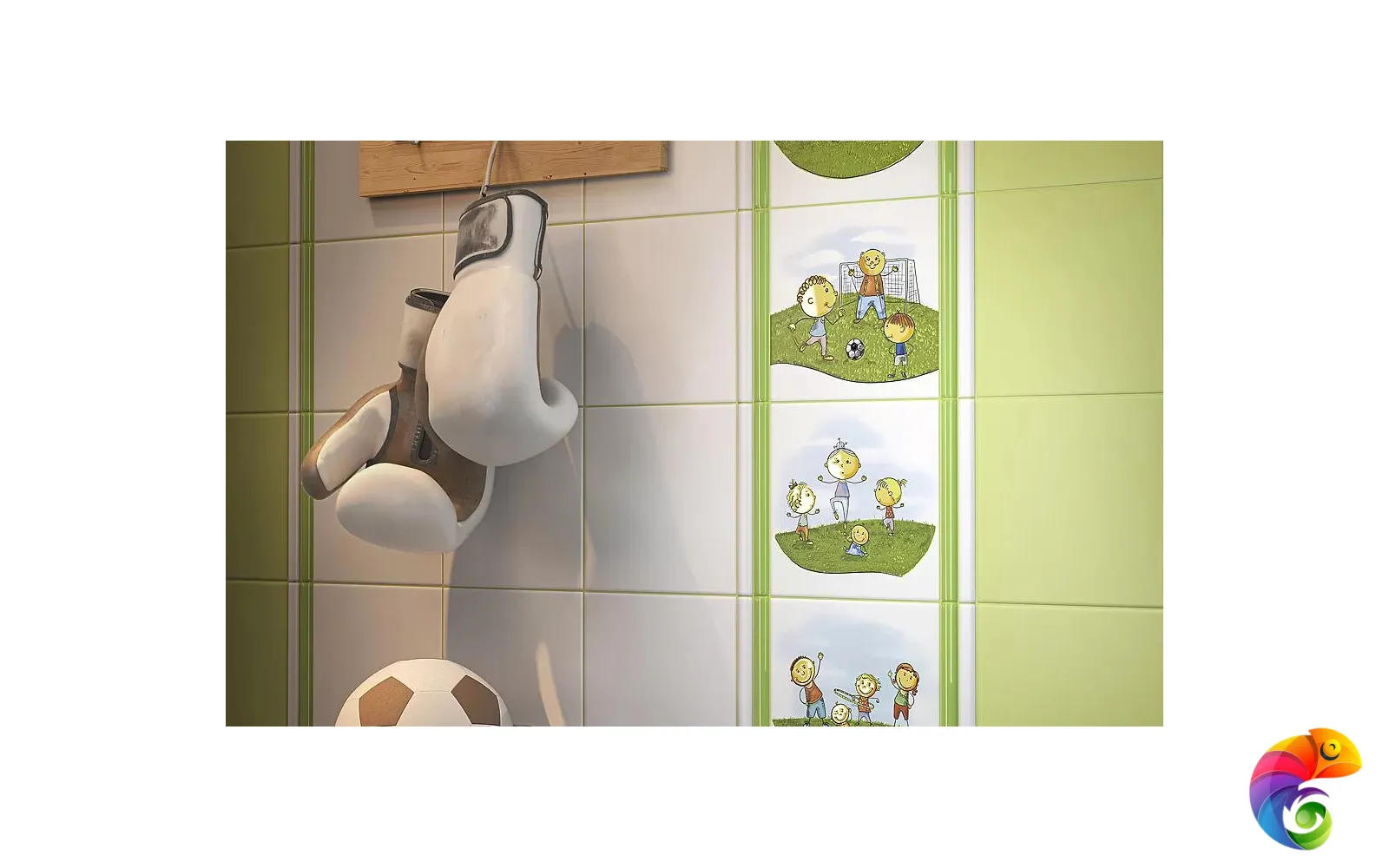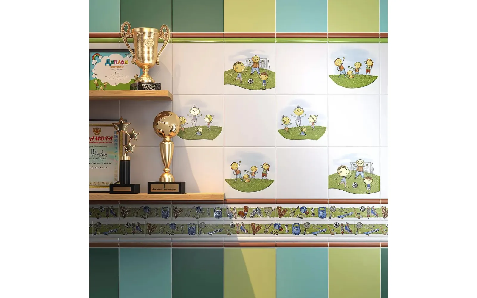Заниматься спортом всей семьёй – отличная идея! Это так же здорово, как использовать в керамической композиции эти декоры с энергичными сюжетами. Они выполнены на матовой плитке, при этом сами рисунки покрыты слоем глазури для придания блеска и дополнительного объёма.