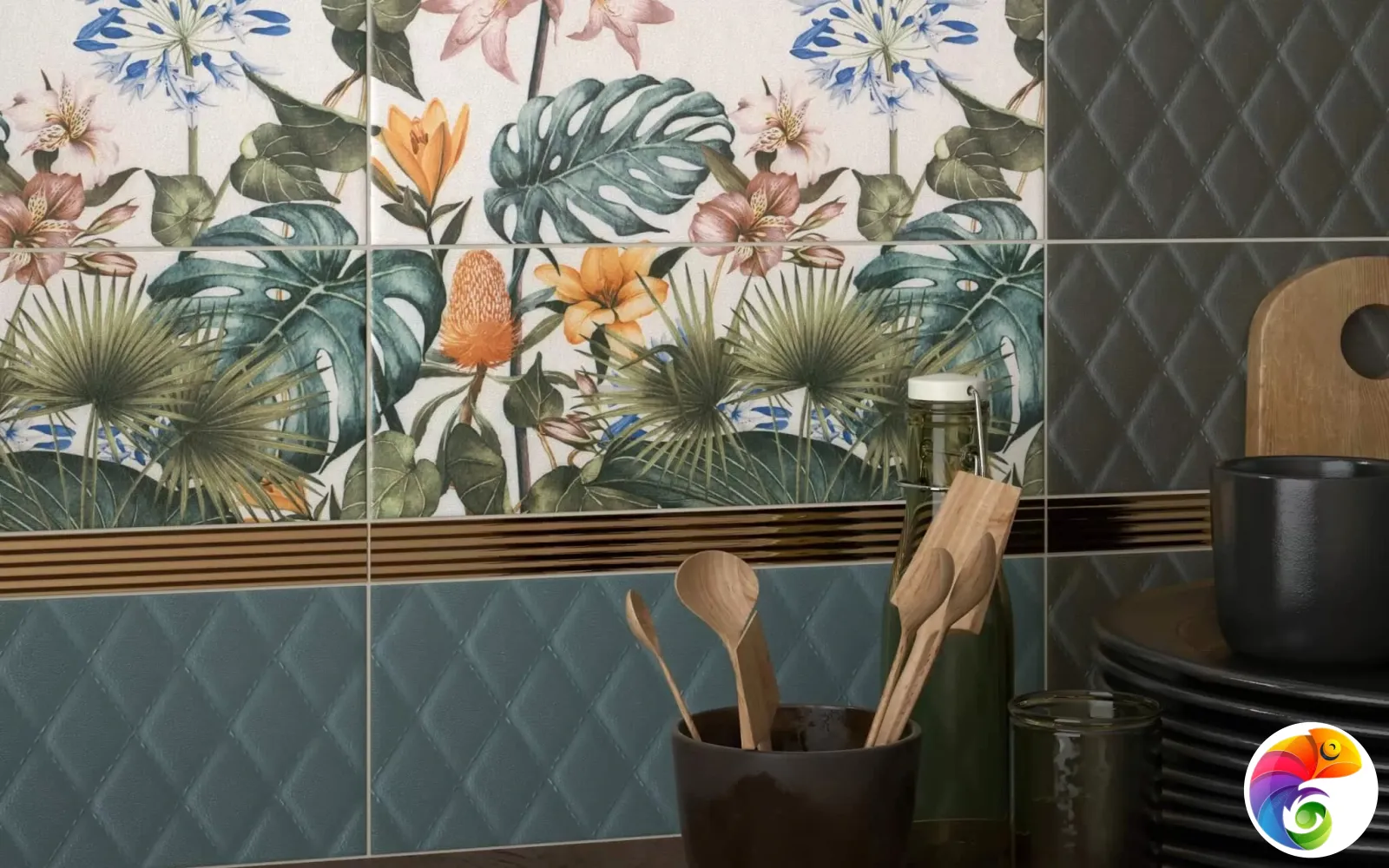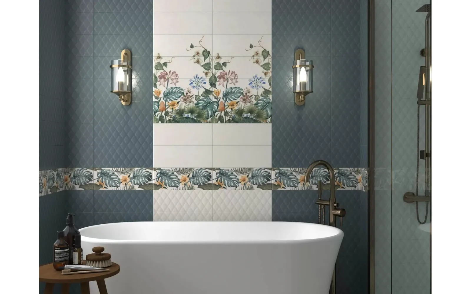Серия с выраженной фактурой зернистой кожи. Базовая плитка с новой «стёганой» структурой выполнена в четырёх благородных оттенках. Акцентом на этом фоне станет составное керамическое панно и декор с тропическим рисунком. Сделать решение еще более стильным поможет структурированный бордюр оттенка состаренного металла.
