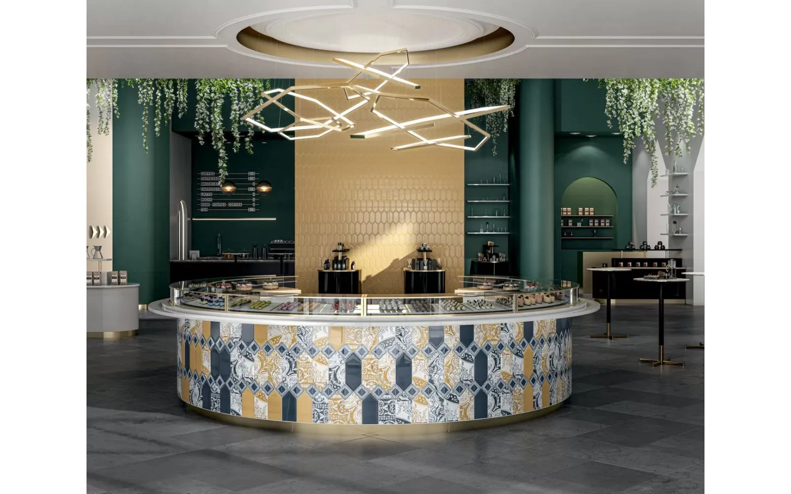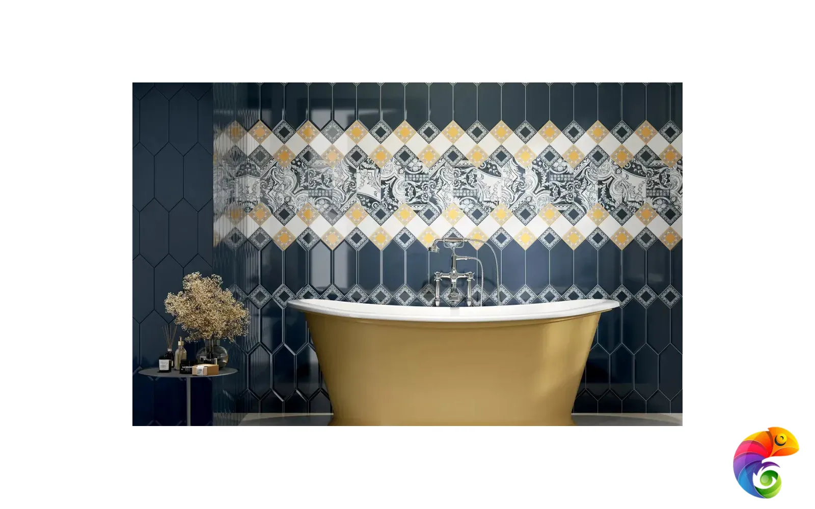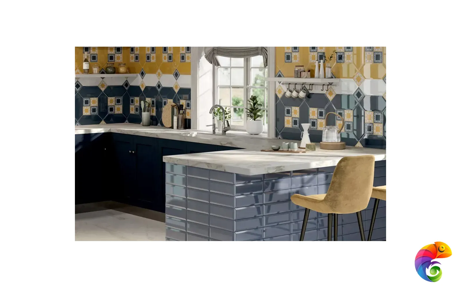 Помимо синей плитки и декоров, в серии представлена жёлтая плитка: её тёплый оттенок напоминает окраску знаменитых лиссабонских трамваев. Вариантов раскладки фоновой и декоративной плитки нового шестиугольного формата на стене — по-настоящему много, учитывая синие и жёлтые вставки 9,8×9,8 см.