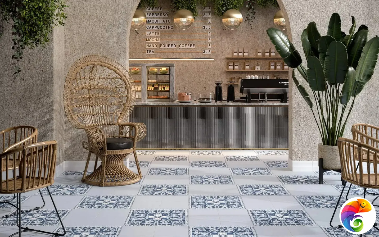 Декоративные элементы, аналогичные по цвету настенной плитке, предлагаются и для напольной укладки. Керамогранит 30×30 см с узорчатым рисунком образует экзотический ковёр. На полу его можно сочетать с белым керамическим гранитом серии «Гармония».