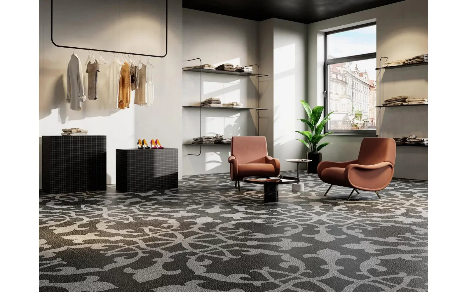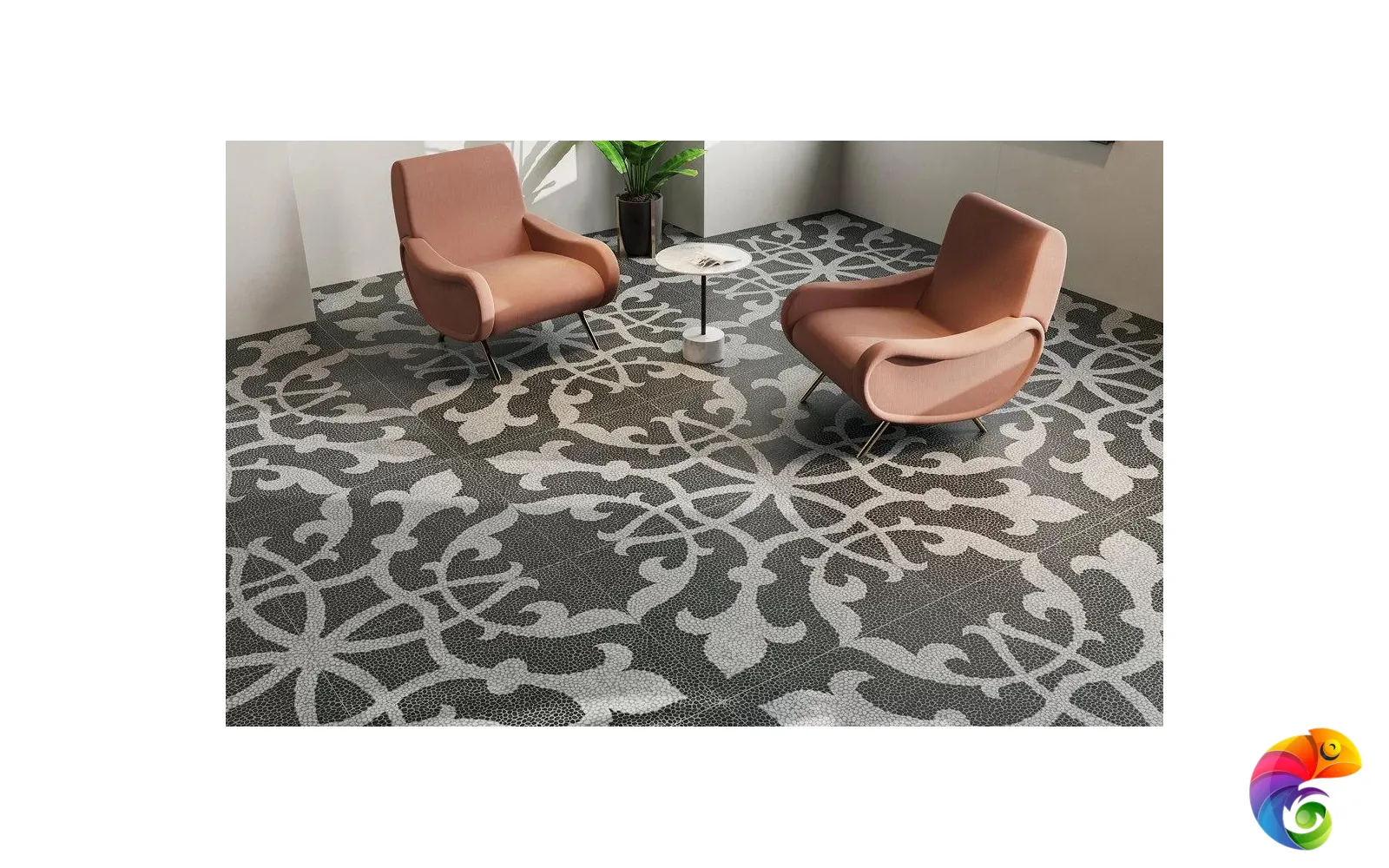 Крупный орнамент с элементами флер-де-лис — геральдической лилии — воспроизведен в технике каменной мозаики. Создать легкий рельеф на поверхности керамического гранита позволило сухое декорирование Dry Fix. Элементы рисунка стыкуются между собой, позволяя продолжать узор в любом направлении. Продукт устойчив к глубокому истиранию и может быть использован даже в общественном пространстве с интенсивным трафиком.