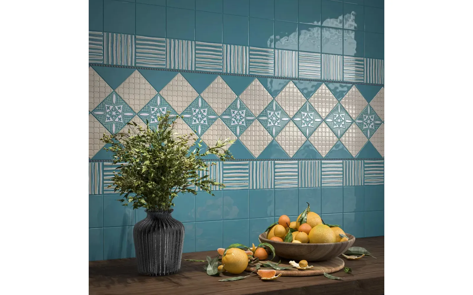 Оформить интерьер под стать атмосфере дворцовых покоев поможет керамическая композиция с серией «Бахия». Фоновая плитка с текстурой глянцевой майолики для удобства укладки собрана в прямоугольные полотна из 12 квадратов формата 9,8×9,8. Плитка насыщенных оттенков — зелёного и бирюзового — сделает интерьер выразительнее и отлично подойдёт для современного или средиземноморского стиля. Керамическое покрытие в бежевых тонах идеально дополнит более сдержанные интерьеры — от современных минималистичных пространств до уютных ванных комнат в духе неоклассики или прованса.