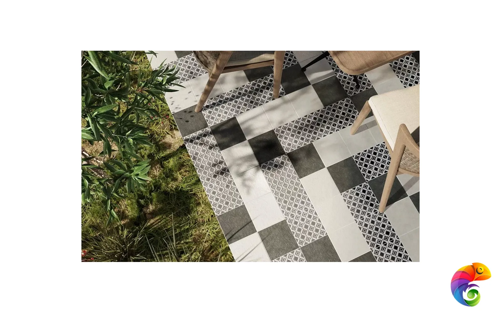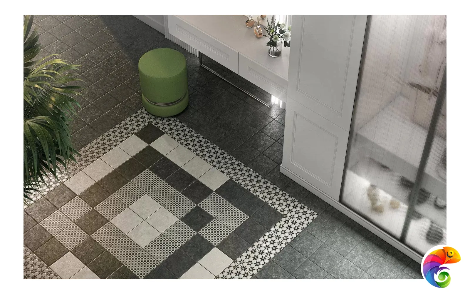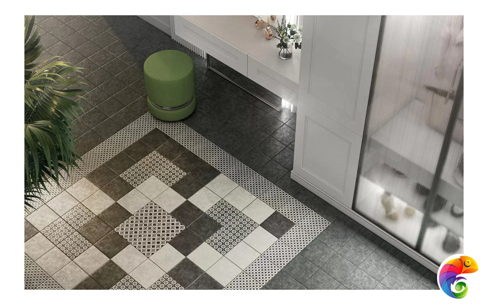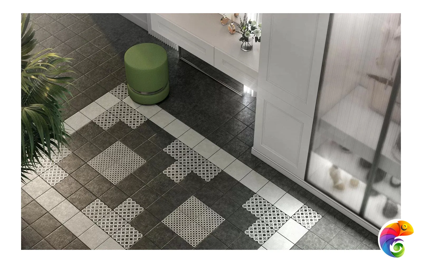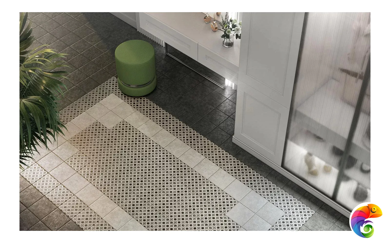 Сочетание черного и белого – безусловная классика, но в подобном исполнении и с такой графикой она выглядит очень современно. База и декоры выполнены в формате 20х20 см. Декоративные элементы решены методом цифровой печати: с её помощью точно воссоздан рисунок двухцветной мраморной инкрустации.
