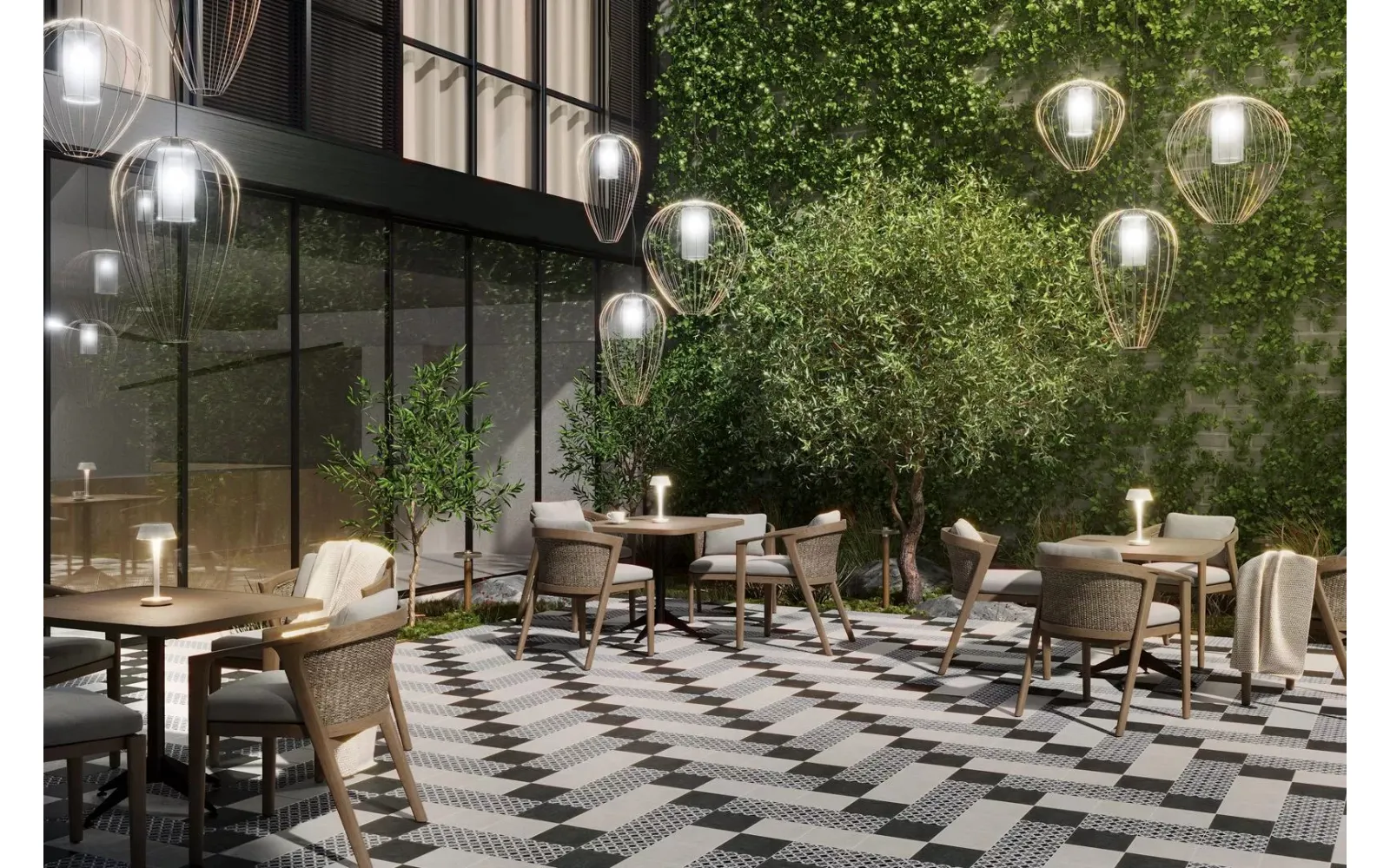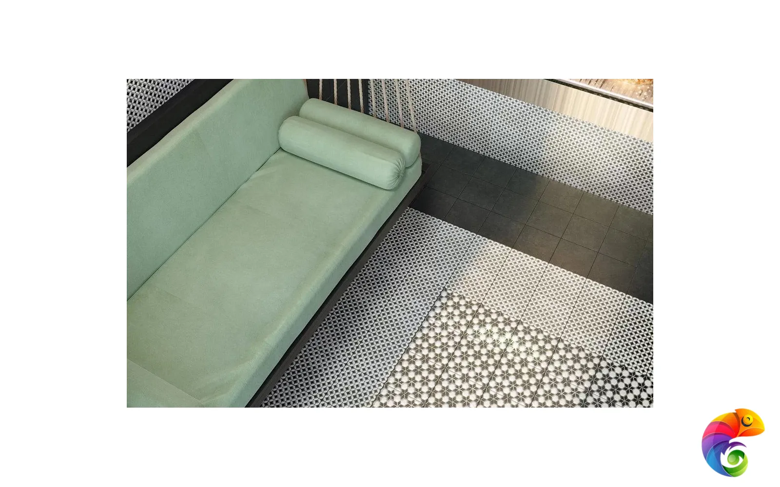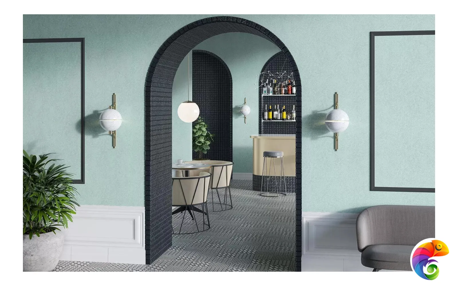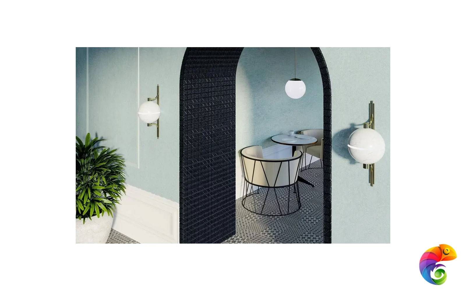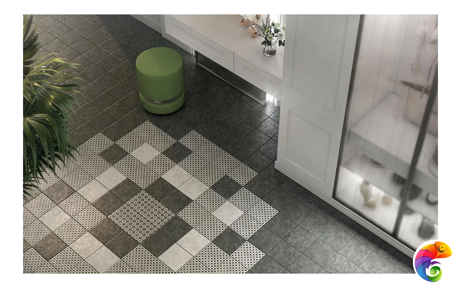 Сочетание черного и белого – безусловная классика, но в подобном исполнении и с такой графикой она выглядит очень современно. База и декоры выполнены в формате 20х20 см. Декоративные элементы решены методом цифровой печати: с её помощью точно воссоздан рисунок двухцветной мраморной инкрустации.