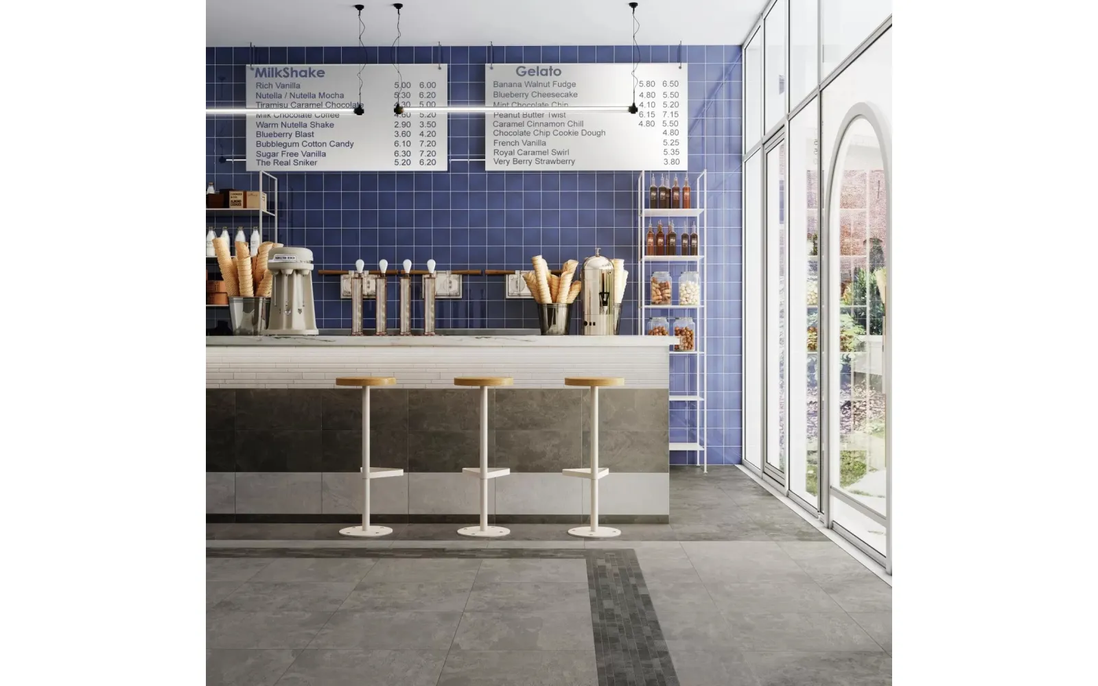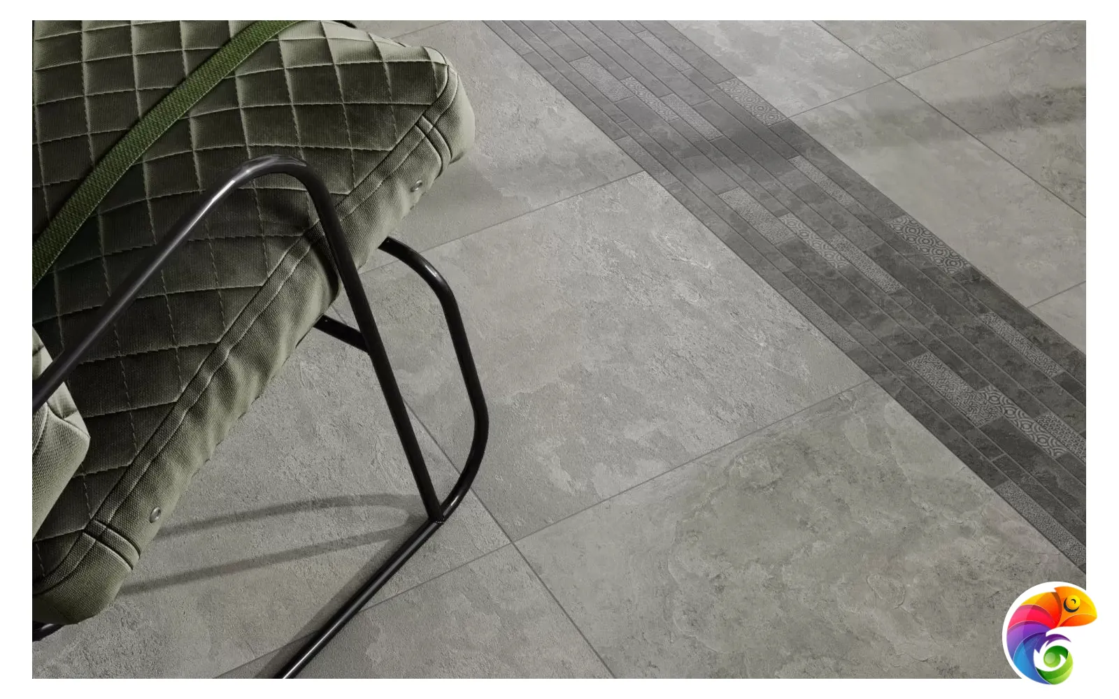 Реалистичная поверхность природного сланца запечатлена в керамическом граните трёх цветов. Идею слоистой каменной структуры поддерживает мозаика с удлинёнными элементами разной толщины: такая форма напоминает характерную кладку из сланца. Отдельные чипы мозаики украшены геометрическим орнаментом — это вносит в дизайн модную нотку.