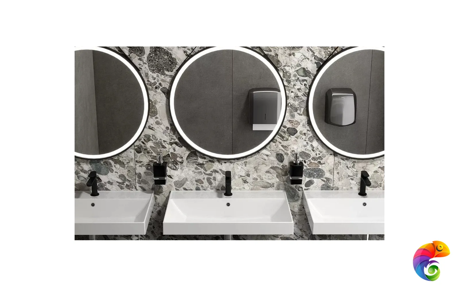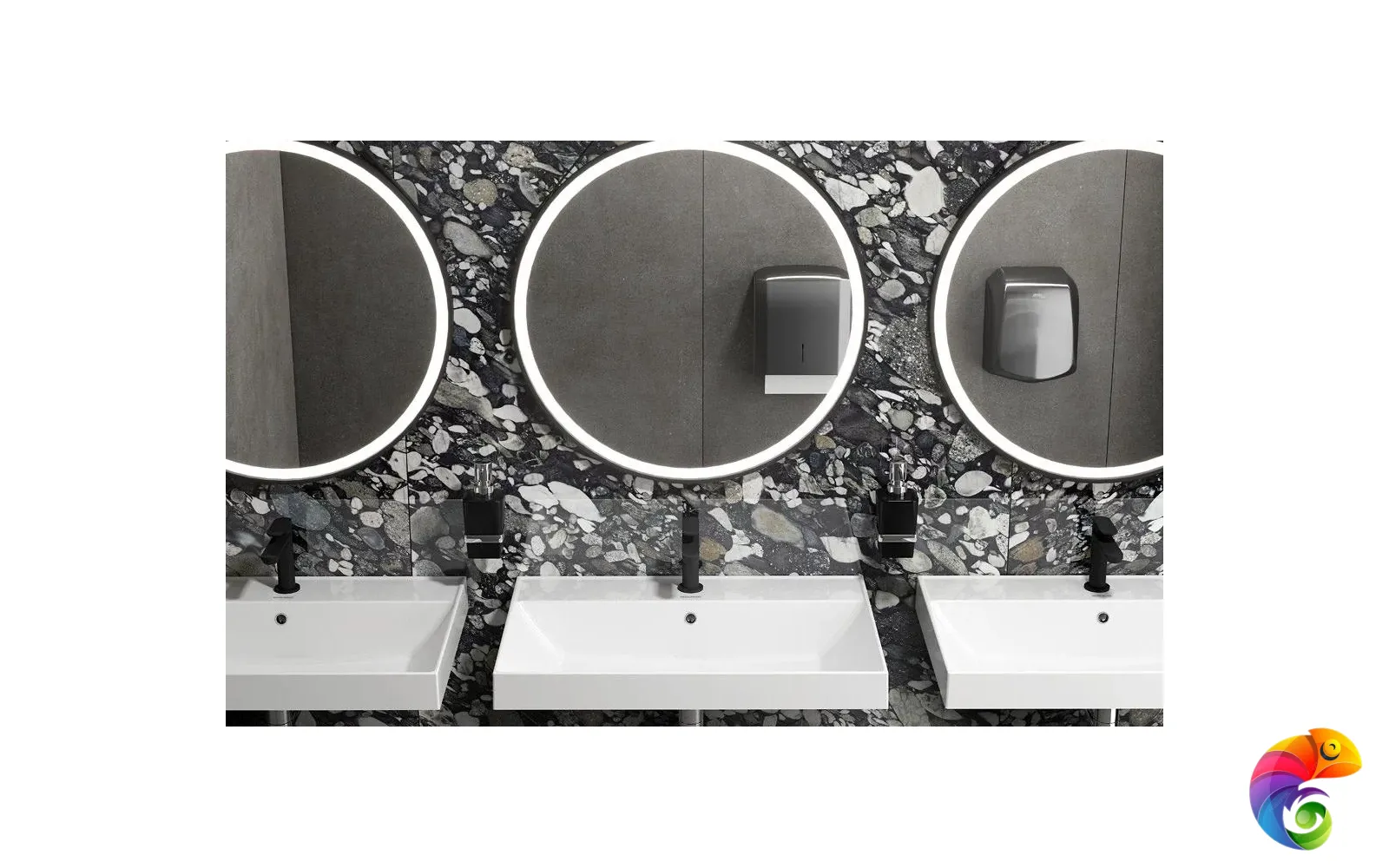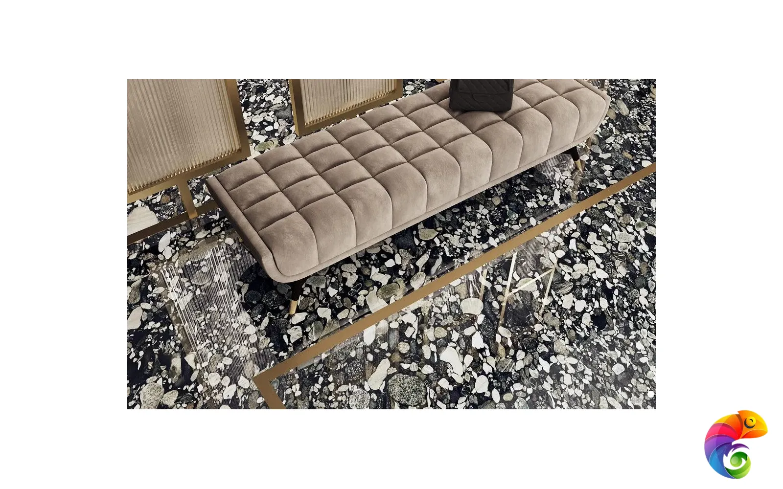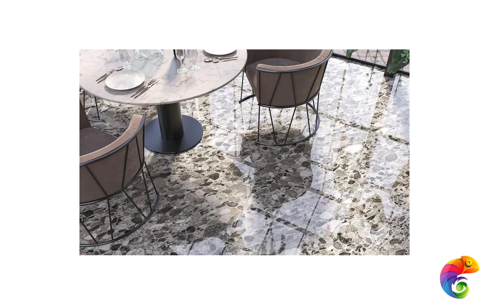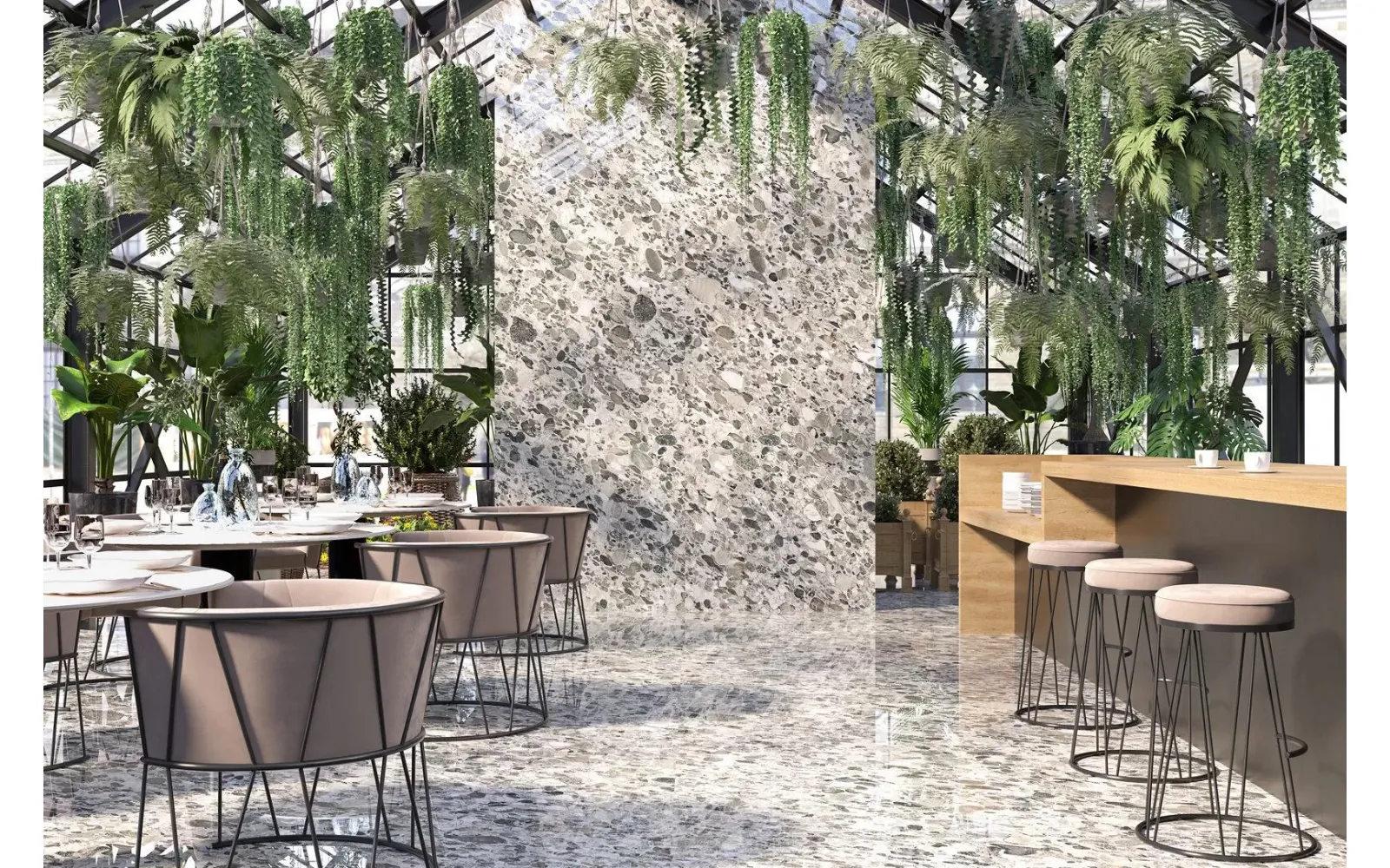 Керамический гранит передаёт выразительную текстуру камня со светлыми и темными вкраплениями.