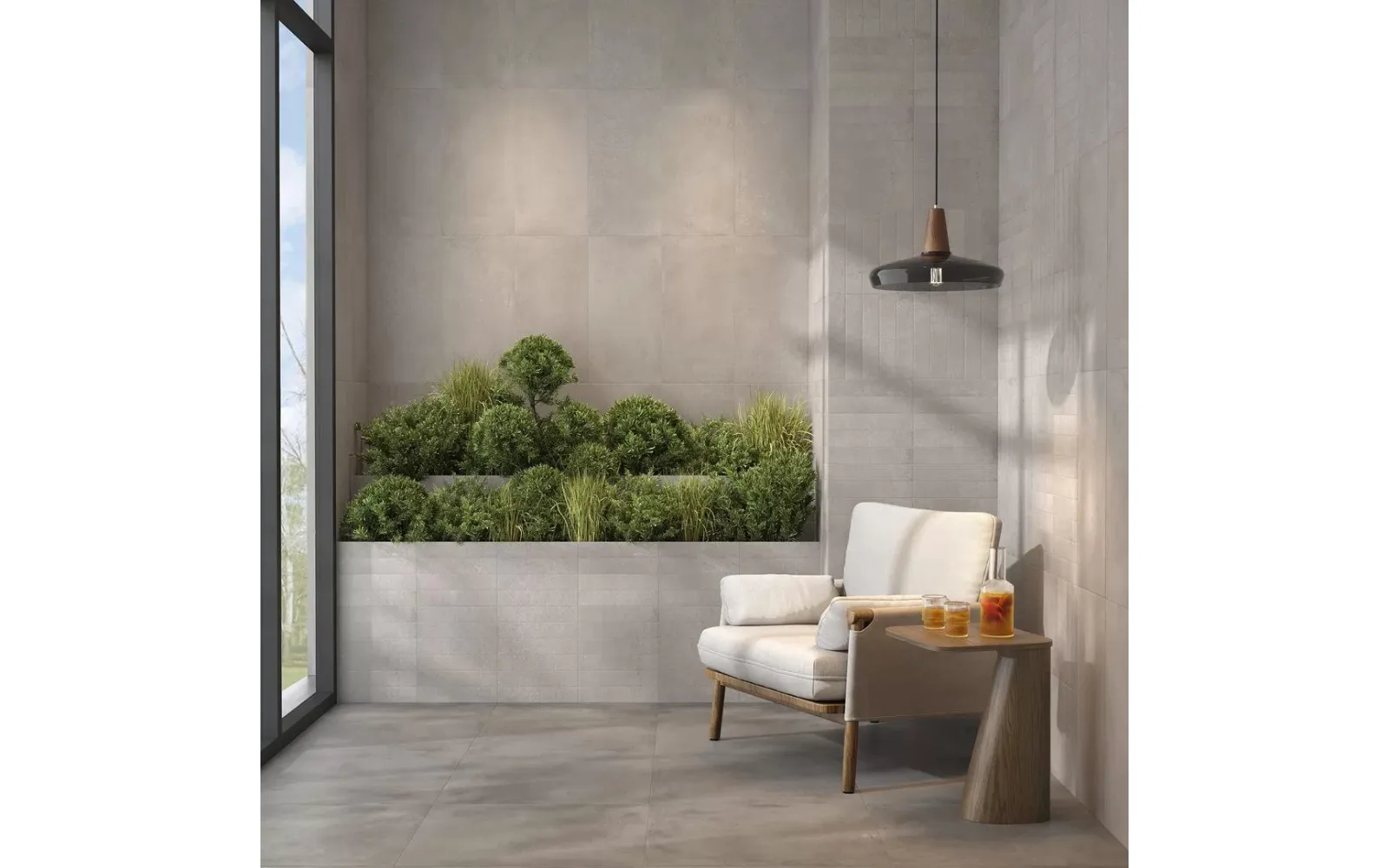 Бетон — поистине универсальный материал, в последнее время активно развивающийся в качестве отделочного решения для частных и общественных интерьеров. Керамогранит и керамическая плитка делают применение бетона более удобным, а само бетонное покрытие значительно более стойким к внешним воздействиям. Особенно практично, когда в одной серии представлены координированные решения для пола и стены.