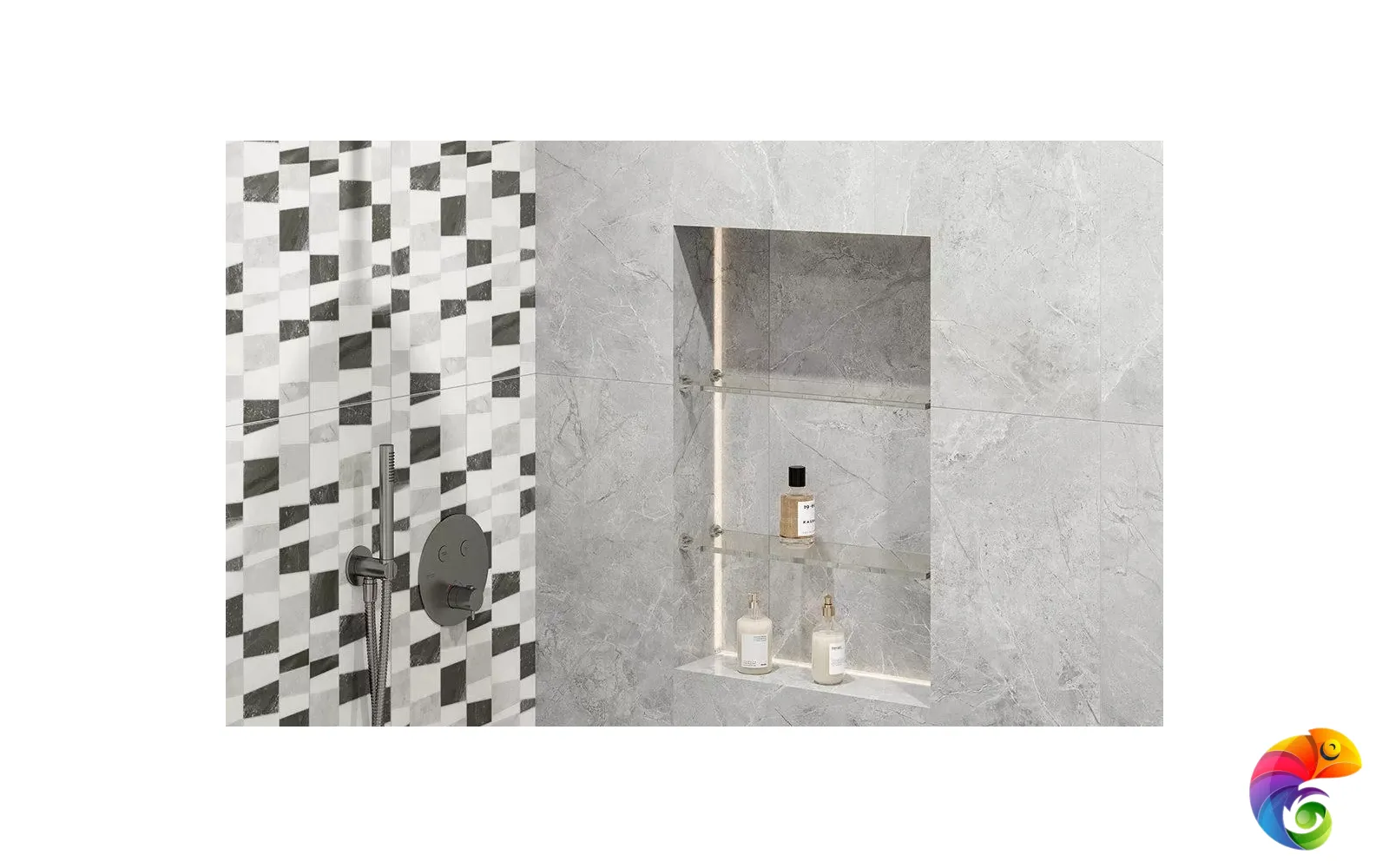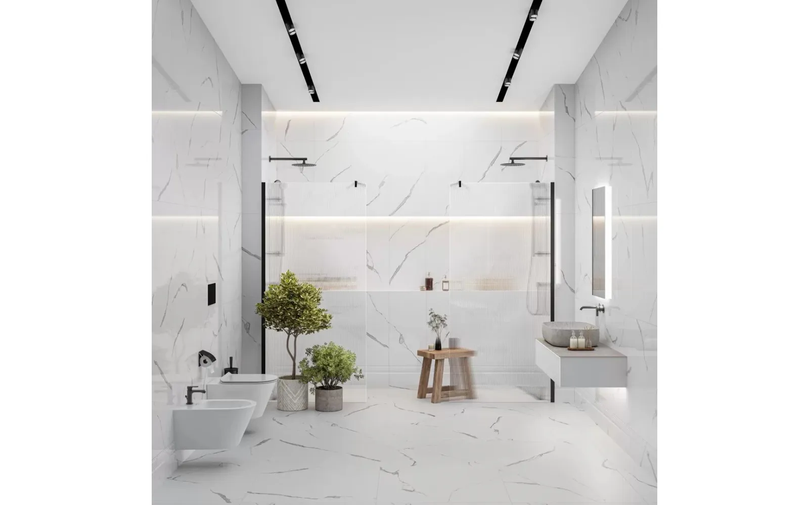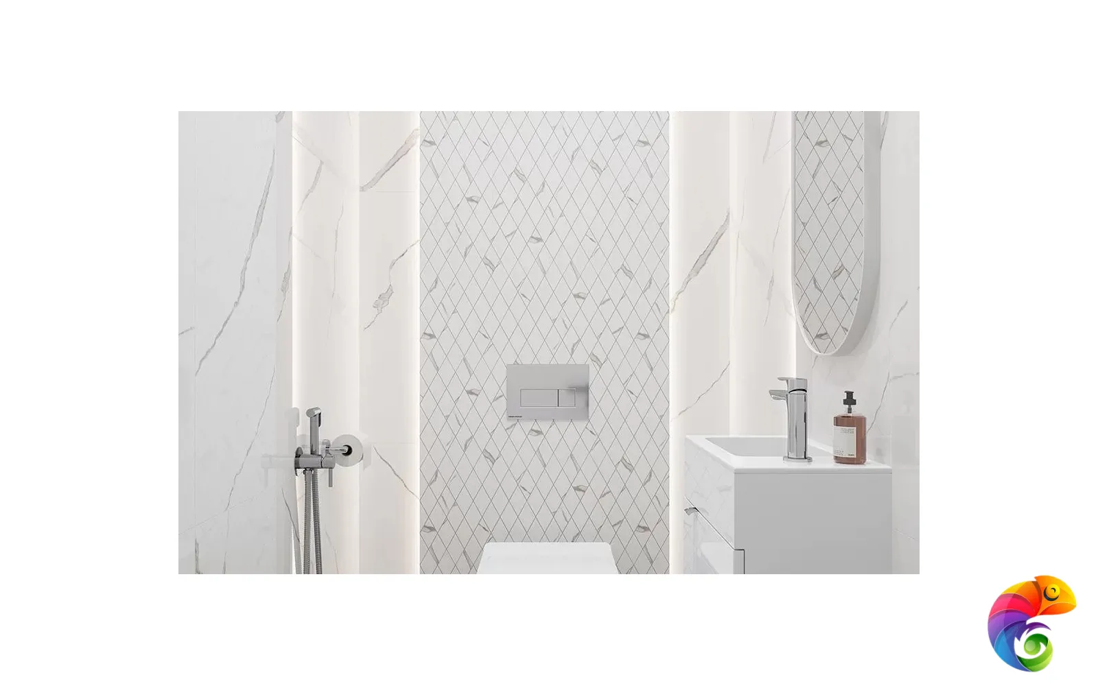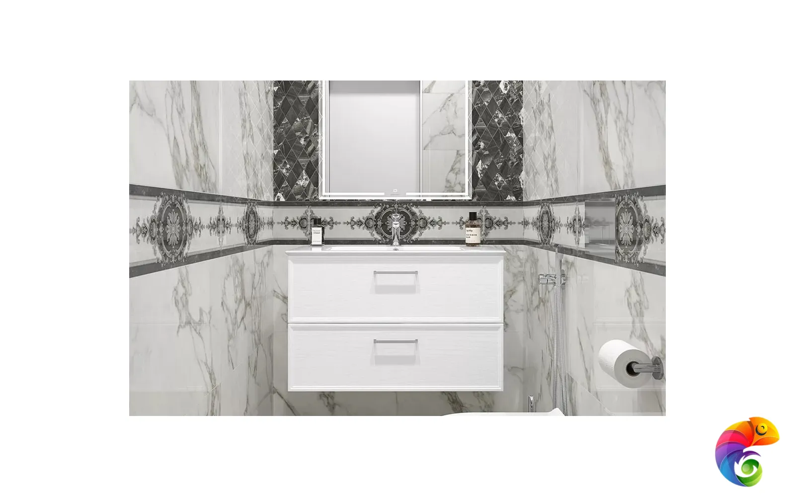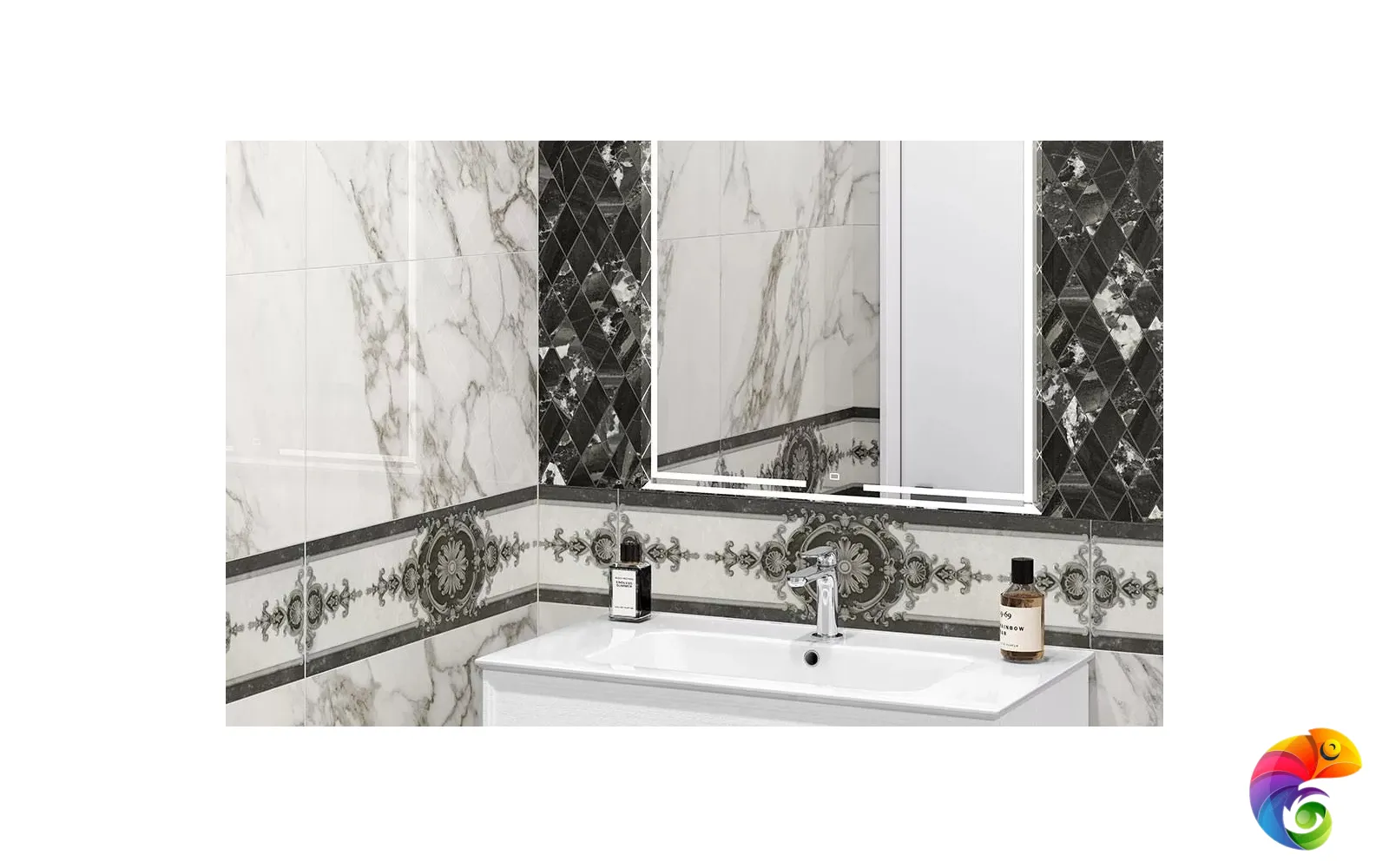 Добавить изысканности и лёгкости «мраморному» интерьеру поможет настенная плитка, а также декоративные элементы: два вида мозаичных декоров и бордюры. В дополнение к керамограниту, плитке и декорам выпускаются также клеёные ступени, подступёнки, плинтусы.
