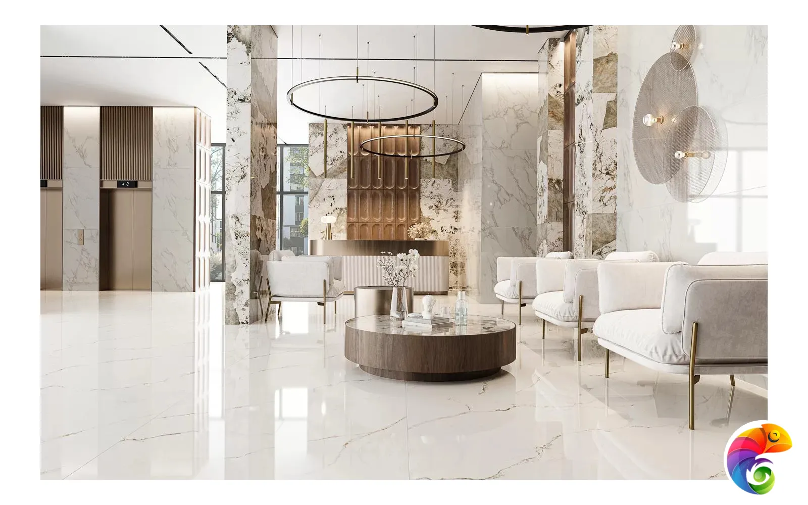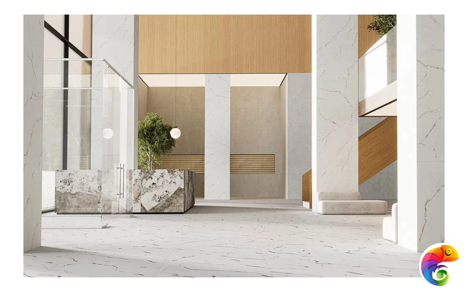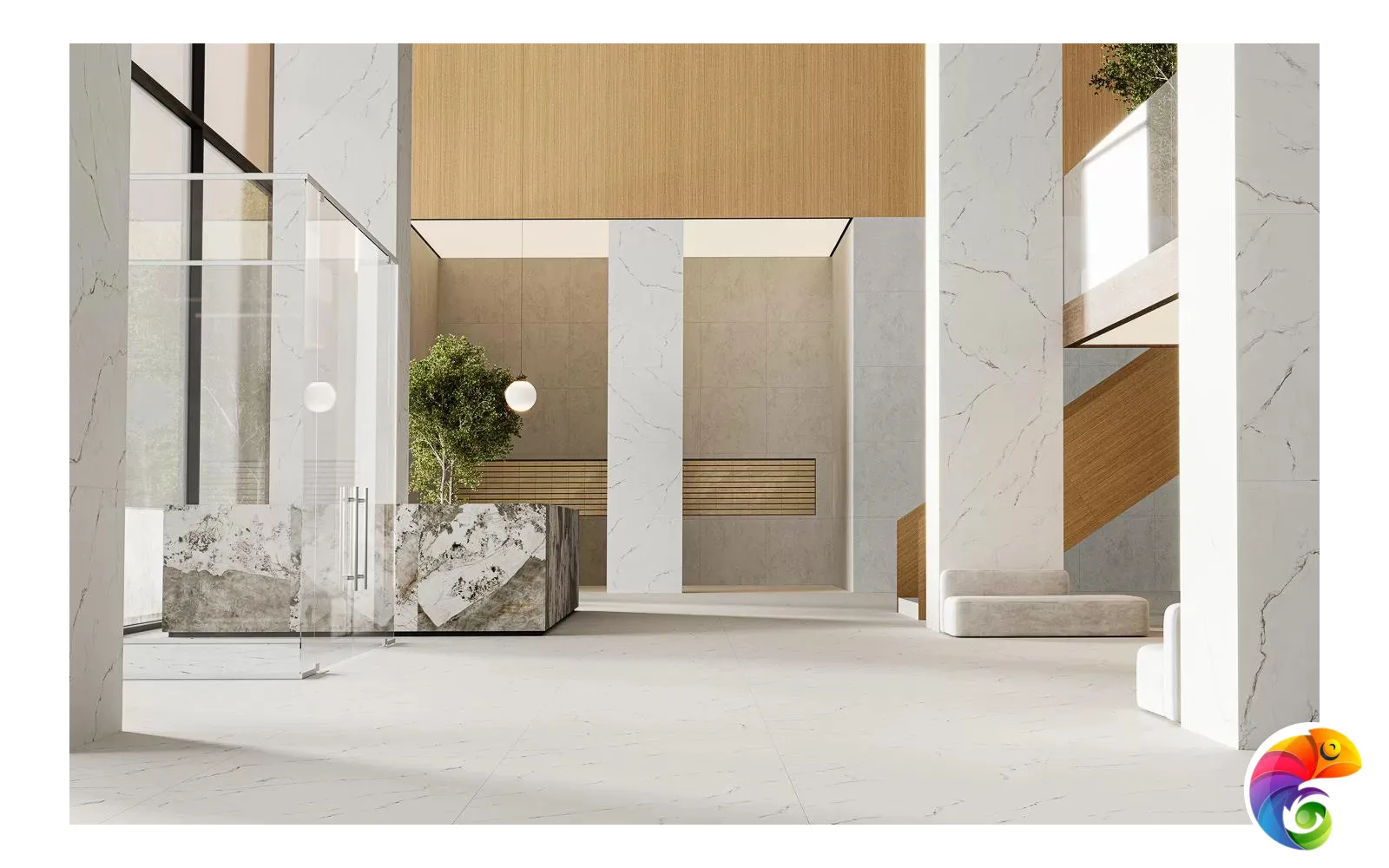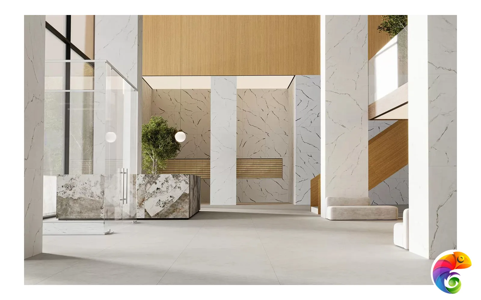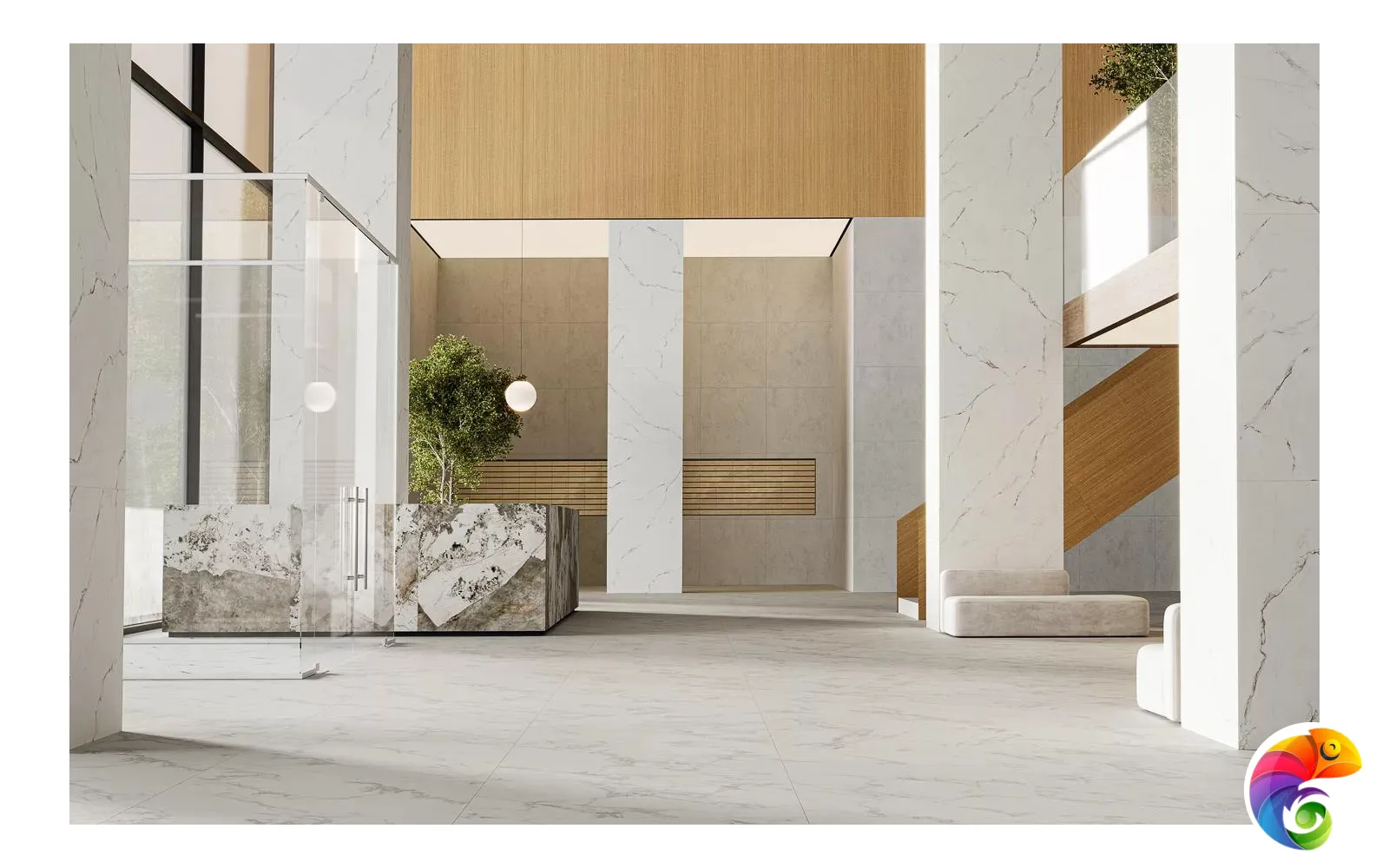 Добавить изысканности и лёгкости «мраморному» интерьеру поможет настенная плитка, а также декоративные элементы: два вида мозаичных декоров и бордюры. В дополнение к керамограниту, плитке и декорам выпускаются также клеёные ступени, подступёнки, плинтусы.