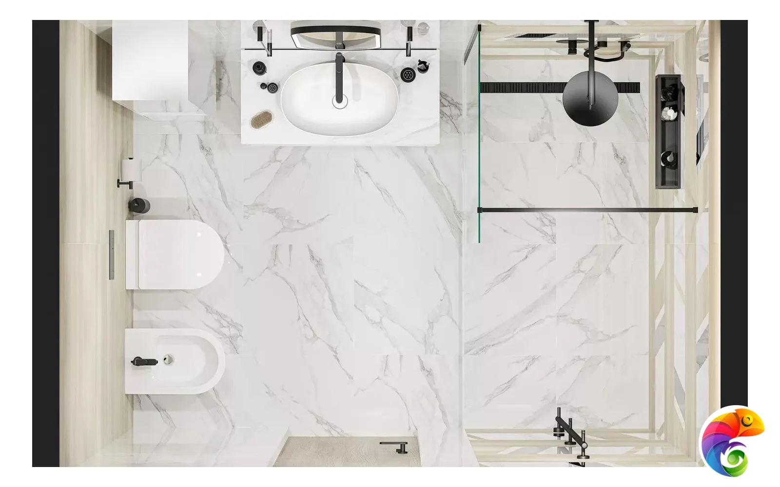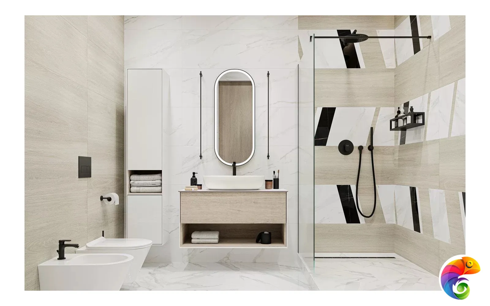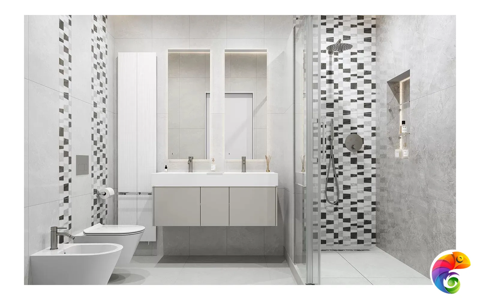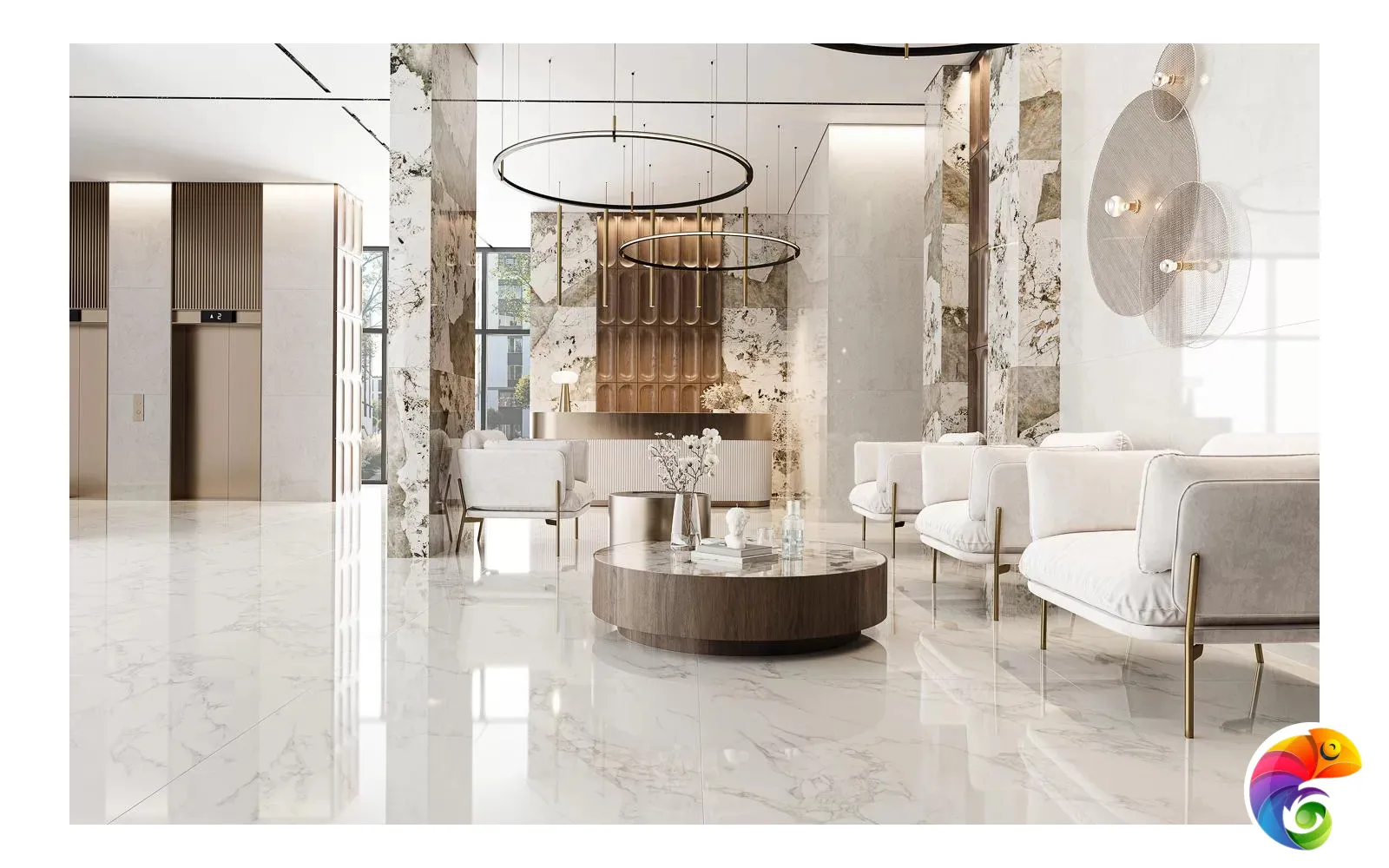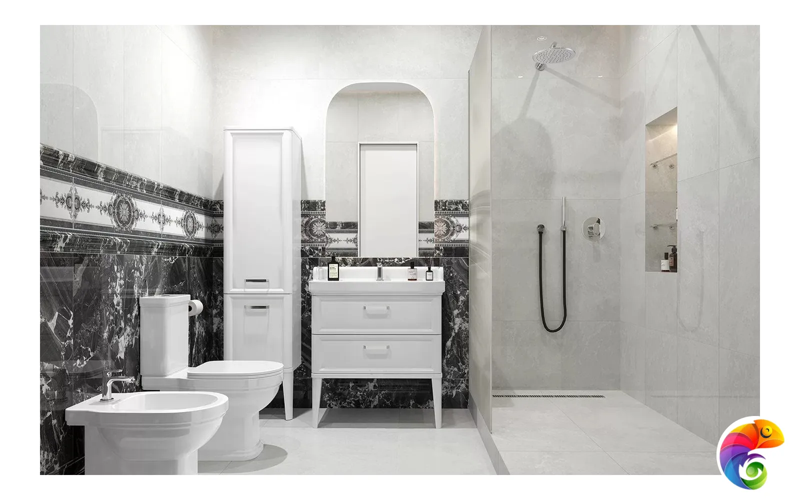 Добавить изысканности и лёгкости «мраморному» интерьеру поможет настенная плитка, а также декоративные элементы: два вида мозаичных декоров и бордюры. В дополнение к керамограниту, плитке и декорам выпускаются также клеёные ступени, подступёнки, плинтусы.
