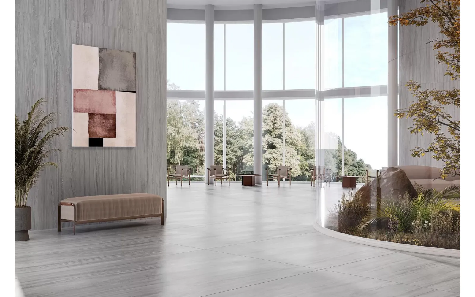 Отличительная черта греческого мрамора «Нестос» — параллельно расположенные полосы белого и серого цветов: они образуют ритмичную структуру, напоминающую светлое дерево. Максимально полно самобытная графика минерала раскрывается на больших бесшовных поверхностях. В отличие от природного материала, одноименный керамический гранит не боится царапин и других механических воздействий.