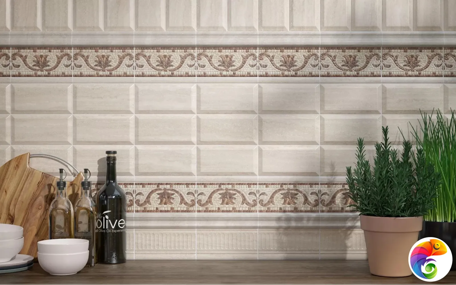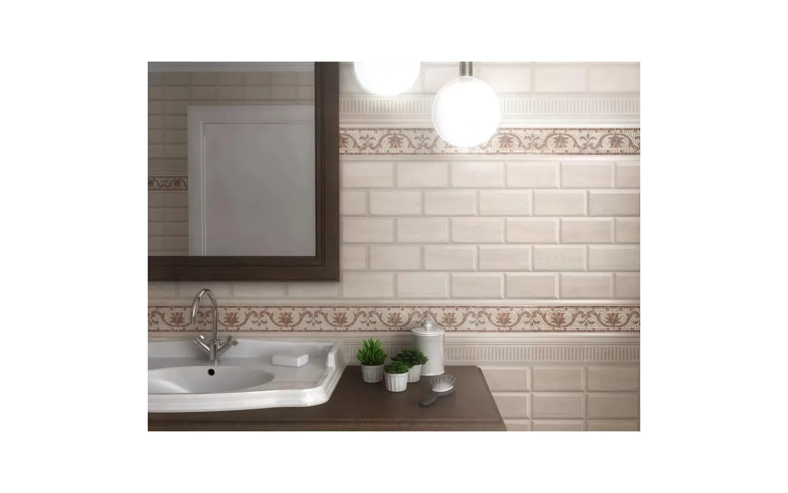 Настенная плитка мини-формата с мягкой гранью воспроизводит текстуру травертина. Такой дизайн смотрятся особенно интересно в сочетании со структурированными бордюрами и орнаментальными декорами, выполненными с эффектом художественной мозаики.