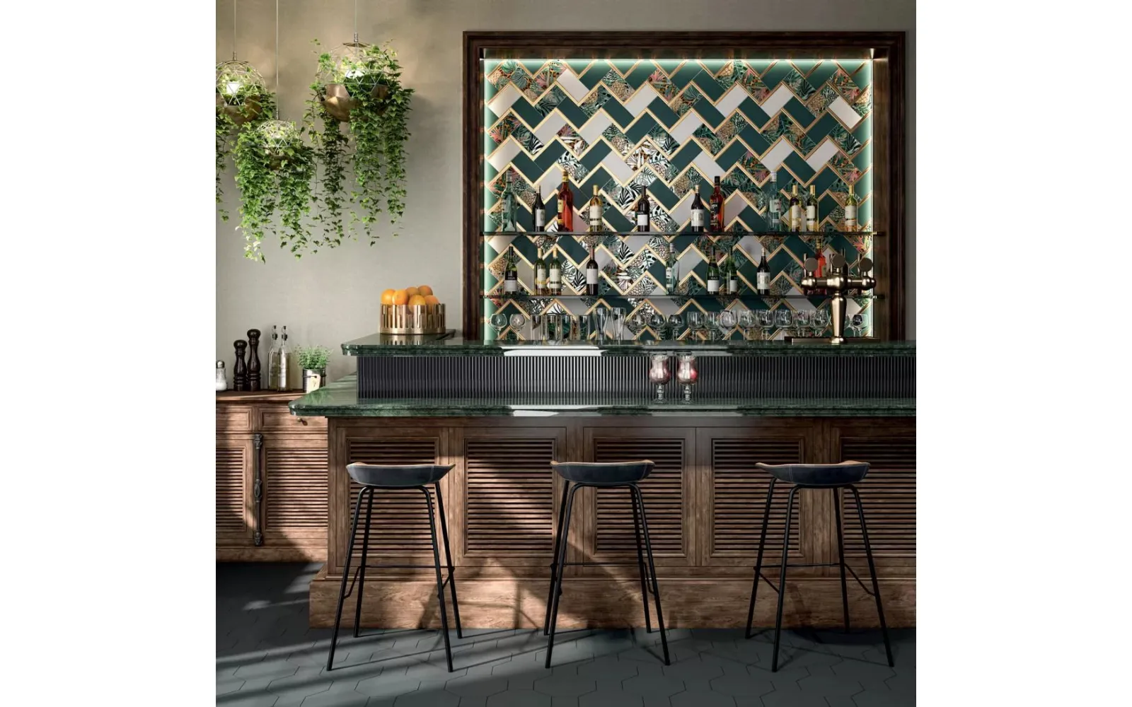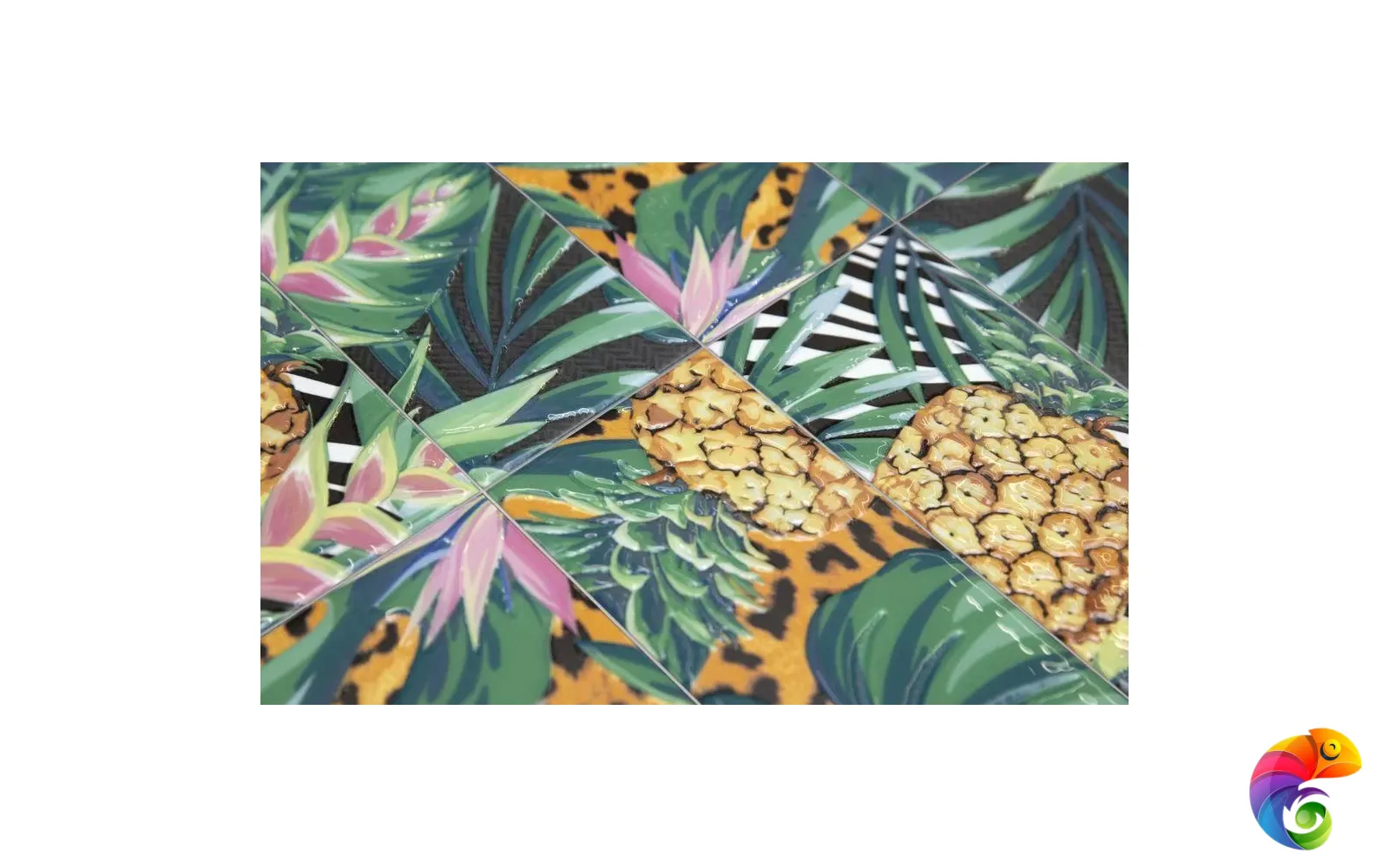 Часть ботанического разнообразия, характерного для южных португальских островов, перенесена на декоры «Пальмейра». Объединенные общим тропическим дизайном, пять декоративных элементов выполнены с индивидуальной графикой, создающей на стене ощущение современной эклектики — в горизонтальном или вертикальном расположении. Часть рисунка декоров покрыта блестящим составом, который смотрится эффектно на фоне матовой плитки.