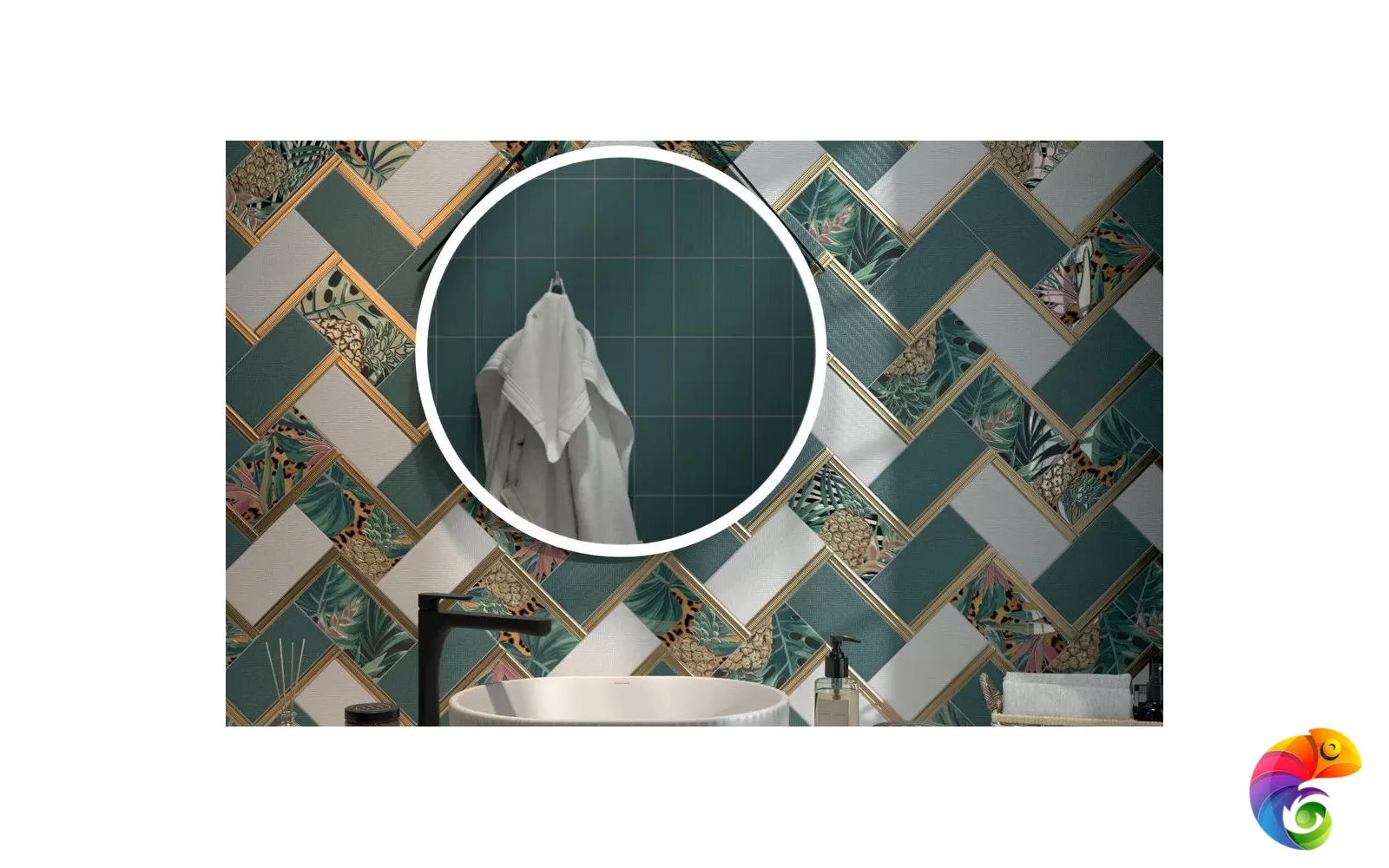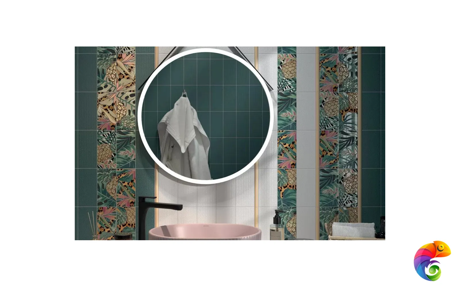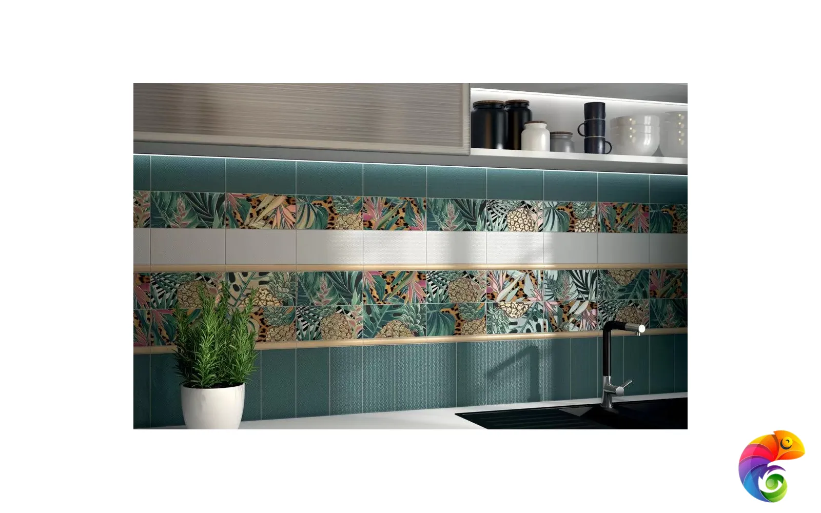 Яркий дизайн и удобный формат плитки 10×20 см прекрасно подойдут для отделки разных помещений, в том числе кухни и ванной комнаты. Удачными можно считать сочетания плитки с накладными раковинами в цвете мальва или в песочном цвете, плетёными ковриками и корзинами из джута, плетёной мебелью и аксессуарами природной тематики. Спокойный зелёный оттенок фоновой плитки вносит в обстановку гармонию и умиротворение.