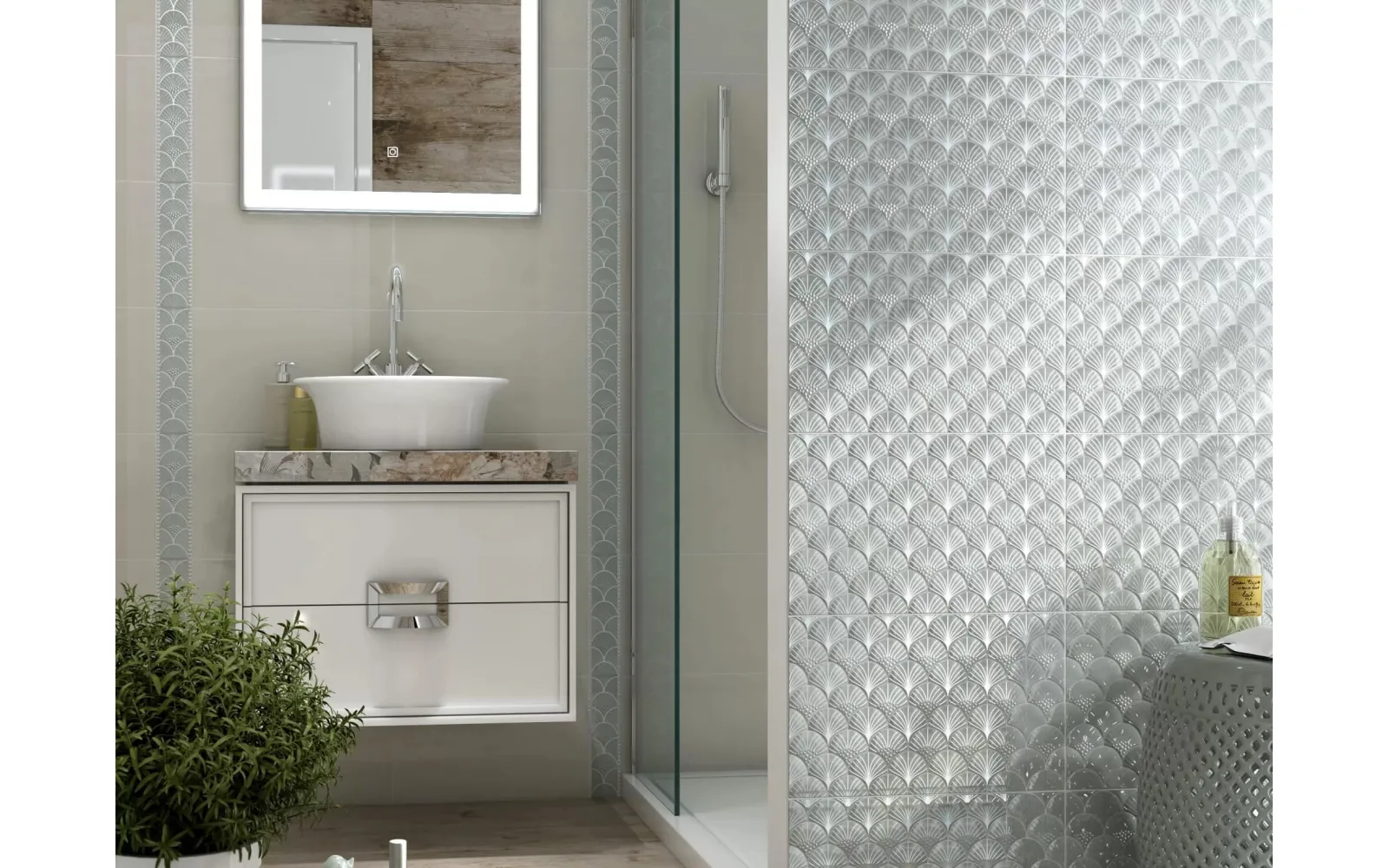 За основу серии взяты три прохладных оттенка оникса, выполненные в двух видах структуры – гладкой и рельефной, напоминающей черепицу. Объемные декоры, украшенные россыпью перламутровых «капель», походят на листья кувшинок или чешую диковинной рыбы. Такие же капли можно заметить и на поверхности нарезной мозаики.
