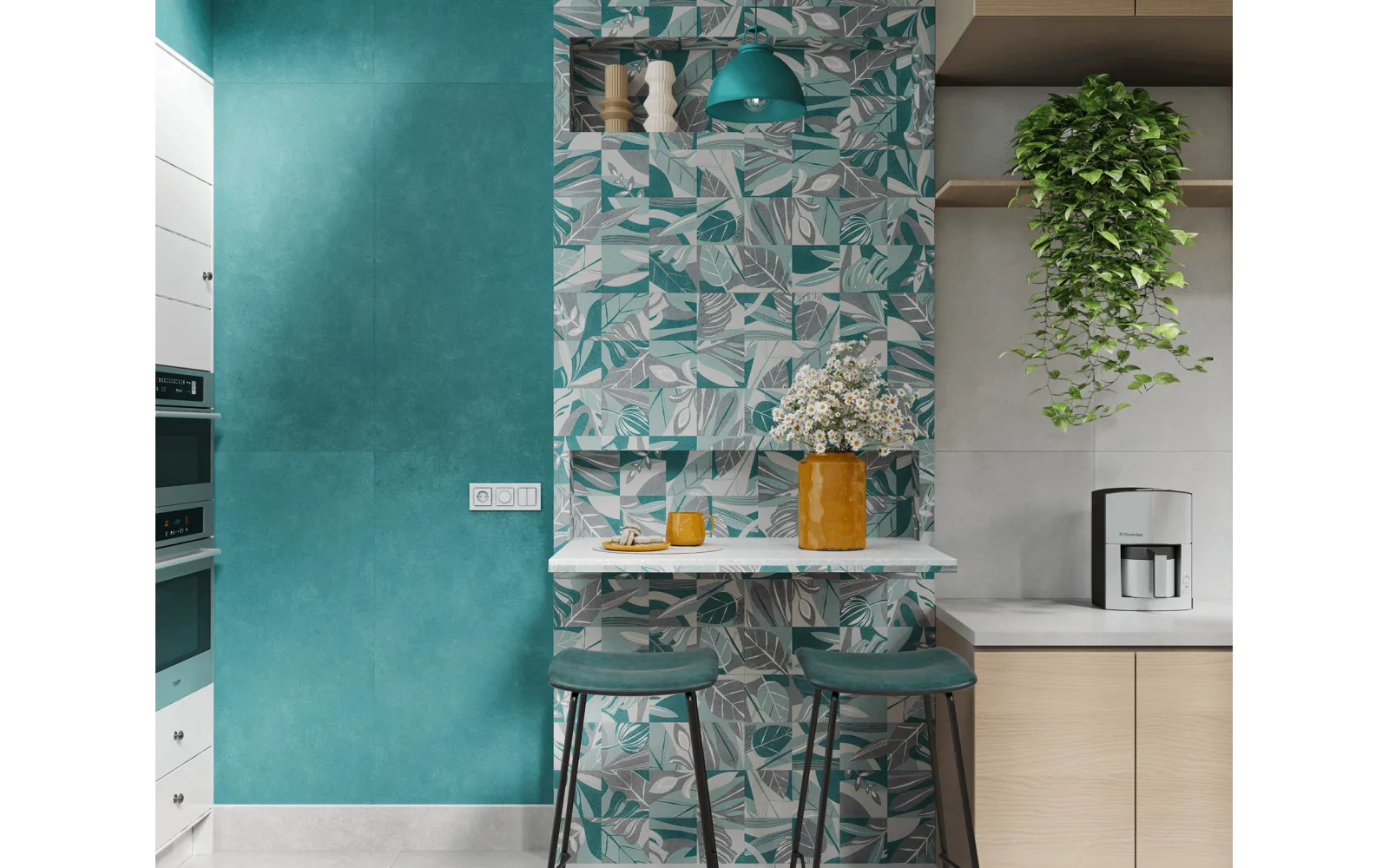 Sketch - Скетч в переводе означает "набросок". Вся коллекция выполнена в легком графичном стиле, ведущий оттенок - цвет 2026 года "трансформирующий бирюзовый". Коллекция предлагает как акцентные яркие декоры, так и базовые поддерживающие пастельные цвета для облицовки средних и крупных пространств