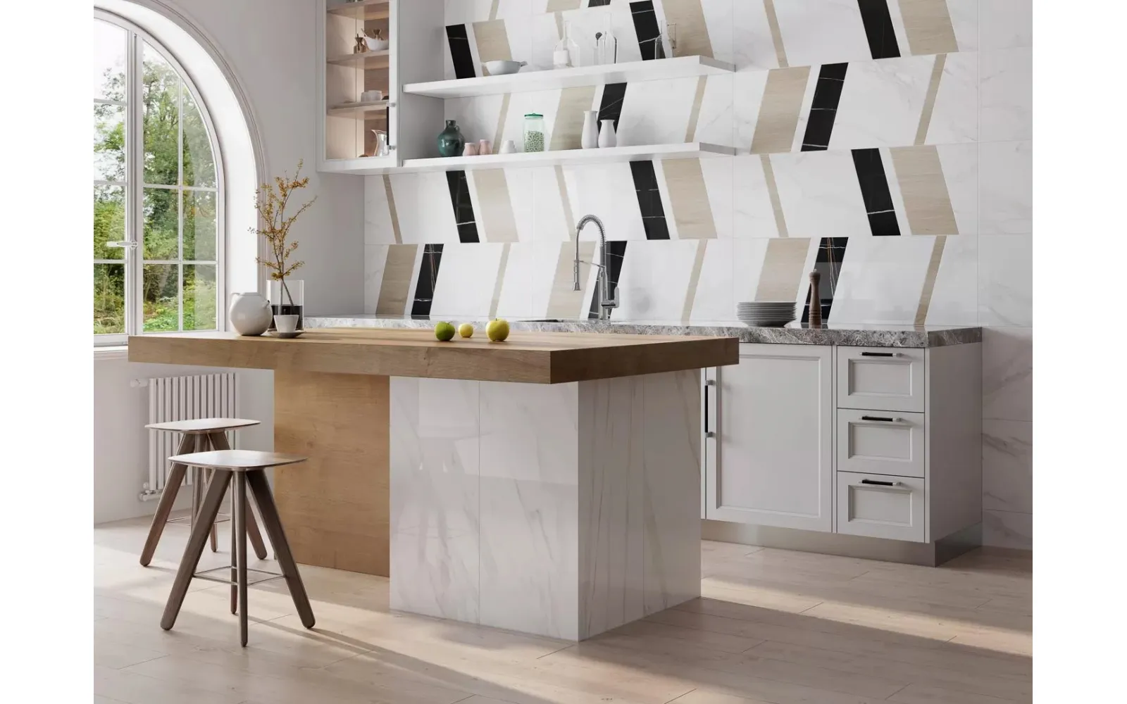 Керамическую плитку 40×120 см с наборными декором, расположенным под наклоном, словно корешки книг, можно использовать на уровне навесных полок. Идея интересна для воплощения в гостиной или прихожей. Особым шармом станет совпадение угла наклона декоров с углом наклона мебельных ножек тумб, стульев и кресел, характерной особенности мебели в стиле mid-century modern. Но если в санузле стоит такая тумба или имеется отдельно стоящая ванна на ножках, то и там будет уместна плитка с наборным декором. В качестве основной отделки рекомендуется керамическая плитка под мрамор или плитка под дерево из этой же серии.